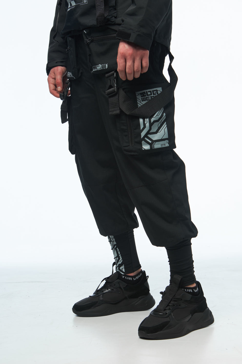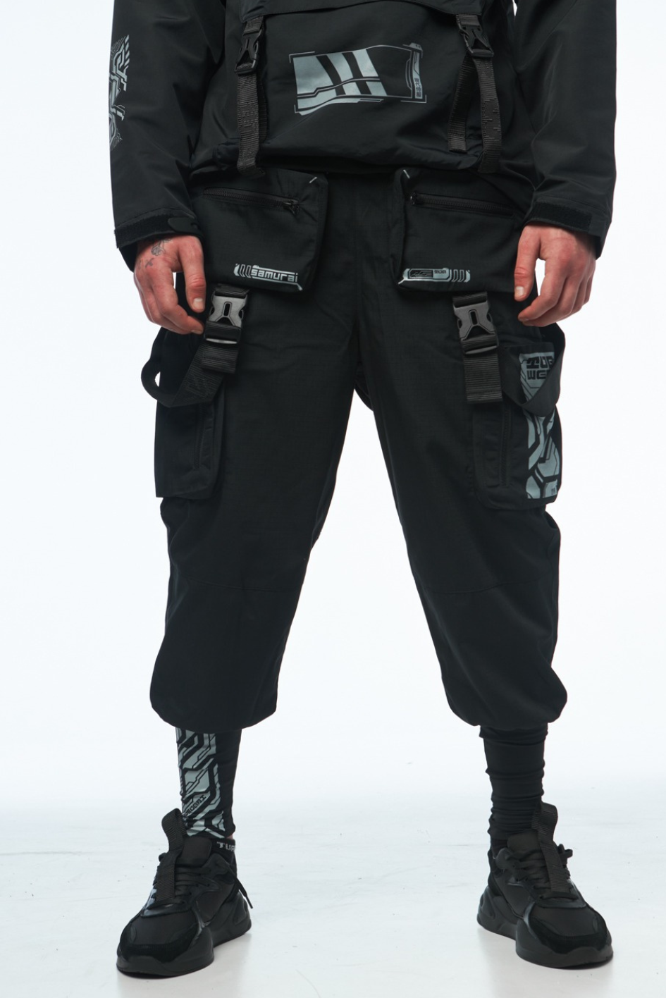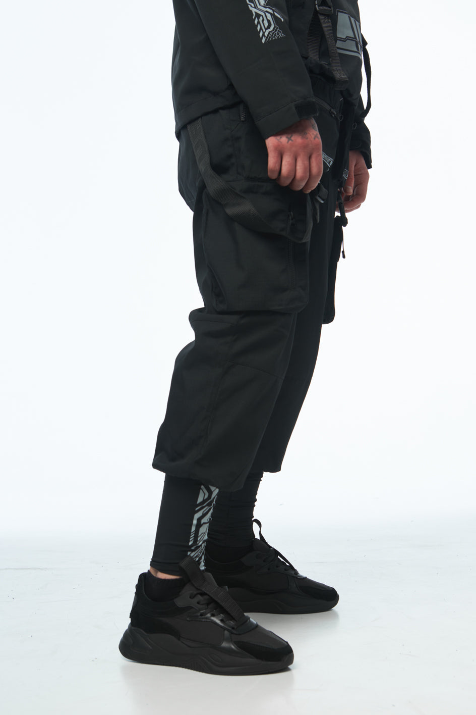 Locker geschnittene Hose. Ausgestattet mit 8 Taschen: Seitentaschen, zwei große Fronttaschen, seitliche Taschen mit Reißverschluss (alle Taschen mit Reißverschluss) sowie zwei Gesäßtaschen mit Klappe. Fünf weiße Prints auf den Taschen und am Bündchen. Hosenbeinabschluss mit Biflex-Bündchen. Bund mit Gummizug und Kordel. Dekorative 4 cm breite Bänder, deren Länge verstellbar ist.