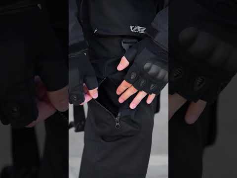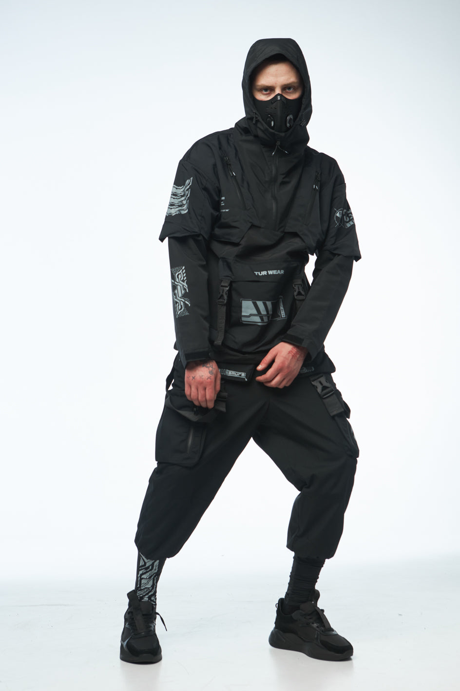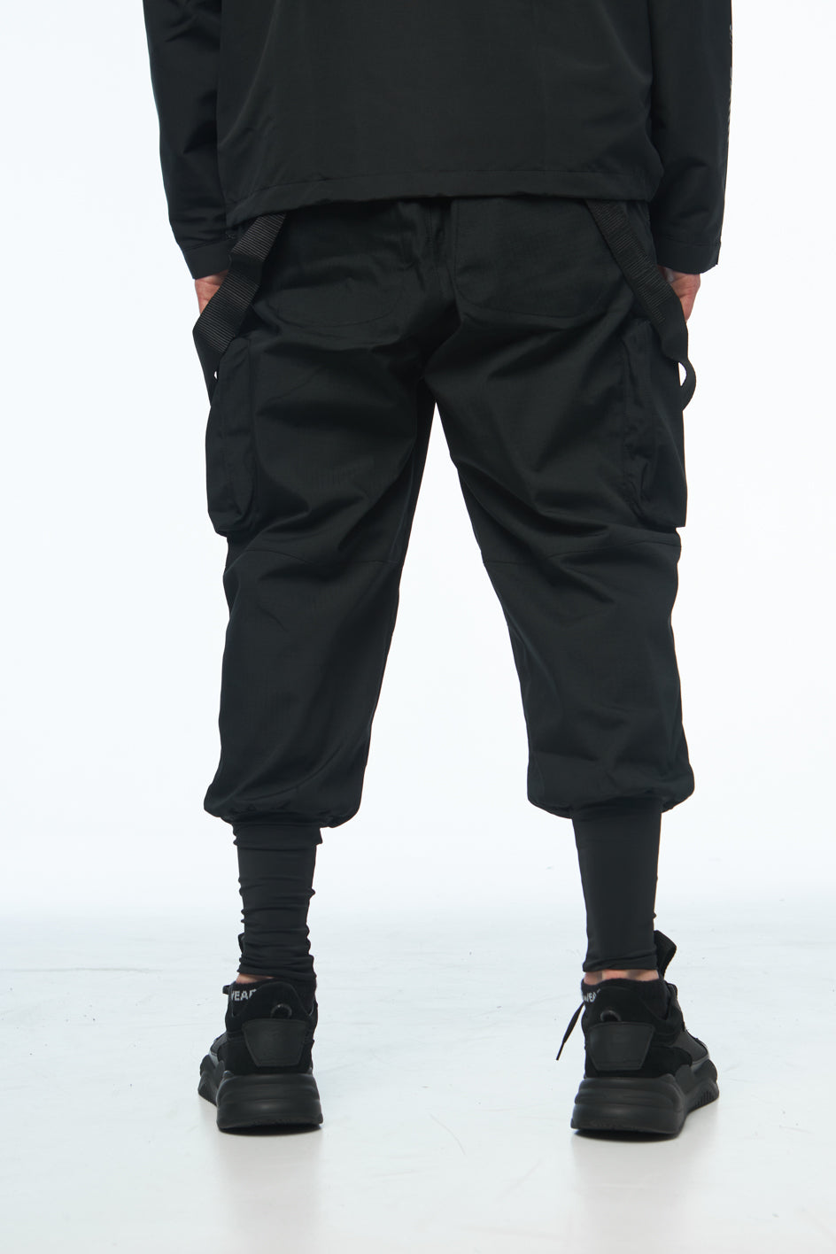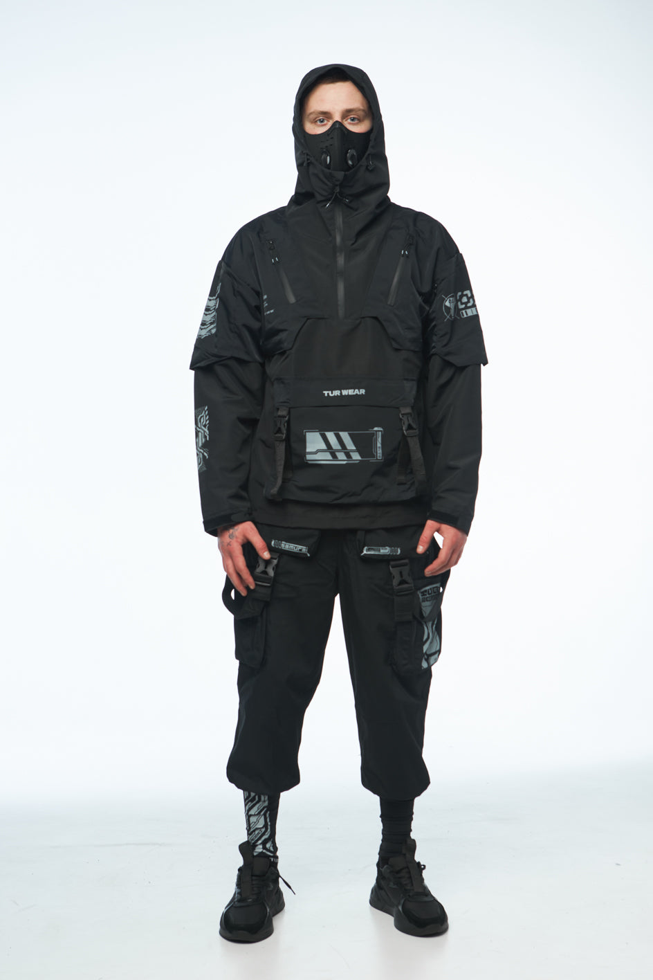 Locker geschnittene Hose. Ausgestattet mit 8 Taschen: Seitentaschen, zwei große Fronttaschen, seitliche Taschen mit Reißverschluss (alle Taschen mit Reißverschluss) sowie zwei Gesäßtaschen mit Klappe. Fünf weiße Prints auf den Taschen und am Bündchen. Hosenbeinabschluss mit Biflex-Bündchen. Bund mit Gummizug und Kordel. Dekorative 4 cm breite Bänder, deren Länge verstellbar ist.