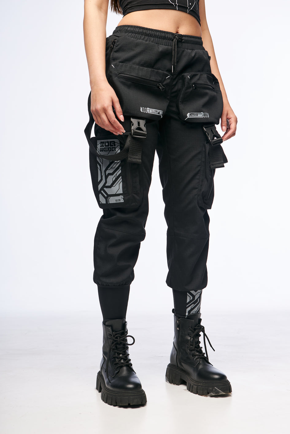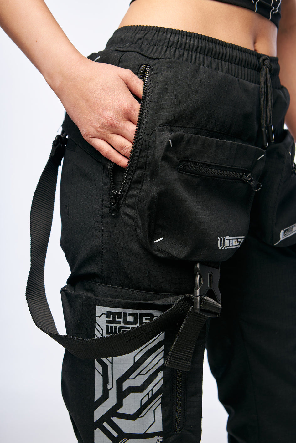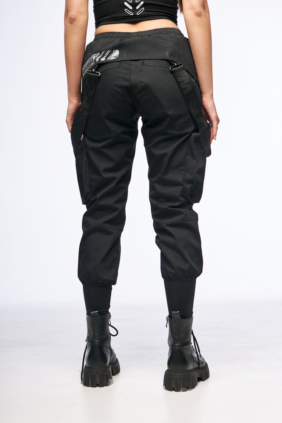 Locker geschnittene Hose mit acht Taschen. Bund mit Gummizug und Kordel. Dekorative Bänder. Länge der Träger verstellbar.