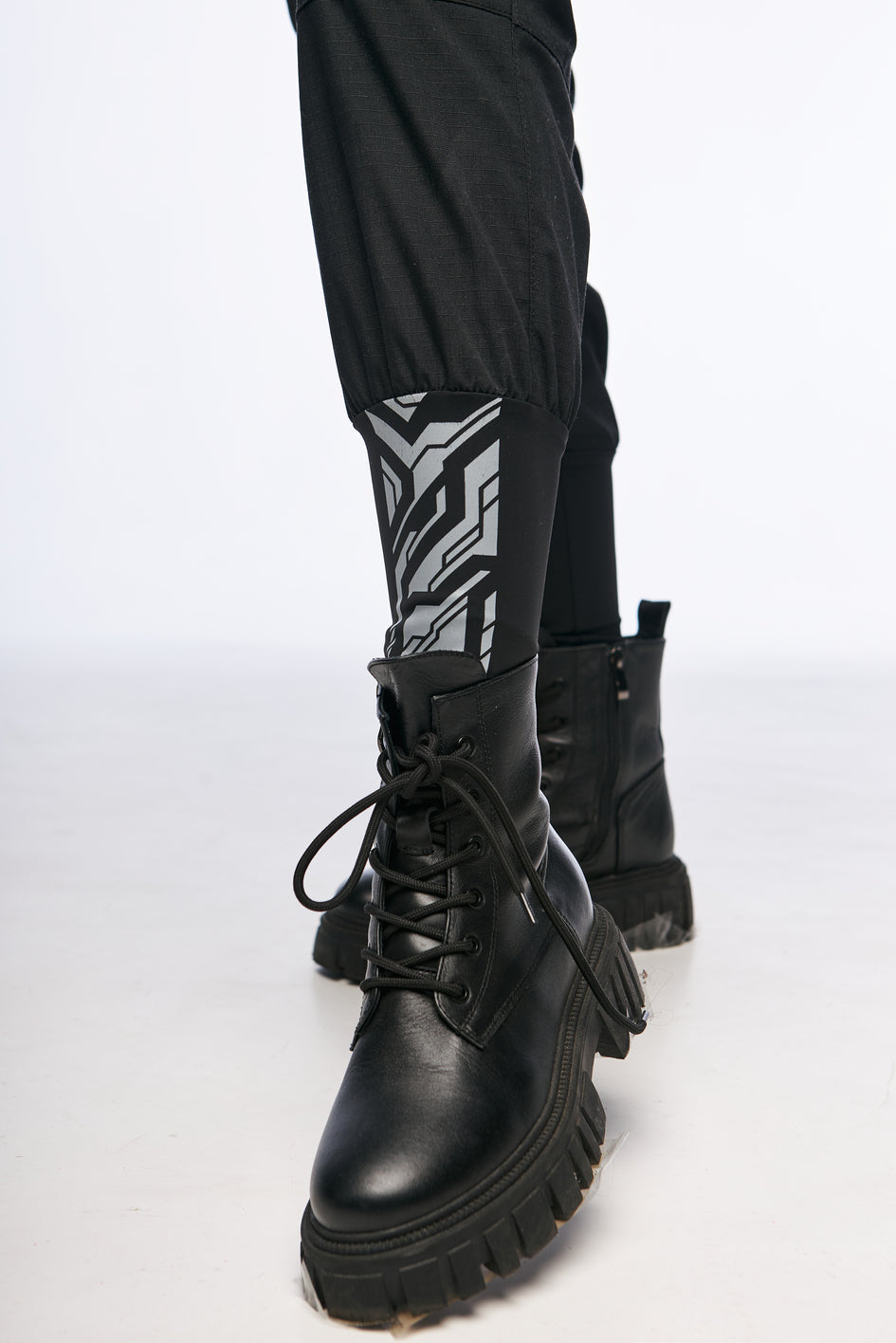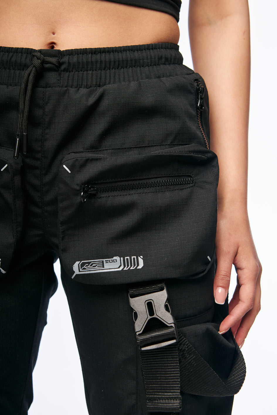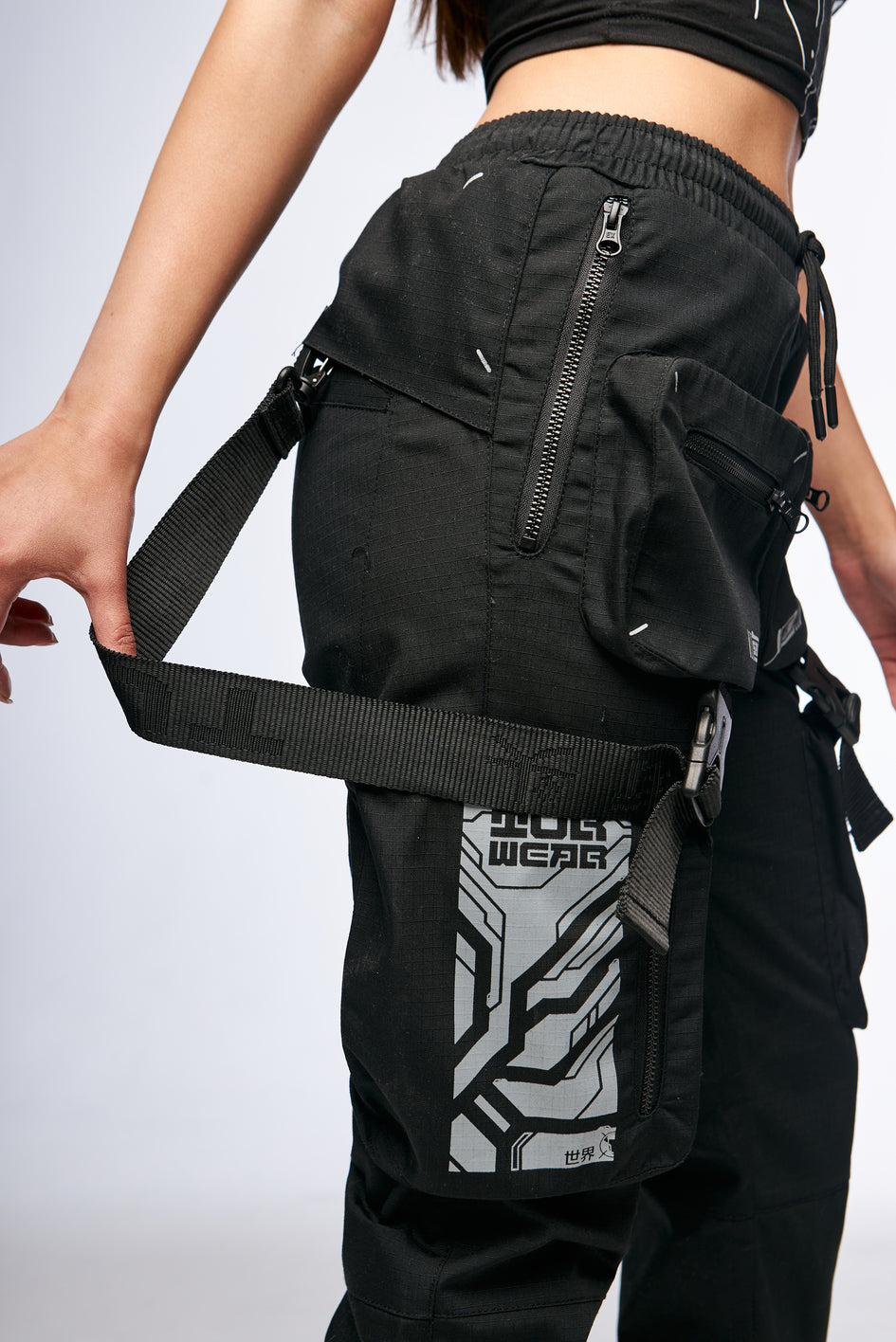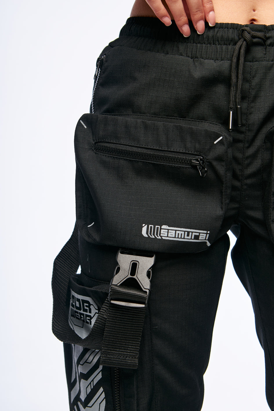Locker geschnittene Hose mit acht Taschen. Bund mit Gummizug und Kordel. Dekorative Bänder. Länge der Träger verstellbar.
