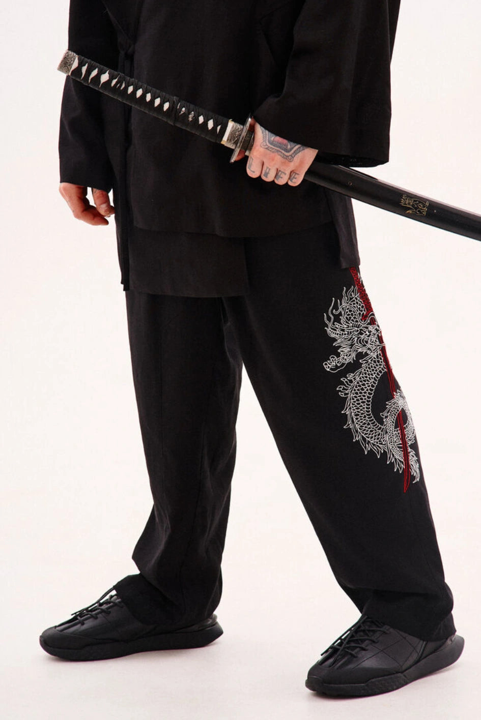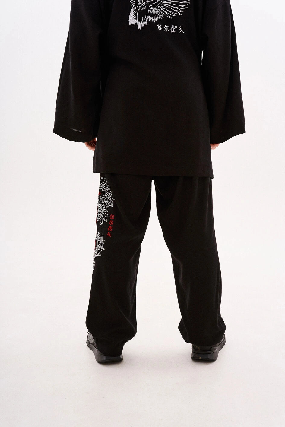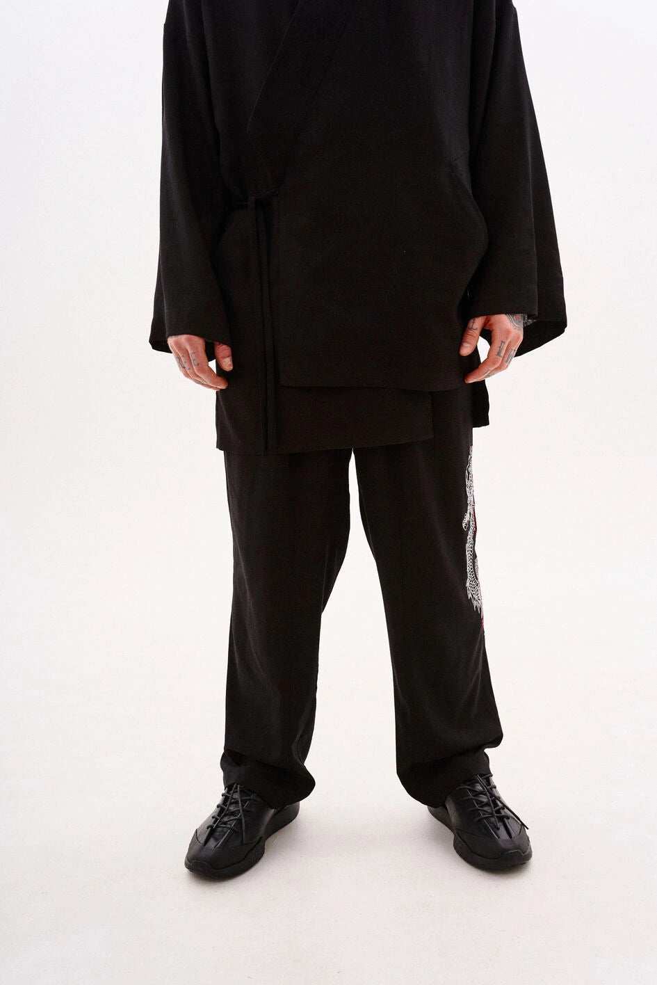 Weite Hose aus Leinen mit verstellbarem Kordelzug und Gummibund. Japanischer Print auf dem linken Hosenbein. Zwei schräge Eingrifftaschen oben, Vordertaschen mit Kordelzug und eine Gesäßtasche. Ideal kombinierbar mit dem Haruki-Kimono oder oversized T-Shirts.