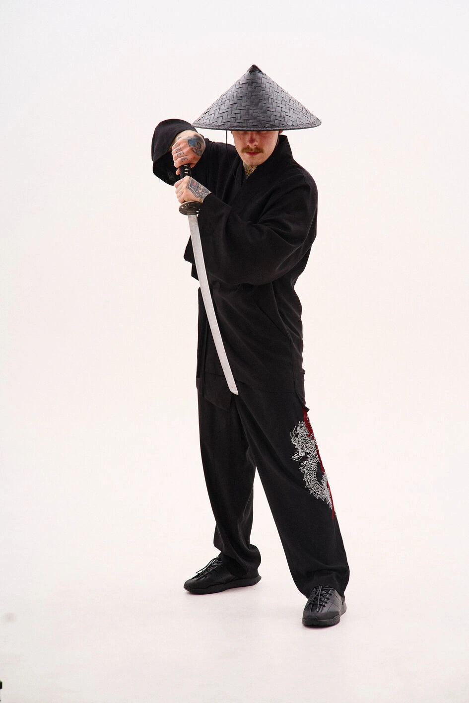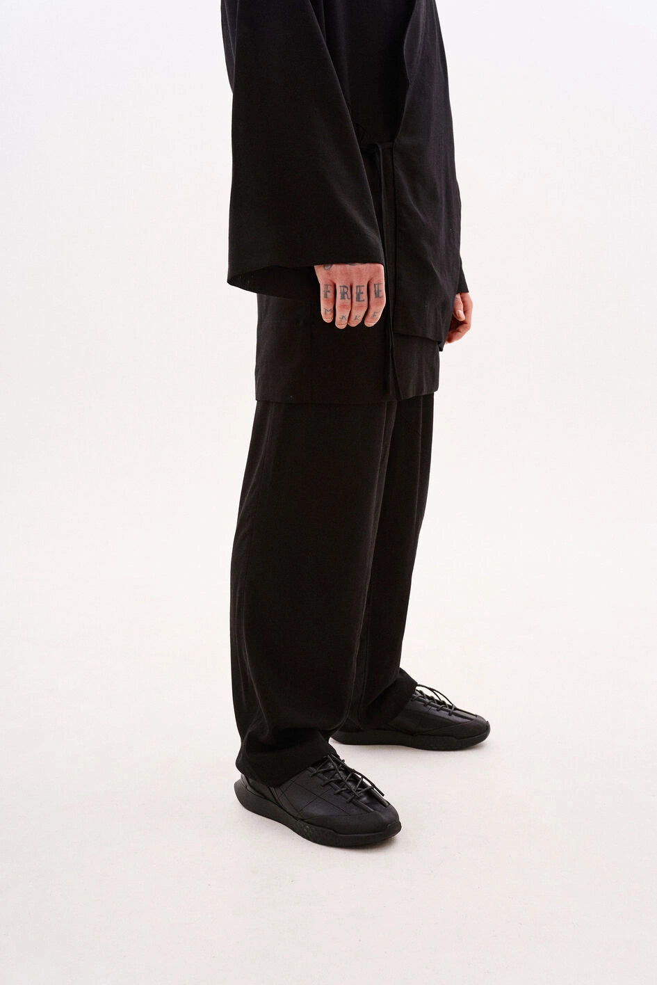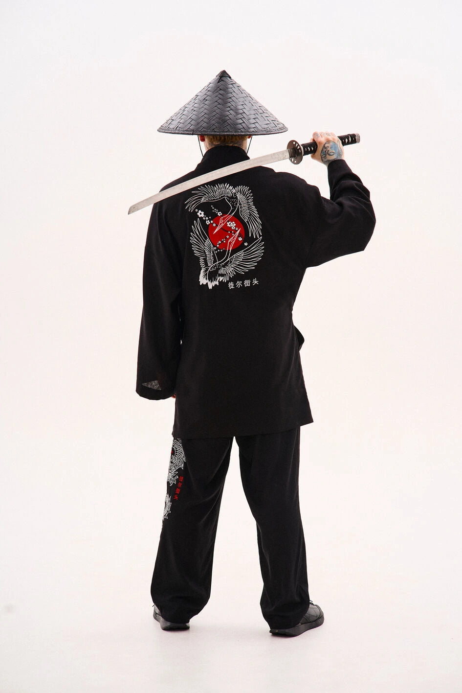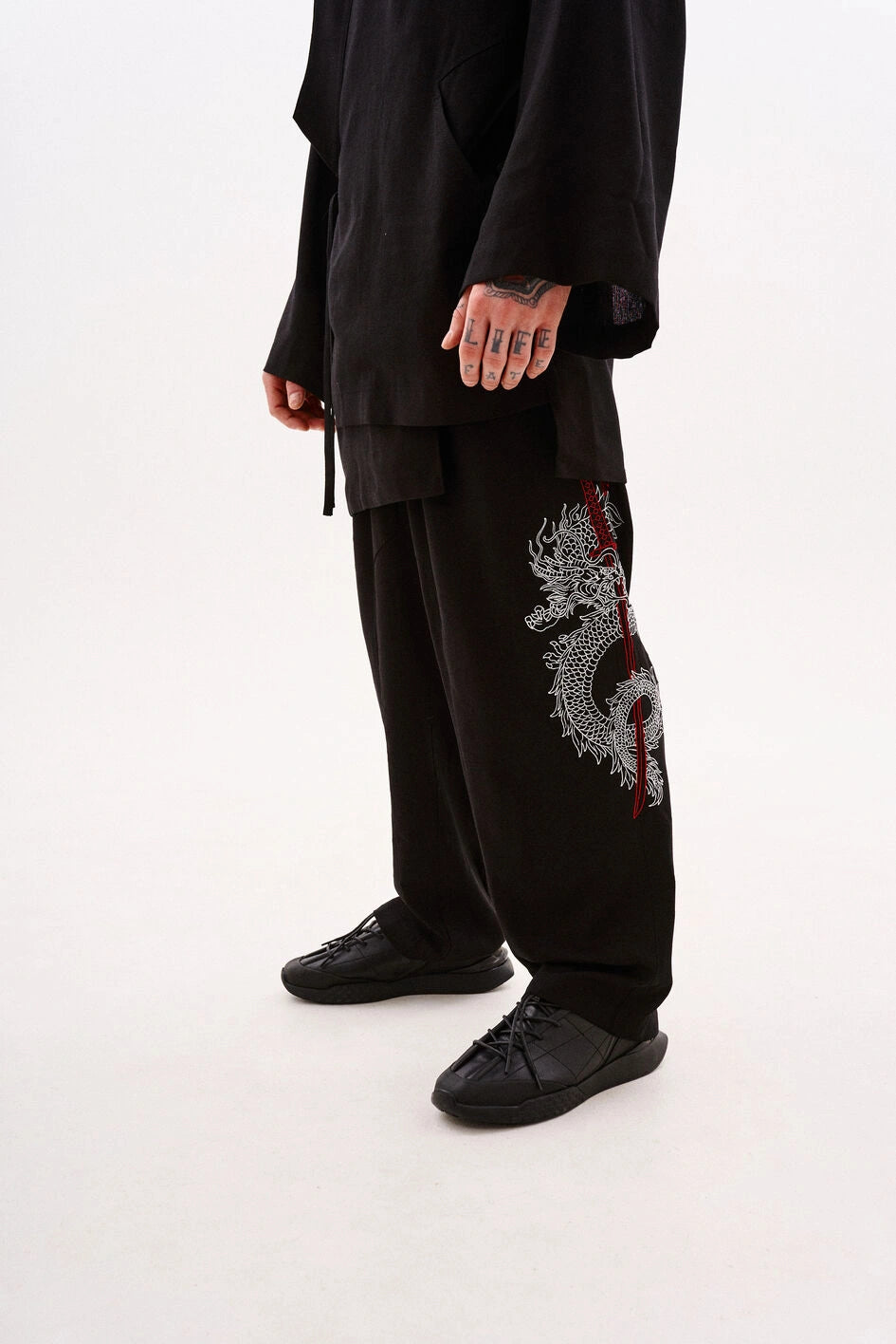 Weite Hose aus Leinen mit verstellbarem Kordelzug und Gummibund. Japanischer Print auf dem linken Hosenbein. Zwei schräge Eingrifftaschen oben, Vordertaschen mit Kordelzug und eine Gesäßtasche. Ideal kombinierbar mit dem Haruki-Kimono oder oversized T-Shirts.