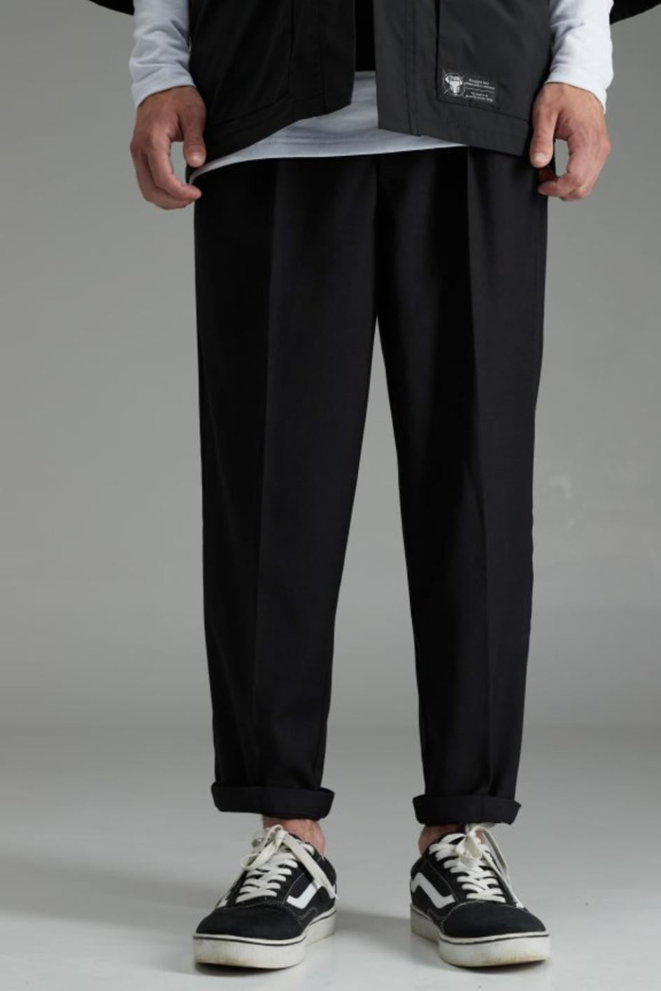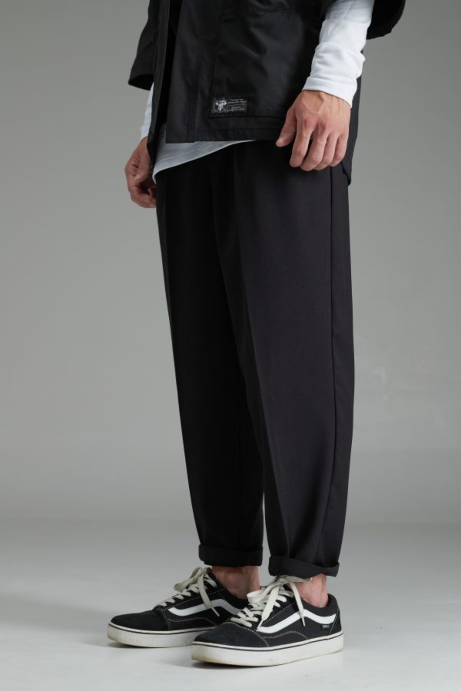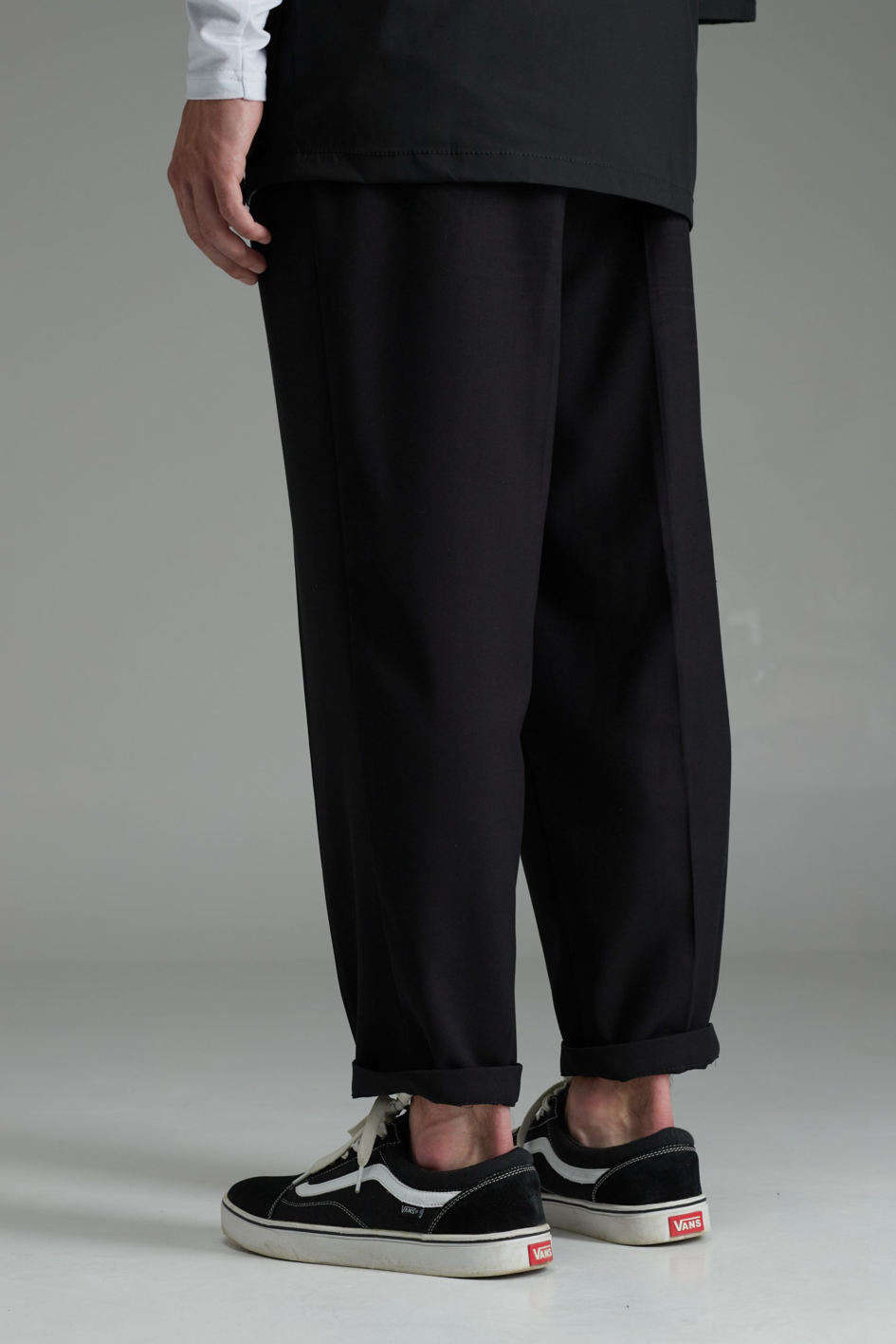 Lockere Hose mit niedrigem Bund. Gürtel mit Hosenträgern. Zwei seitliche Innentaschen.