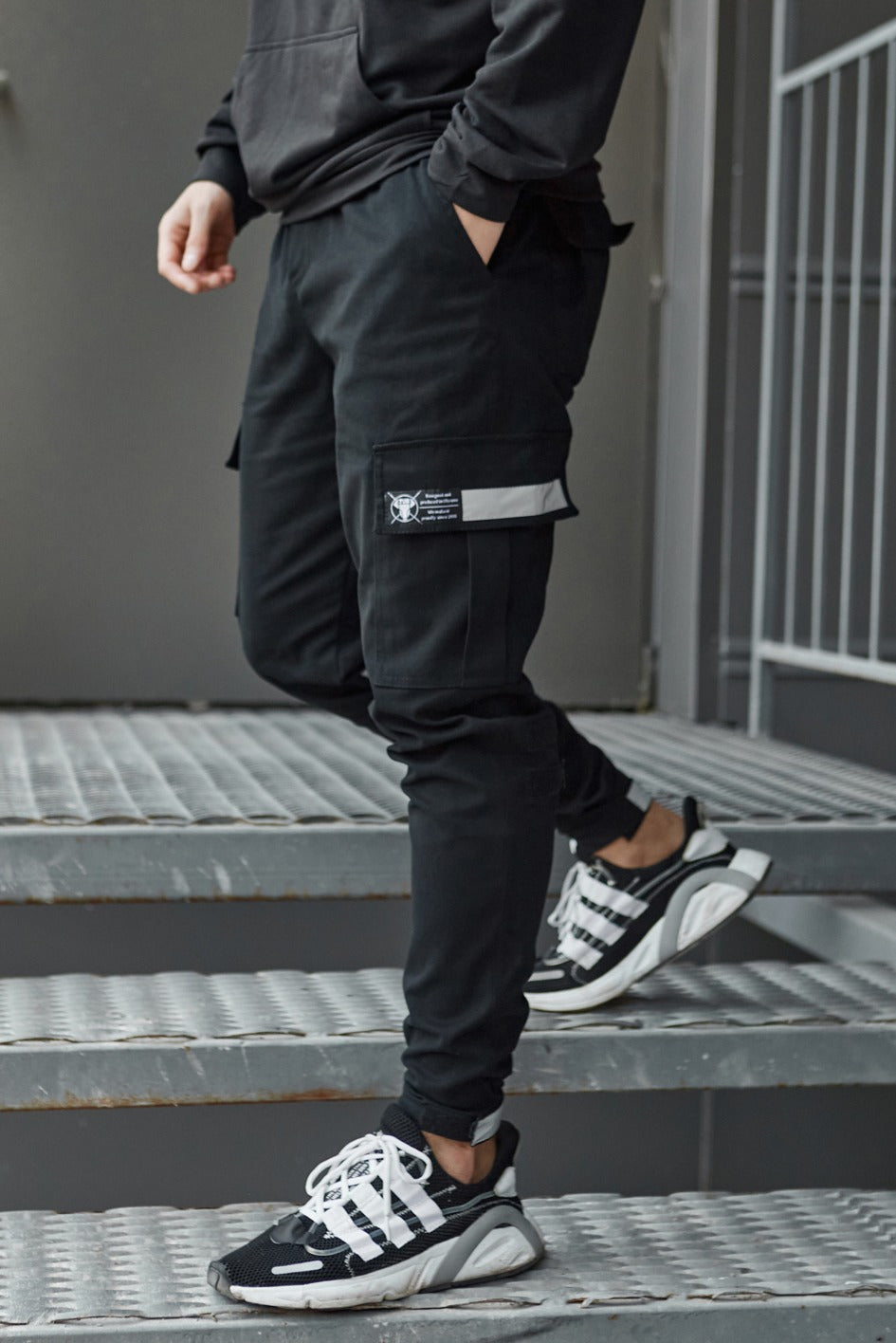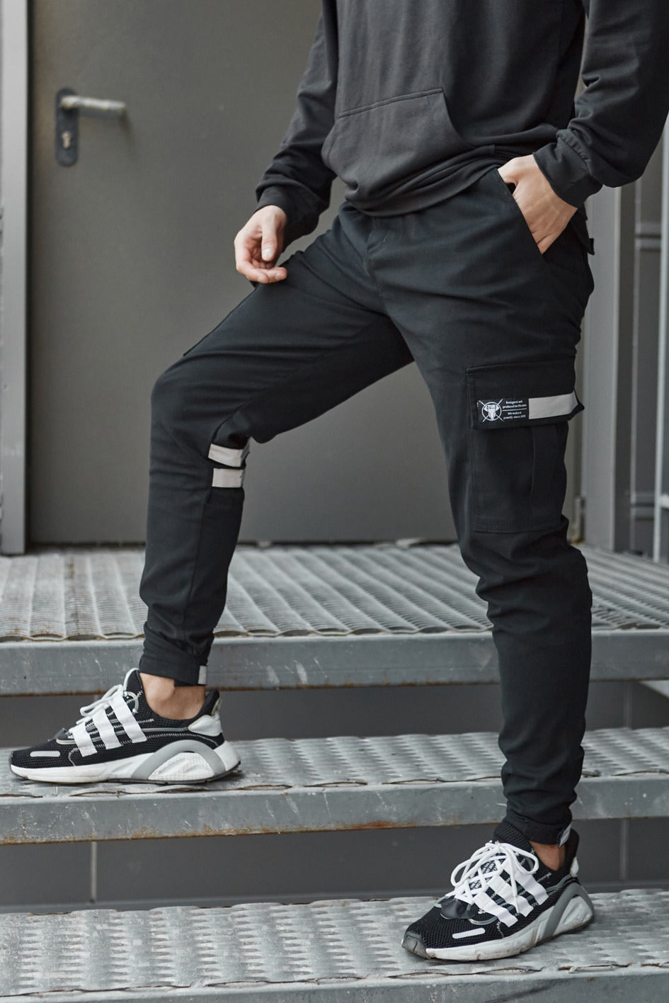 Klassische Hosen, nach unten hin schmal zulaufend. Bund mit Gummizug und Kordel zur Regulierung. Die Beinweite kann im Kniebereich sowie am unteren Ende mithilfe von Klettverschlüssen mit Reflektoren angepasst werden. Insgesamt sechs Taschen: zwei seitliche aufgesetzte Taschen mit Klappen und Klettverschluss, zwei aufgesetzte Gesäßtaschen sowie zwei Innentaschen.