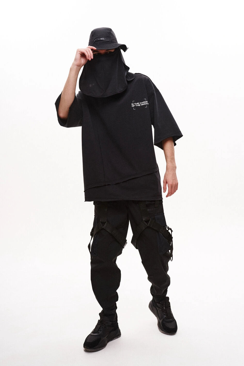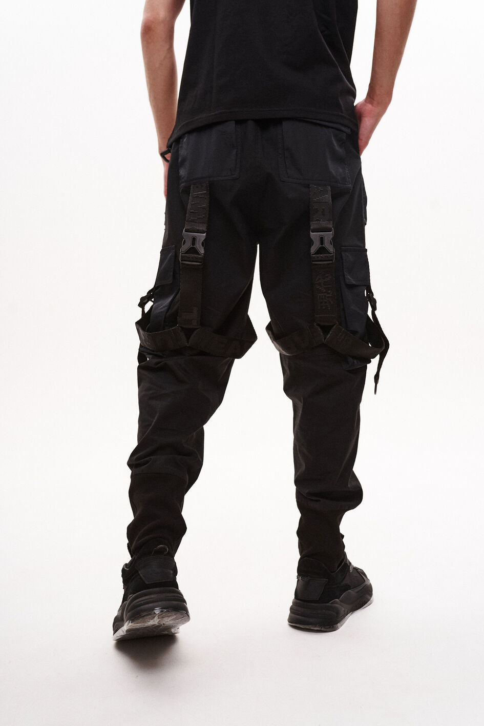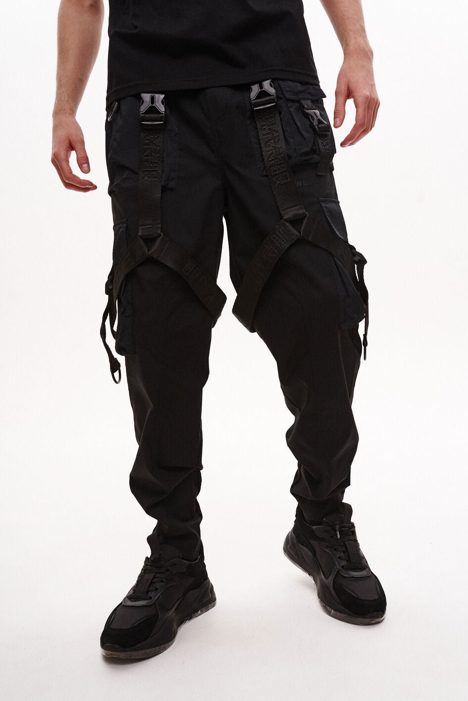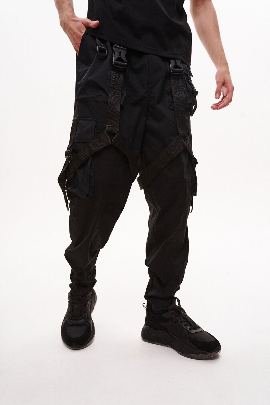Locker geschnittene Hose. Abnehmbare Hosenträger mit Fastex-Verschluss. Bund mit Gummizug und integriertem Gürtel mit doppelter Regulierung. Die Hose verfügt über 7 Taschen: zwei aufgesetzte Taschen oben, zwei aufgesetzte Seitentaschen, zwei aufgesetzte Gesäßtaschen und eine kleine aufgesetzte Tasche mit Klappe, die auf die linke obere Tasche genäht ist. Die Gürtelschlaufen sind funktionsfähig. Im unteren Bereich des Produkts befinden sich Manschetten mit hinten platziertem Band, die das Hosenbein verjüngen.