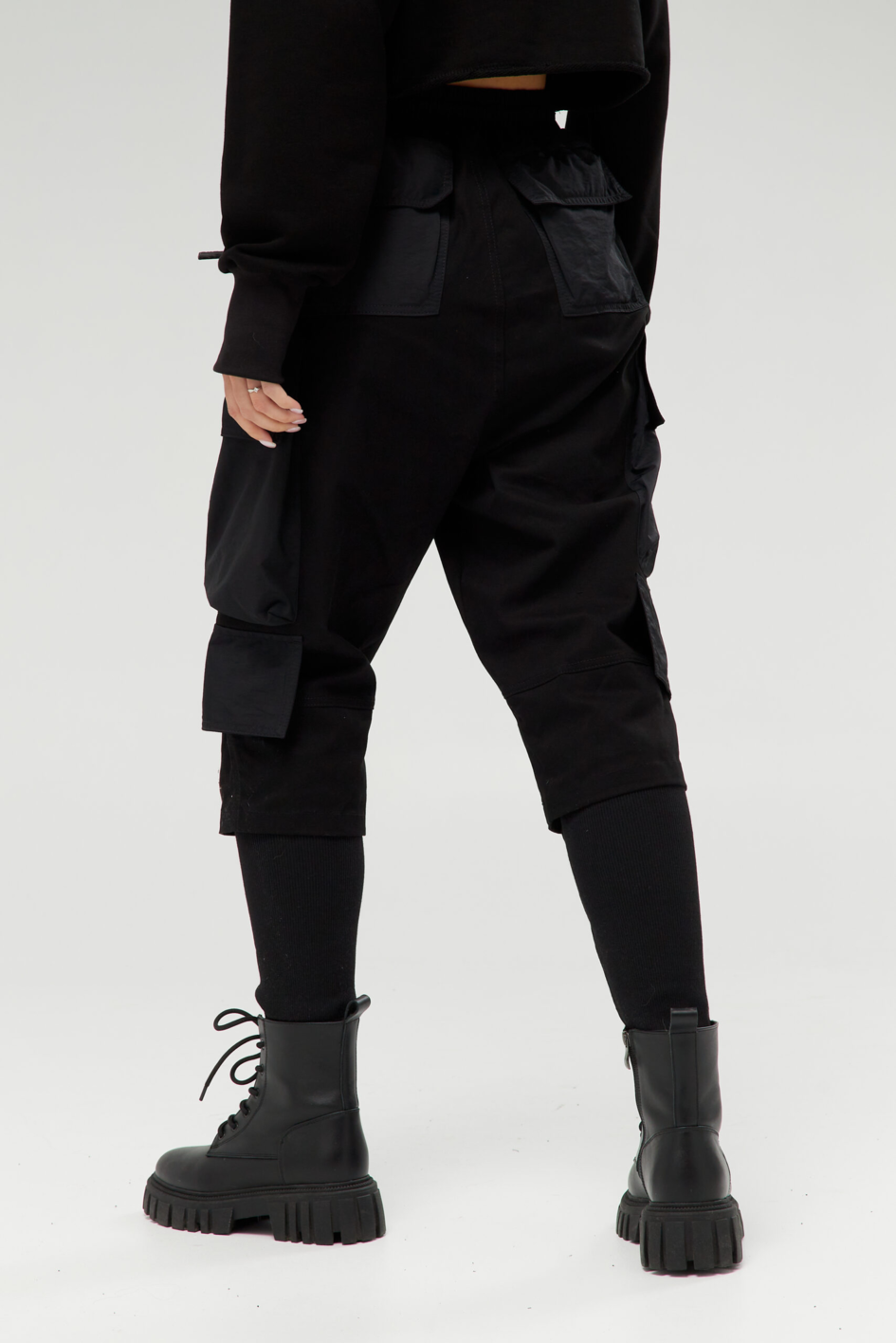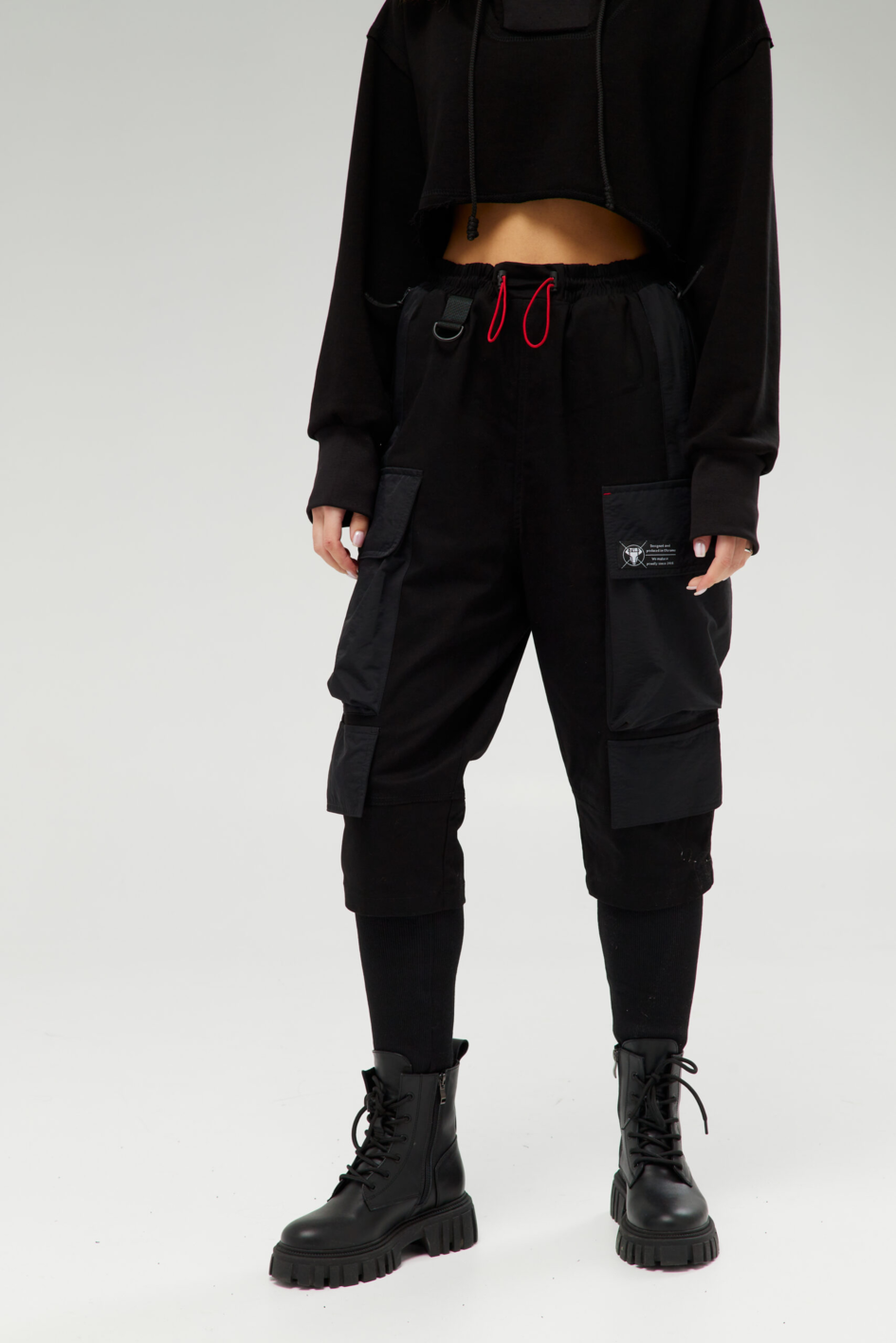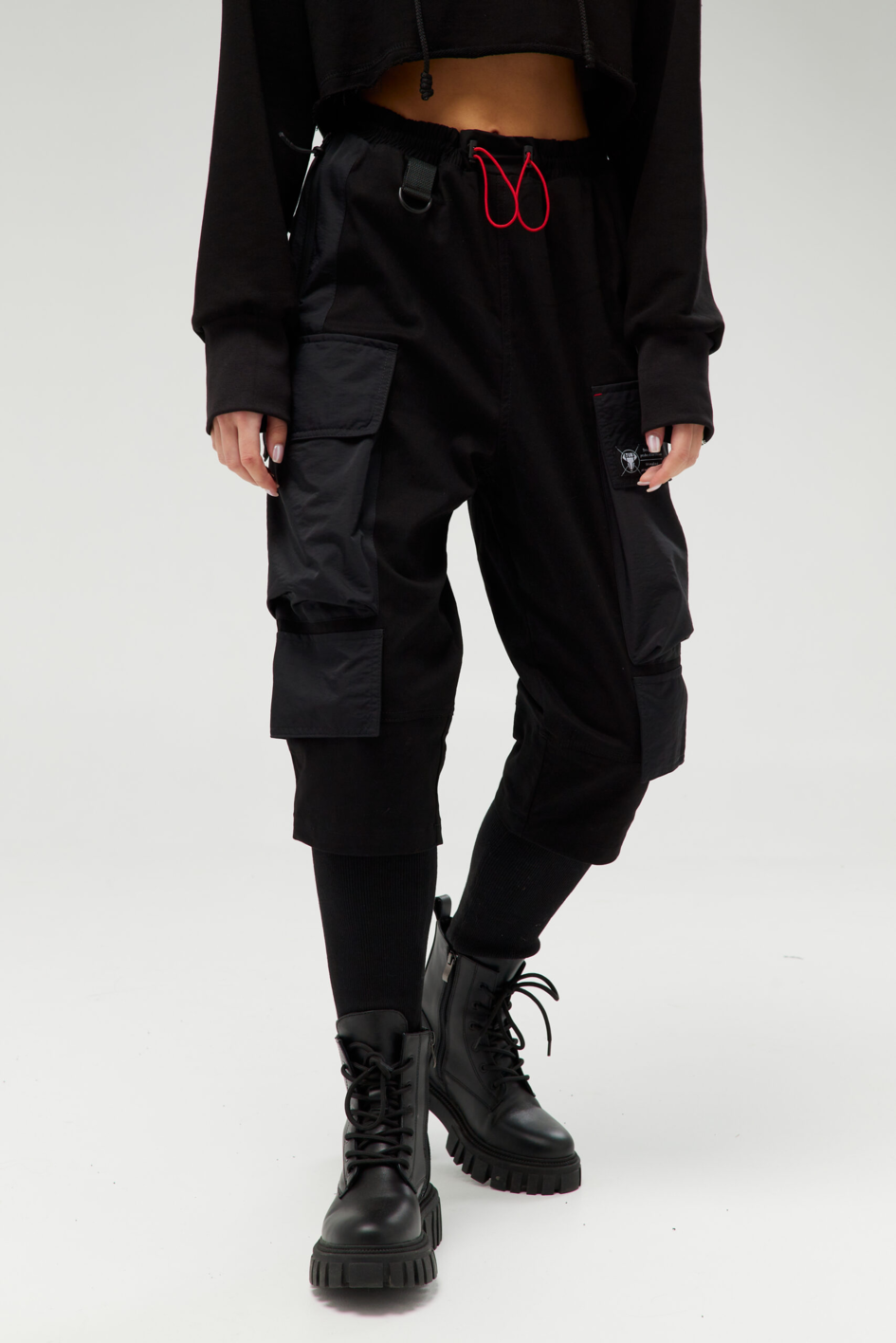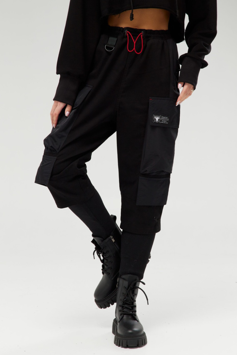 Lockere Hose mit niedrigem Bund und hohen Bündchen am Beinende. Elastischer Bund mit dekorativem Gummizug und Kordeln. Auf der rechten Seite des Bundes befindet sich ein Band mit Halbring zur Befestigung von Schlüsseln oder einer Saifu-Tasche. Die Hose verfügt über sechs Taschen: zwei seitlich aufgesetzte, zwei aufgesetzte Gesäßtaschen sowie zwei Eingrifftaschen. Dekorative Akzente sind der rote Gummizug im Bund und kleine rote Druckknöpfe an den Taschen.