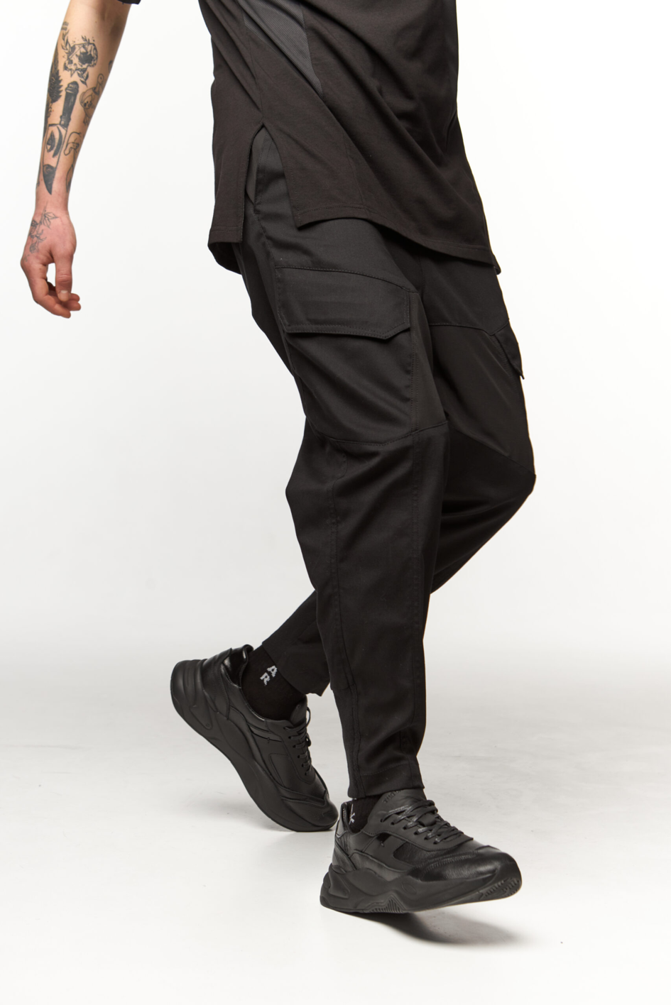 Locker geschnittene Hose mit niedrigem Bund. Bund mit Gummizug und zusätzlichem, integriertem Bandgürtel mit magnetischem Fastex-Verschluss. Auf der Vorderseite der Hose befinden sich zusätzliche Nähte, die die Passform verbessern. Die Hose hat sechs Taschen: zwei seitliche Eingrifftaschen, zwei aufgesetzte Seitentaschen sowie zwei Gesäßtaschen mit Patte. Der Hosenabschluss ist verengt, und für zusätzlichen Komfort befindet sich hinten ein Einsatz aus Rippstoff.