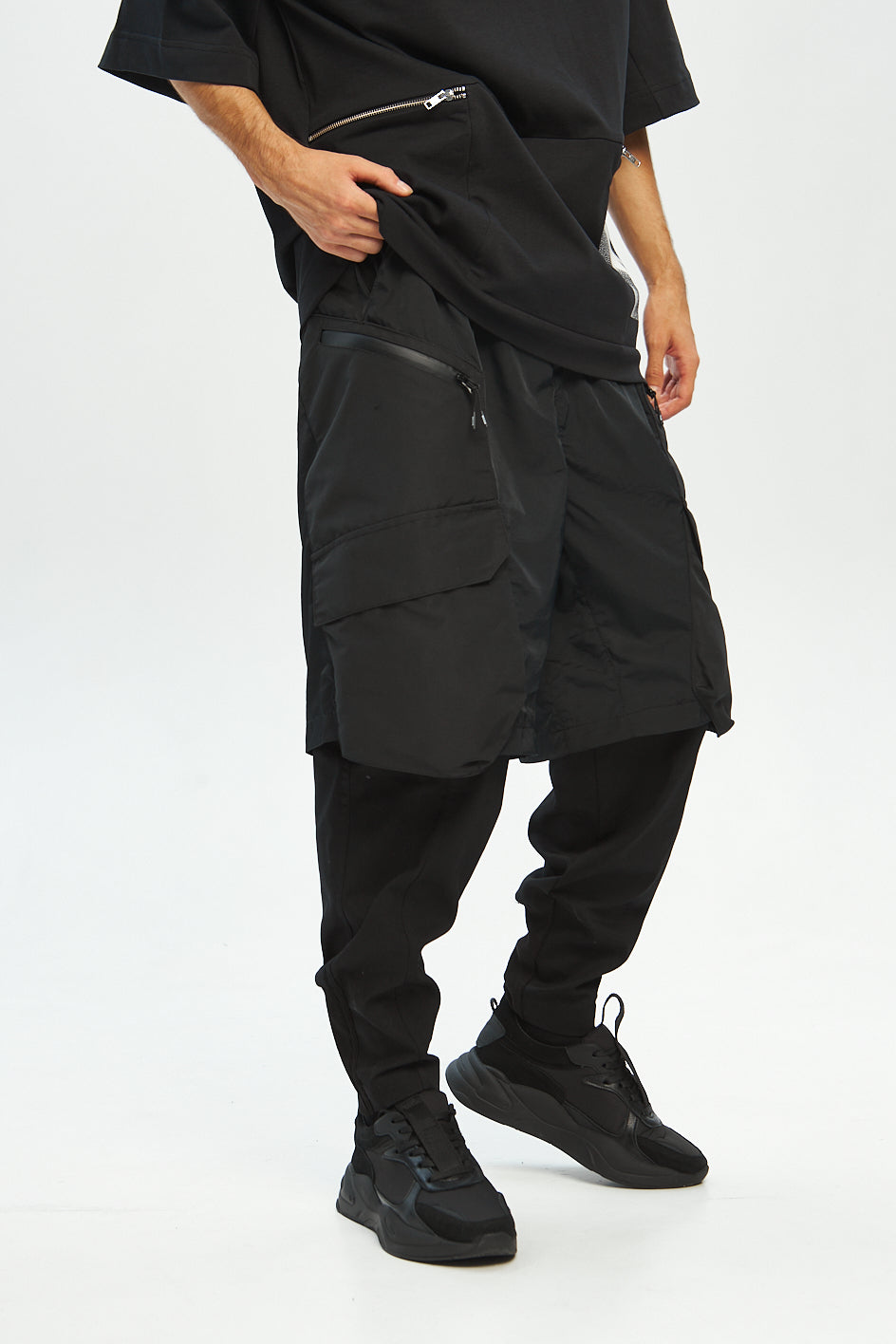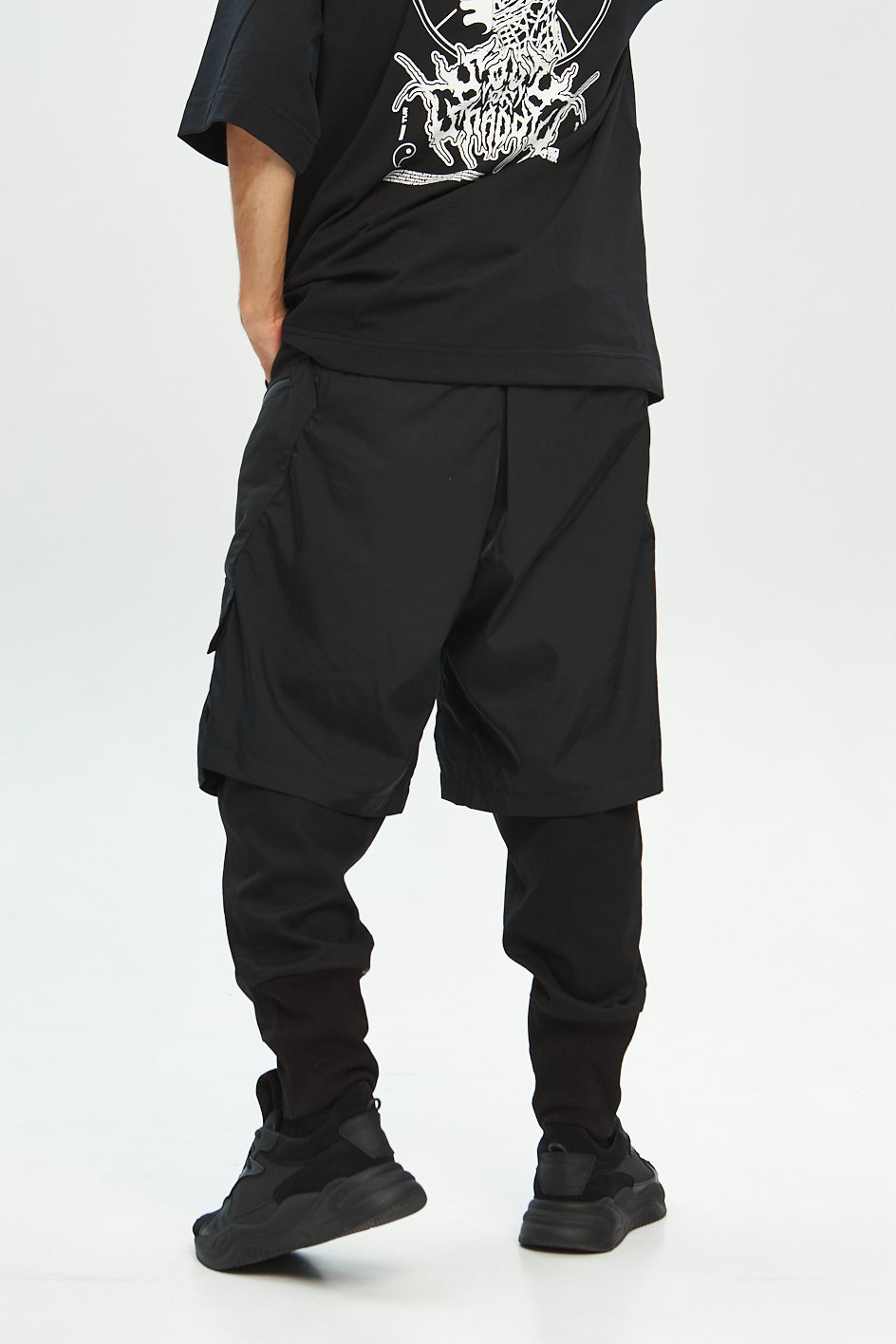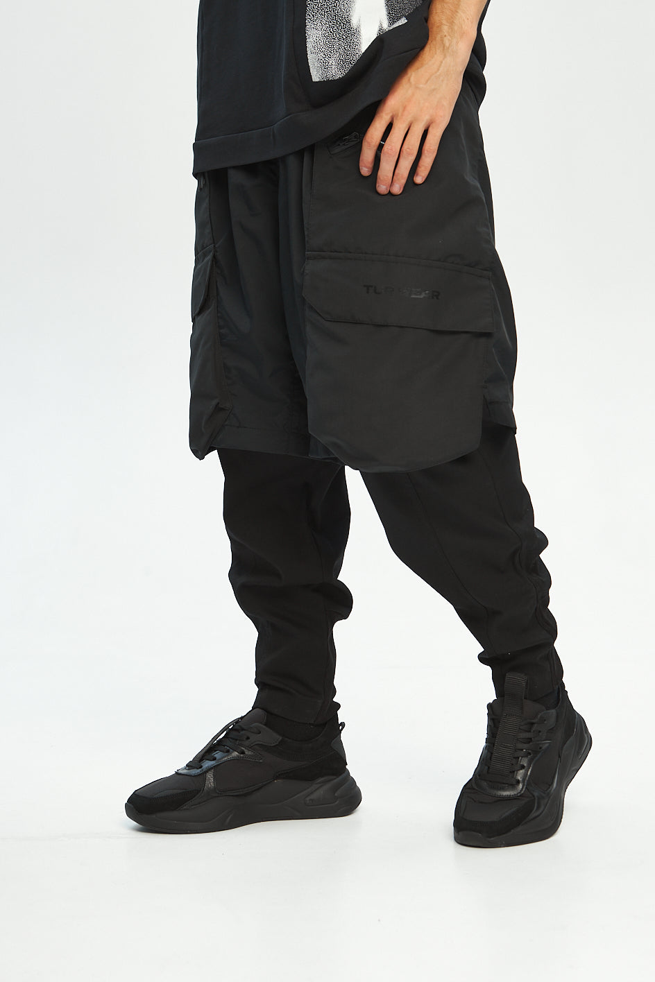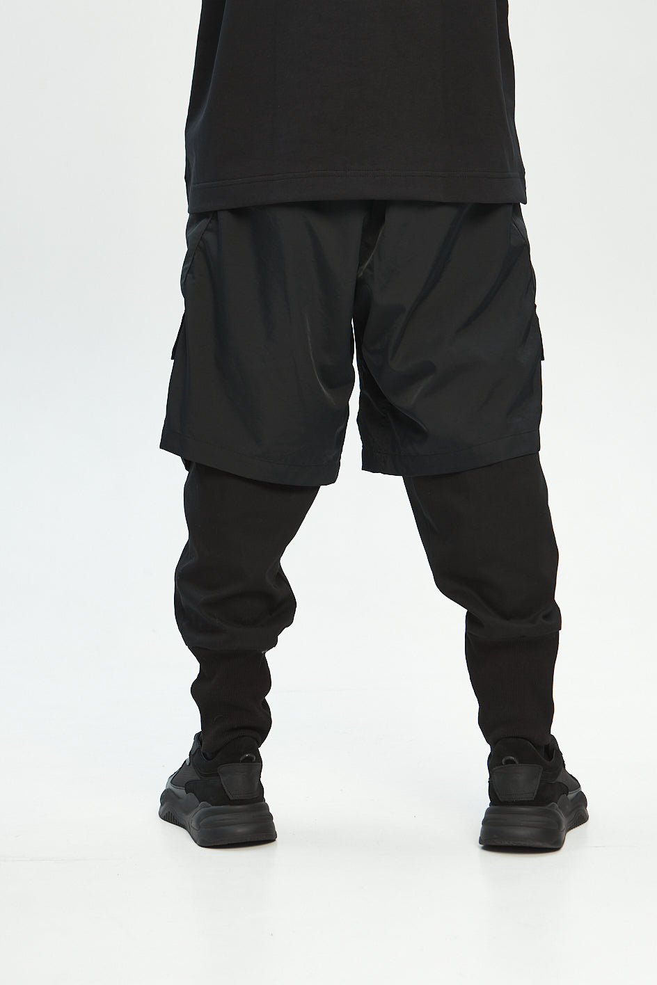 Locker geschnittene Hose, bestehend aus zwei Teilen: Shorts aus Jacquardstoff und Hosenbeinen aus Stretchmaterial. Die Beinabschlüsse sind mit elastischen Rippstrickbündchen versehen. An den Seiten befinden sich große aufgesetzte Taschen. Der Hosenbund ist mit einem zusätzlichen elastischen Gummizug ausgestattet, der für bessere Passform sorgt.