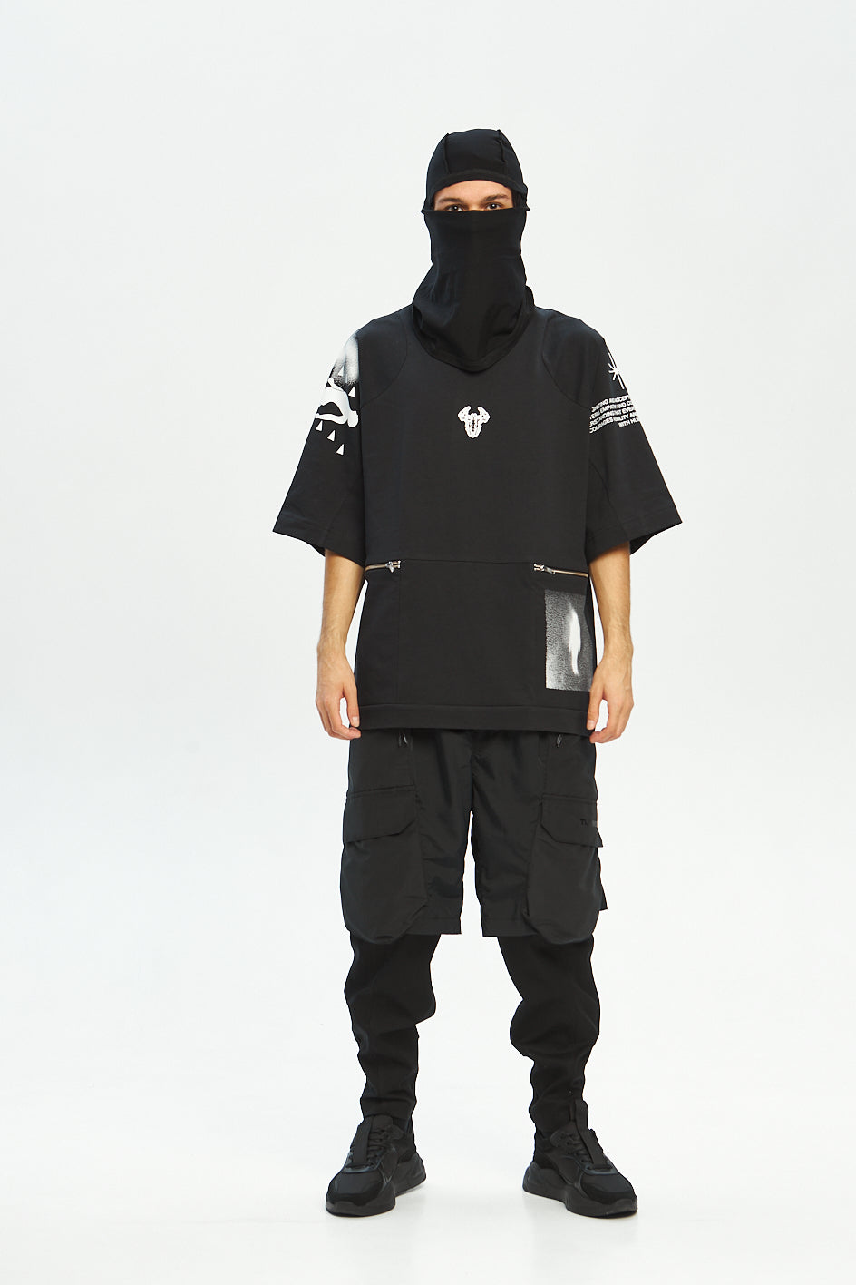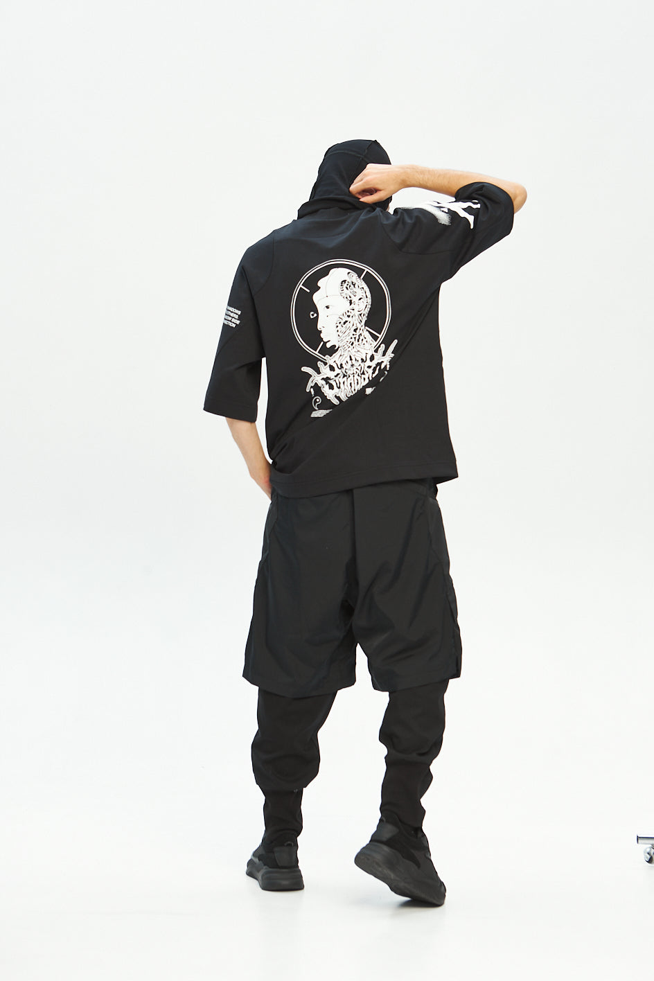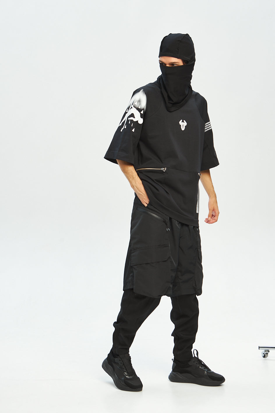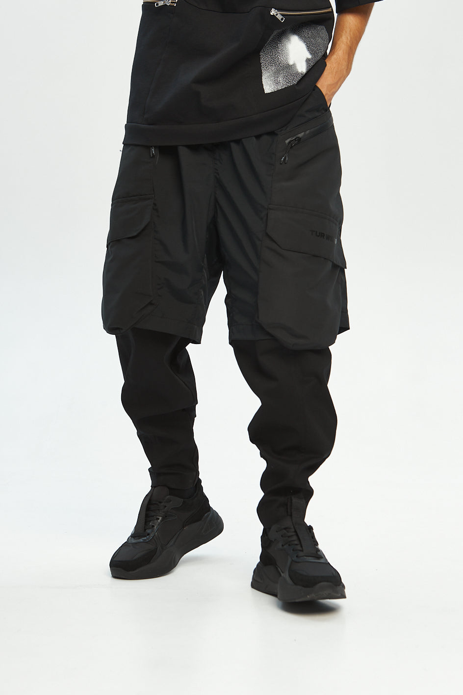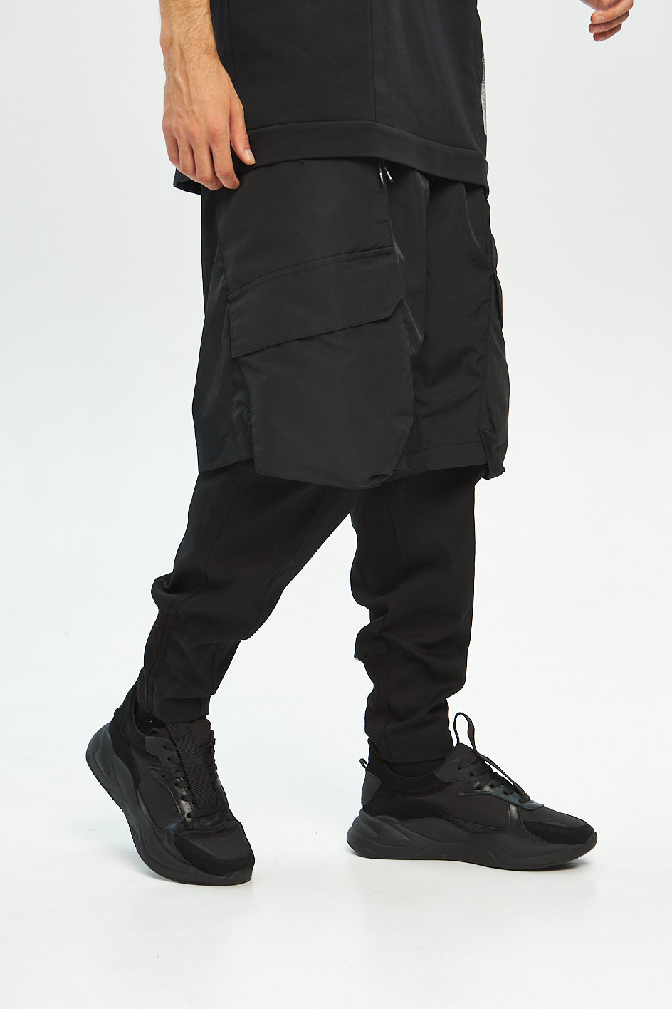 Locker geschnittene Hose, bestehend aus zwei Teilen: Shorts aus Jacquardstoff und Hosenbeinen aus Stretchmaterial. Die Beinabschlüsse sind mit elastischen Rippstrickbündchen versehen. An den Seiten befinden sich große aufgesetzte Taschen. Der Hosenbund ist mit einem zusätzlichen elastischen Gummizug ausgestattet, der für bessere Passform sorgt.