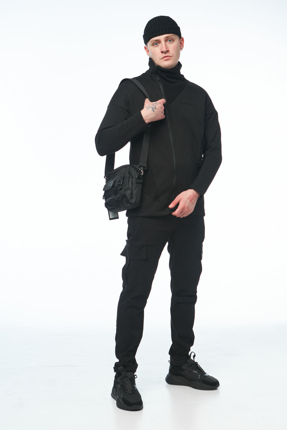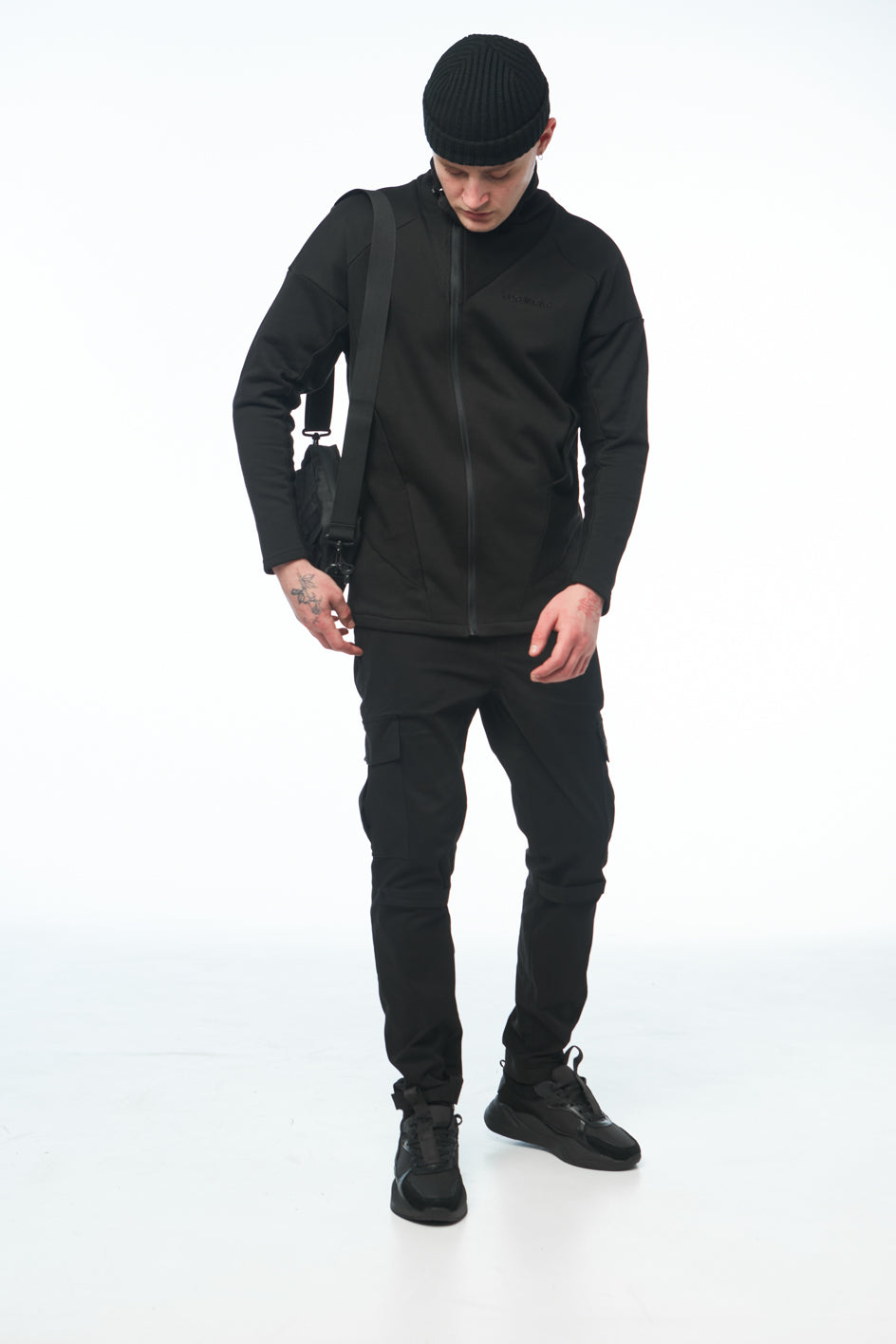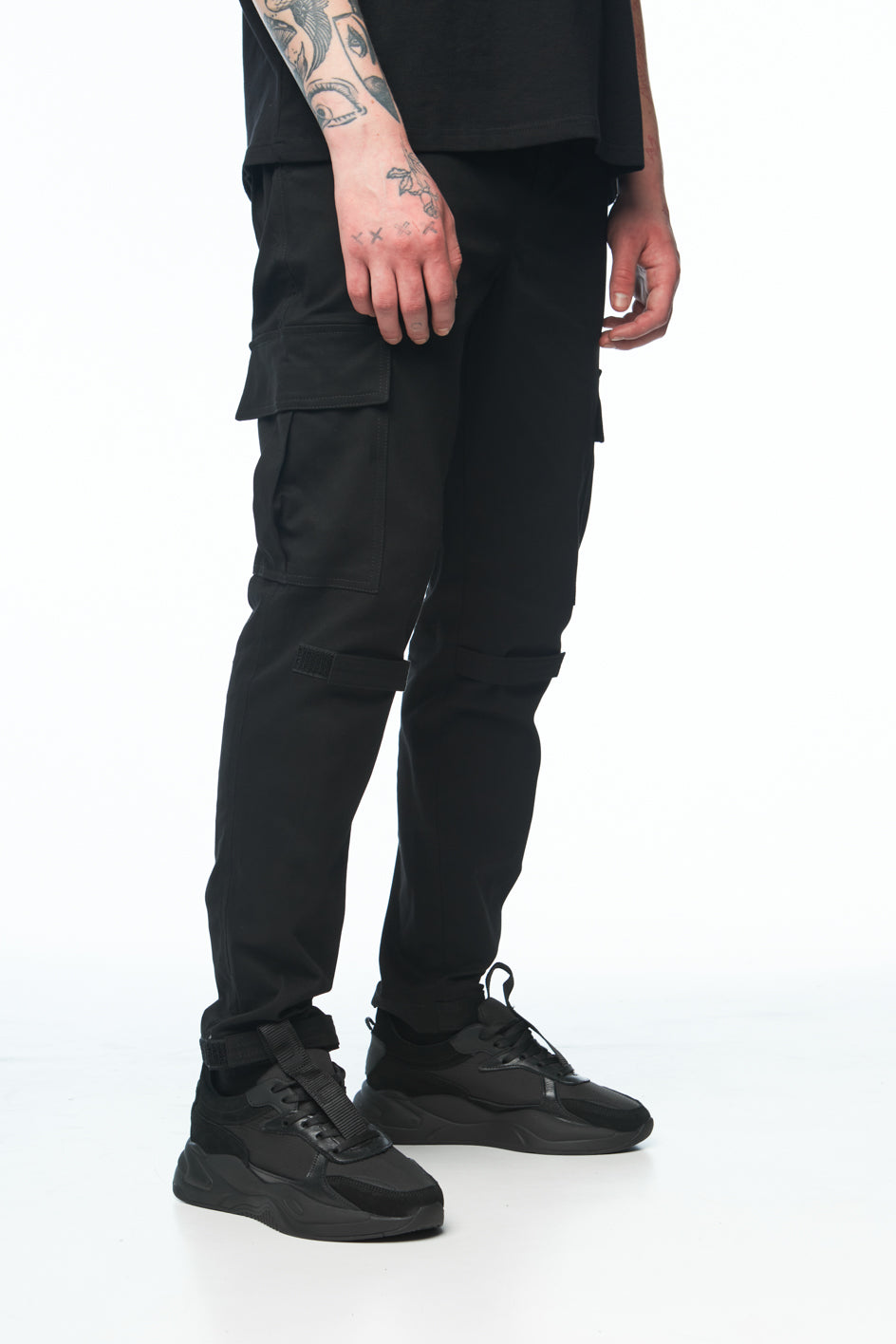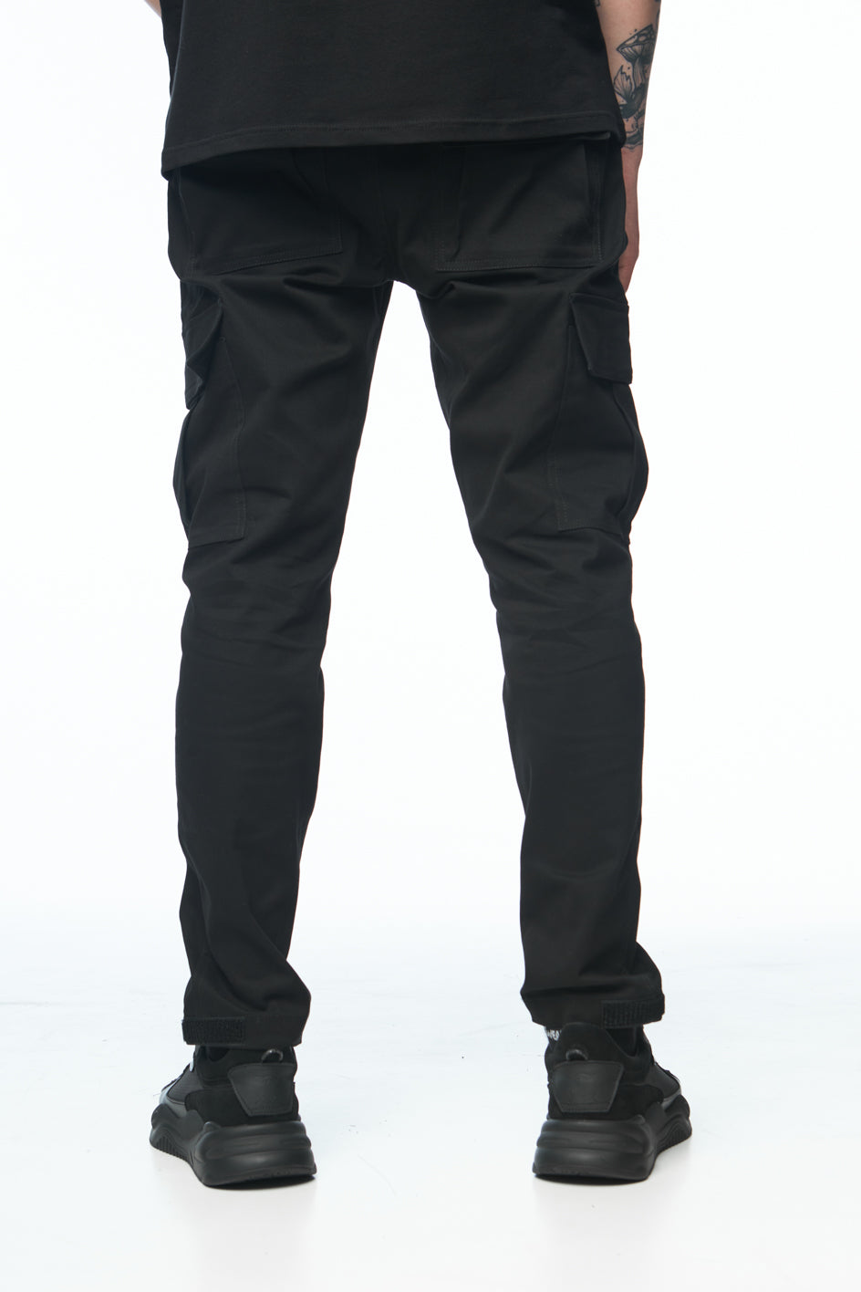 Klassisch geschnittene Hose, nach unten hin schmal zulaufend. Elastischer Bund mit Kordelzug. Beinweite regulierbar mit Klettverschlüssen im Kniebereich und am unteren Ende. Insgesamt sechs Taschen: zwei seitliche aufgesetzte Taschen mit Klappen und Klettverschluss, zwei aufgesetzte Gesäßtaschen, zwei Eingrifftaschen.