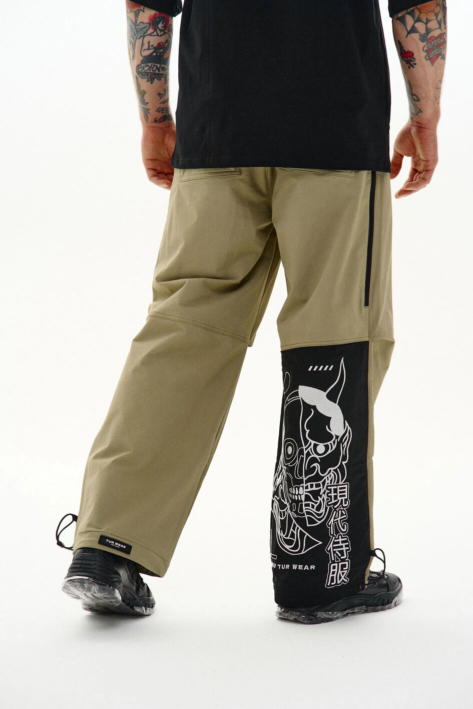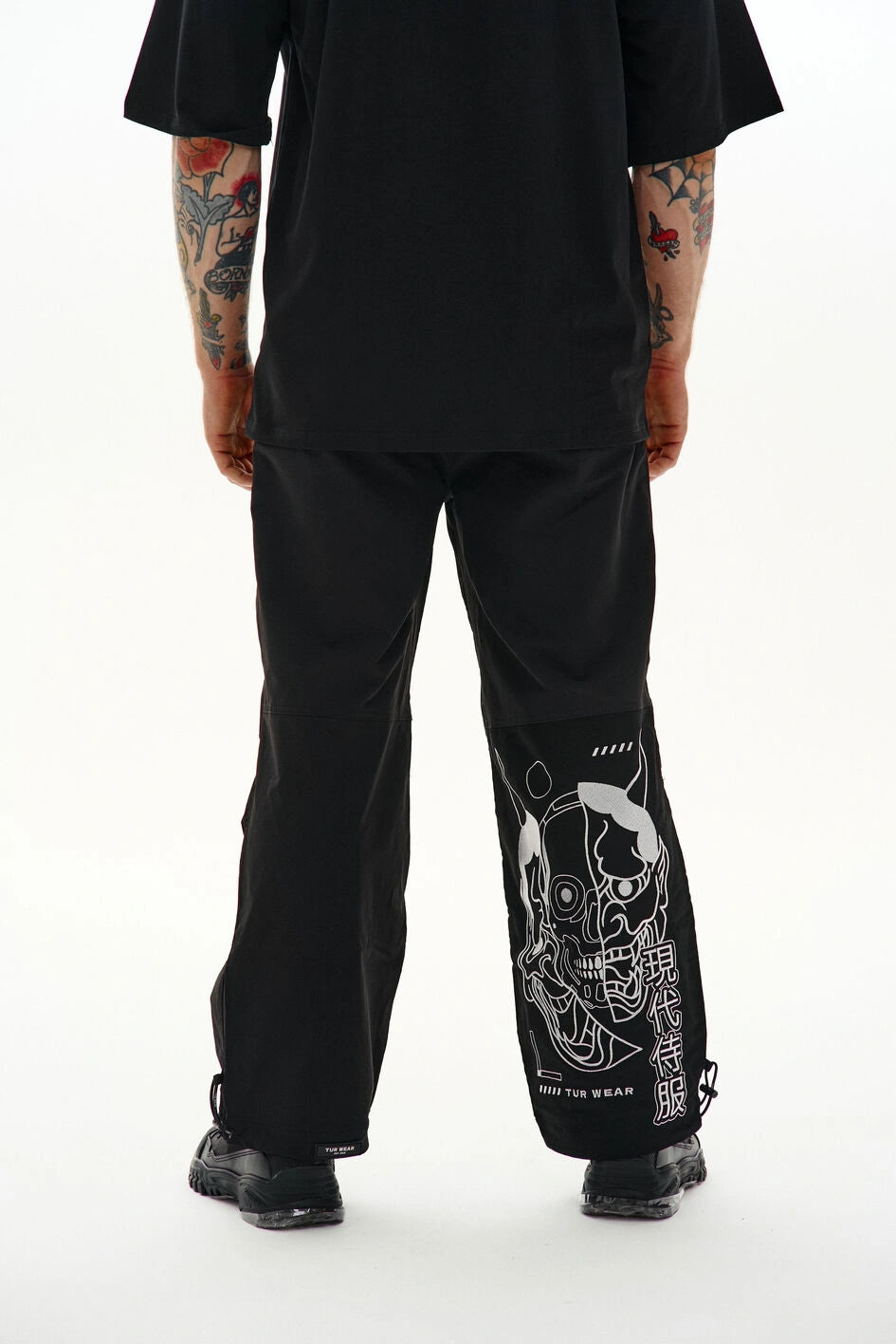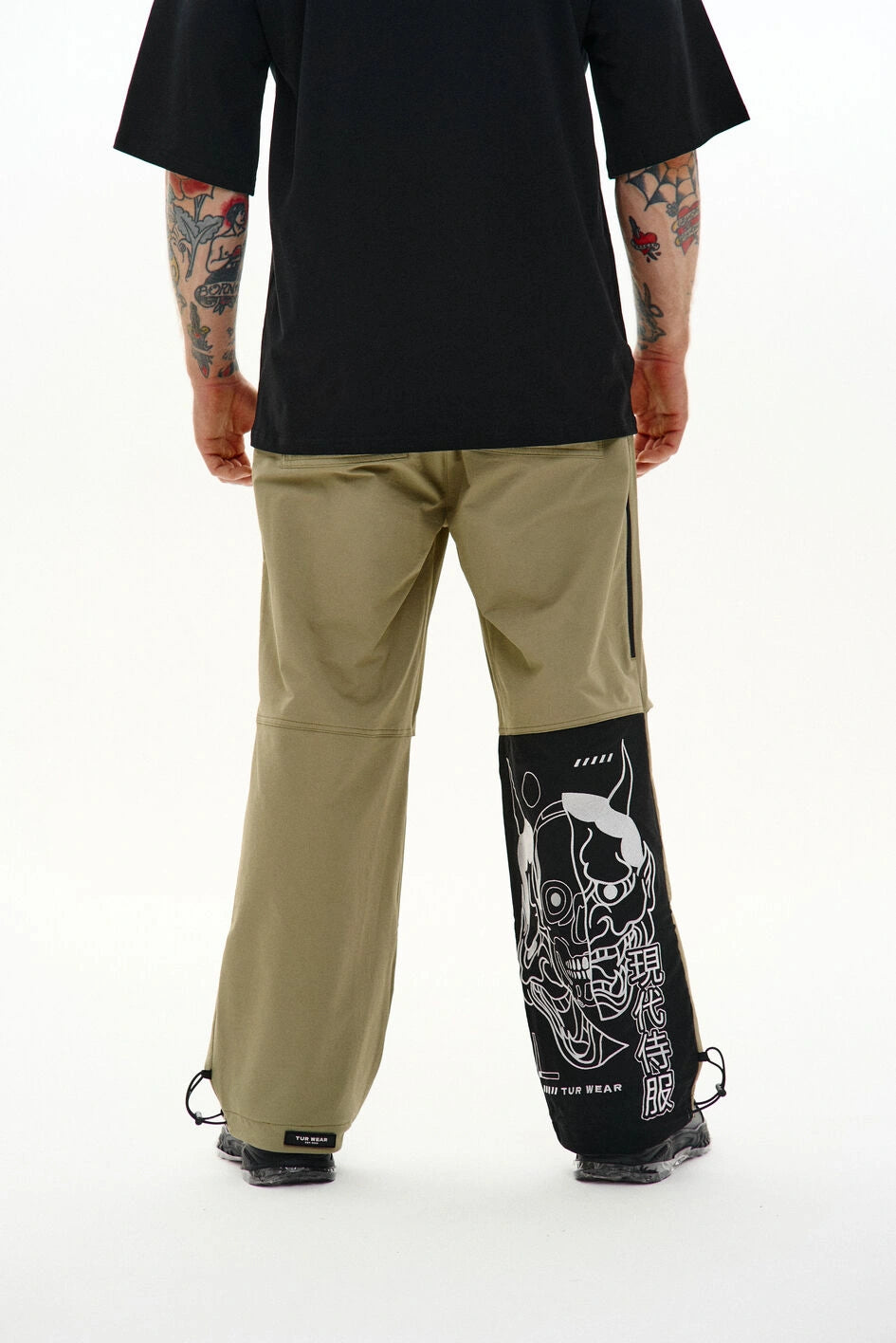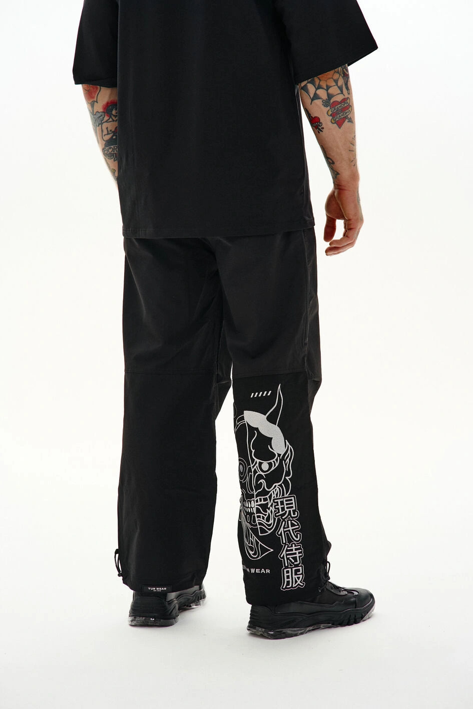 Locker geschnittene Hose mit doppelter Taillenregulierung (Gürtel im Bund). Hergestellt aus leichtem, elastischem Material. Der Hosenabschluss ist mit einem elastischen Kordelzug verstellbar. Am Bund befindet sich ein Halb-Ring und spezielle Haken zur Befestigung von Gurten. An den Seiten befinden sich Reißverschlüsse, die Belüftungsöffnungen öffnen. Auf der Rückseite, am rechten Hosenbein, befindet sich ein Leinwand-Einsatz mit Cyber-Samurai-Stickerei. Die Innennähte sind mit Schrägband verarbeitet, und die Taschen wurden mit Doppelnähten gefertigt. Das Modell hat 4 Taschen und Abnäher im Kniebereich.