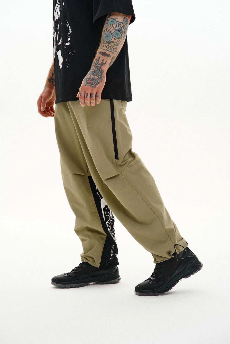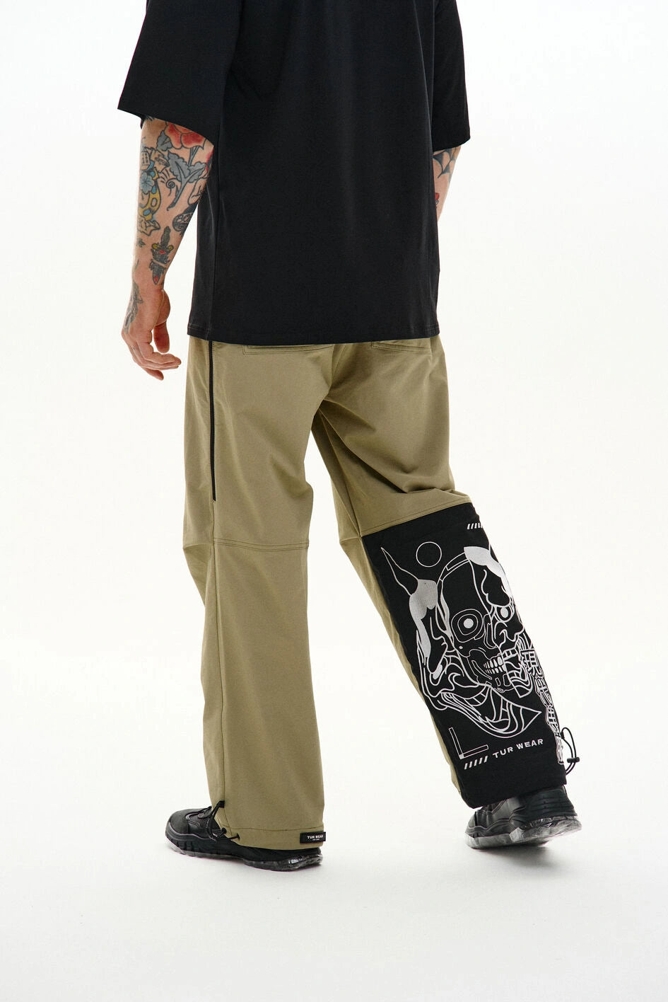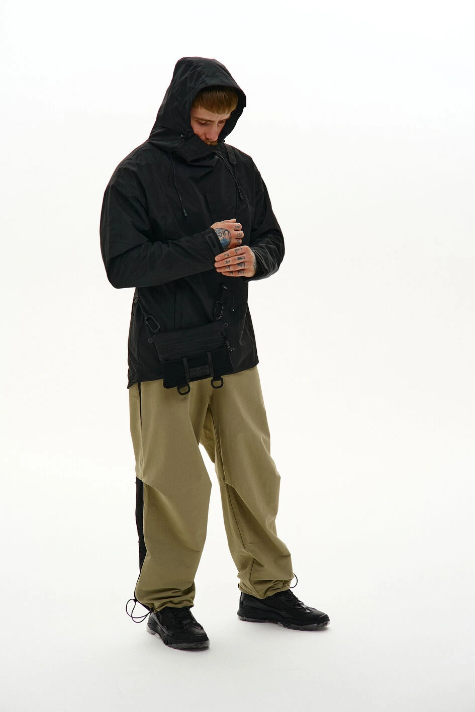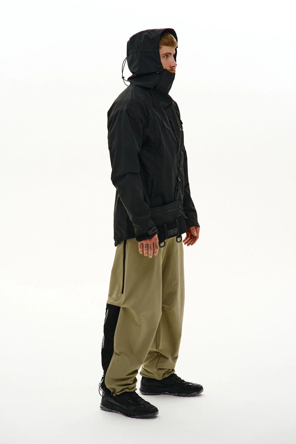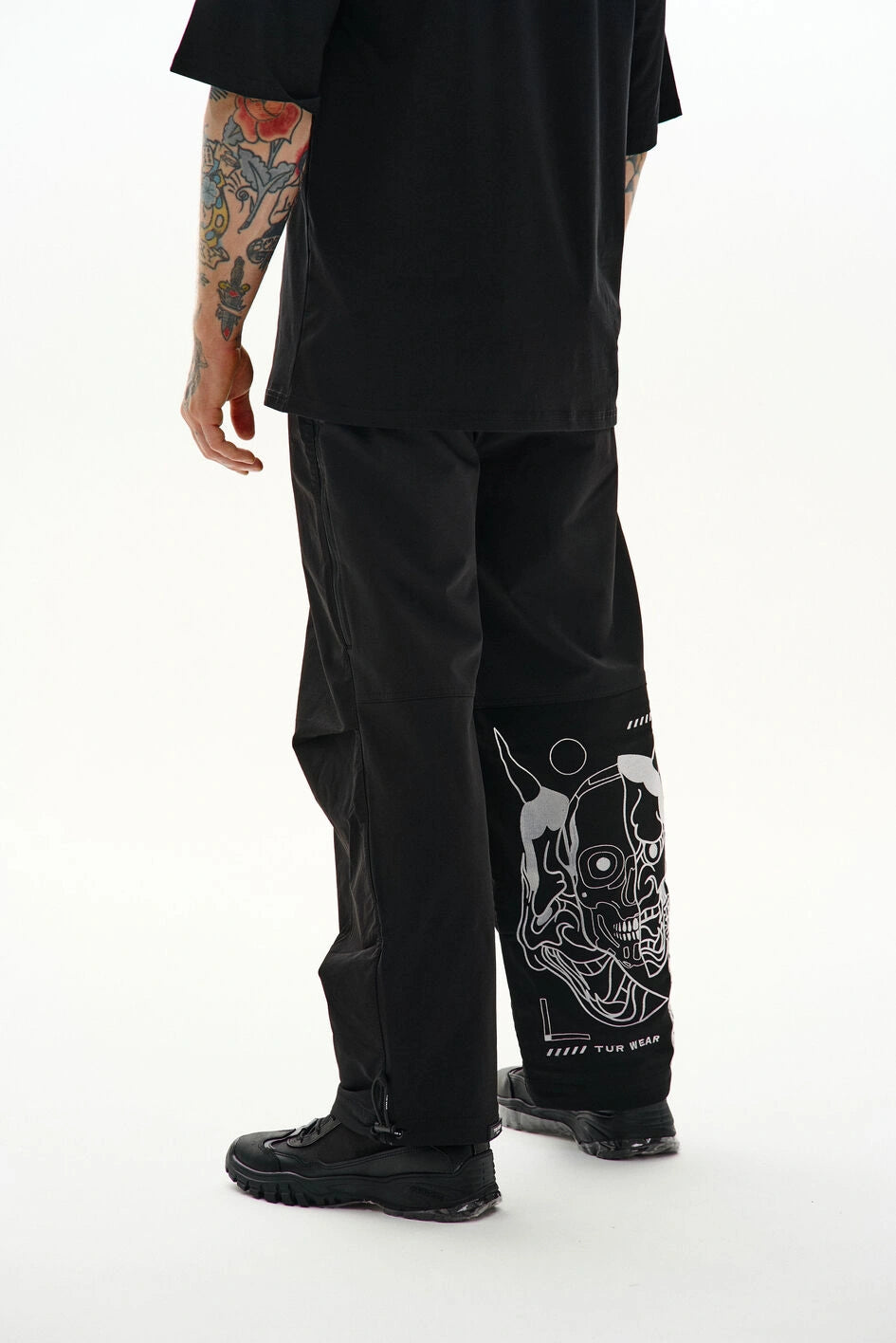 Locker geschnittene Hose mit doppelter Taillenregulierung (Gürtel im Bund). Hergestellt aus leichtem, elastischem Material. Der Hosenabschluss ist mit einem elastischen Kordelzug verstellbar. Am Bund befindet sich ein Halb-Ring und spezielle Haken zur Befestigung von Gurten. An den Seiten befinden sich Reißverschlüsse, die Belüftungsöffnungen öffnen. Auf der Rückseite, am rechten Hosenbein, befindet sich ein Leinwand-Einsatz mit Cyber-Samurai-Stickerei. Die Innennähte sind mit Schrägband verarbeitet, und die Taschen wurden mit Doppelnähten gefertigt. Das Modell hat 4 Taschen und Abnäher im Kniebereich.