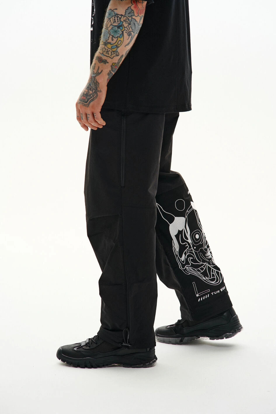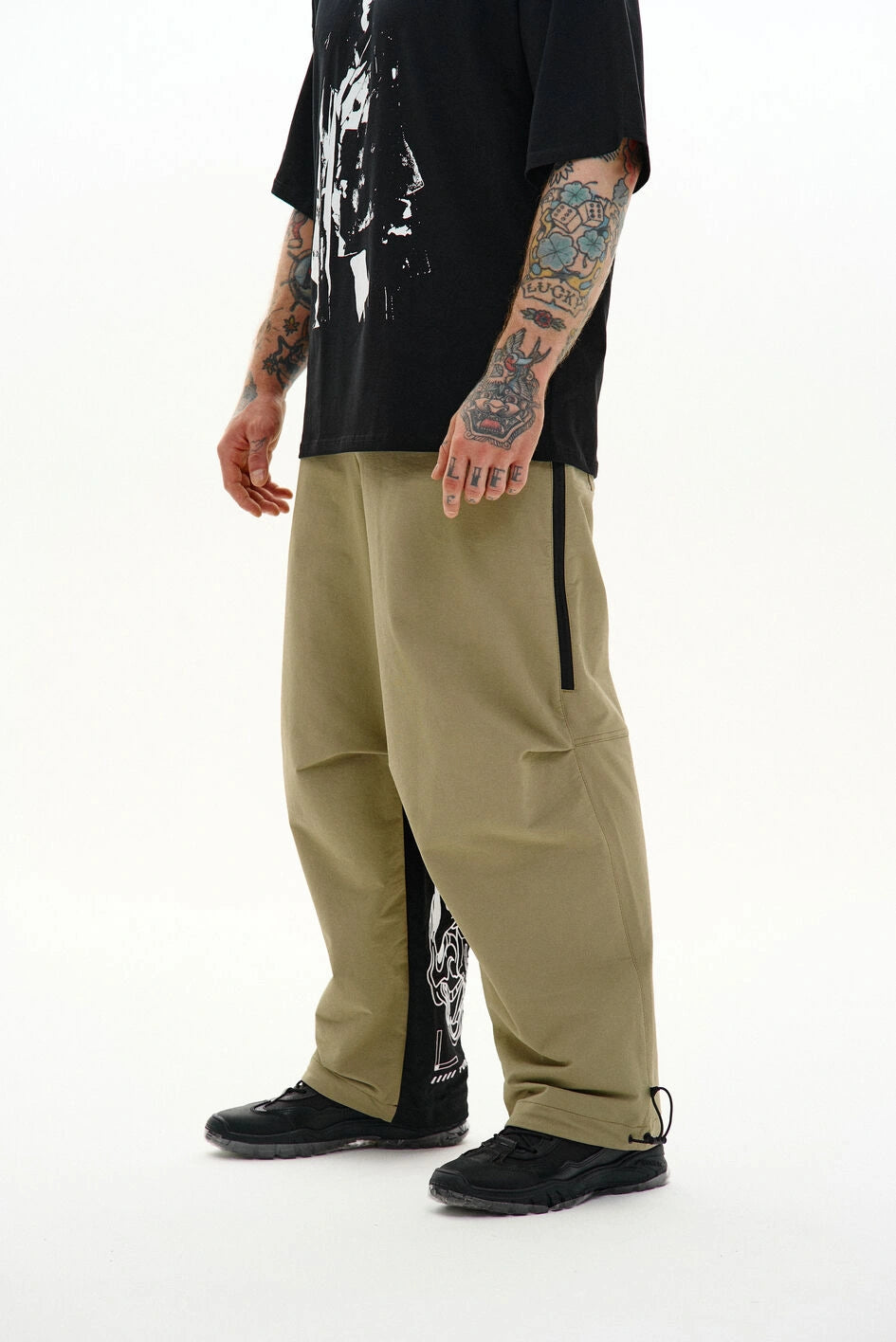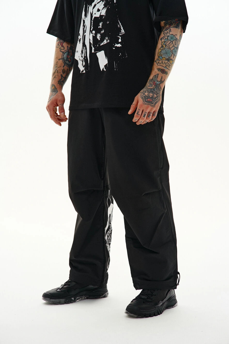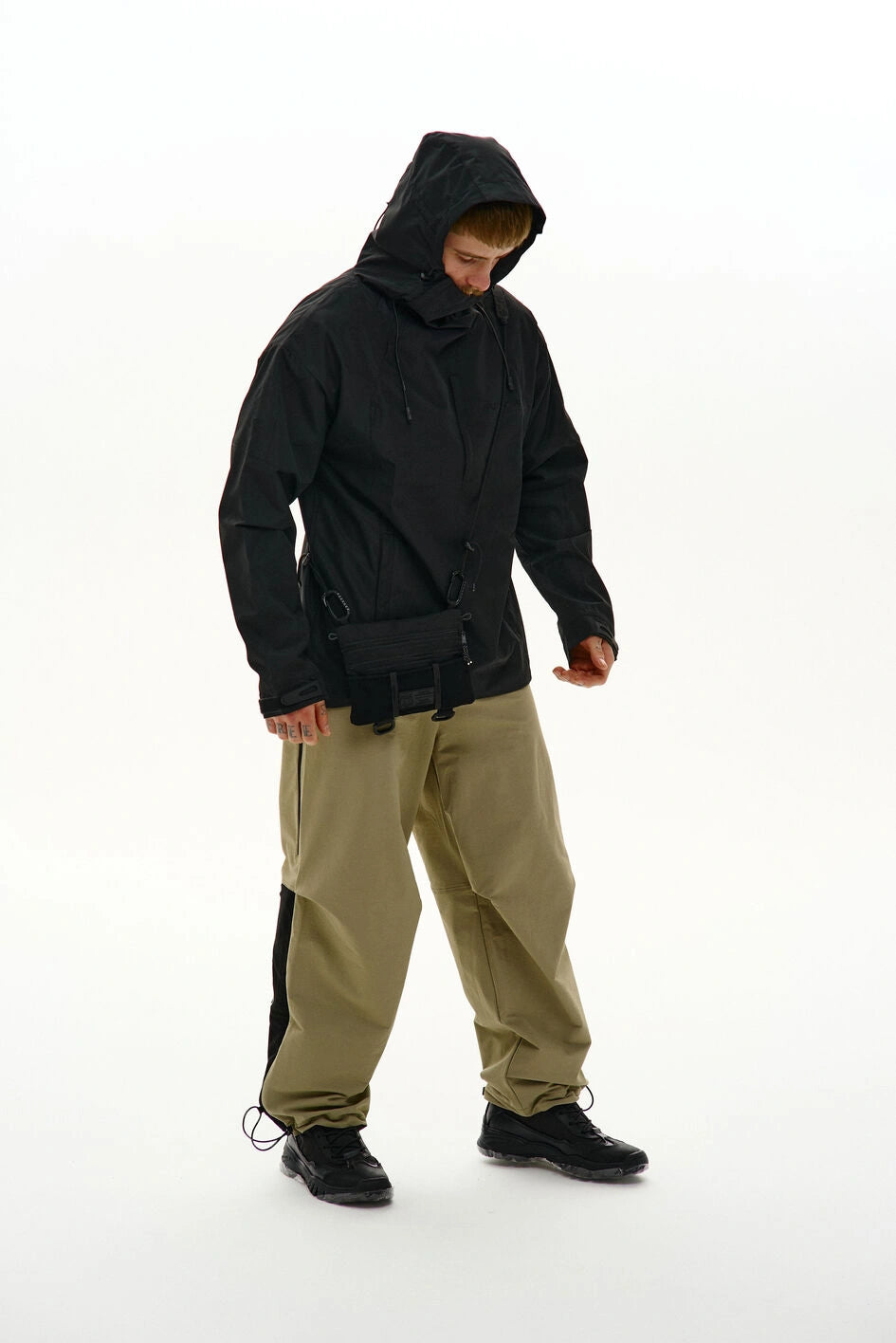 Locker geschnittene Hose mit doppelter Taillenregulierung (Gürtel im Bund). Hergestellt aus leichtem, elastischem Material. Der Hosenabschluss ist mit einem elastischen Kordelzug verstellbar. Am Bund befindet sich ein Halb-Ring und spezielle Haken zur Befestigung von Gurten. An den Seiten befinden sich Reißverschlüsse, die Belüftungsöffnungen öffnen. Auf der Rückseite, am rechten Hosenbein, befindet sich ein Leinwand-Einsatz mit Cyber-Samurai-Stickerei. Die Innennähte sind mit Schrägband verarbeitet, und die Taschen wurden mit Doppelnähten gefertigt. Das Modell hat 4 Taschen und Abnäher im Kniebereich.