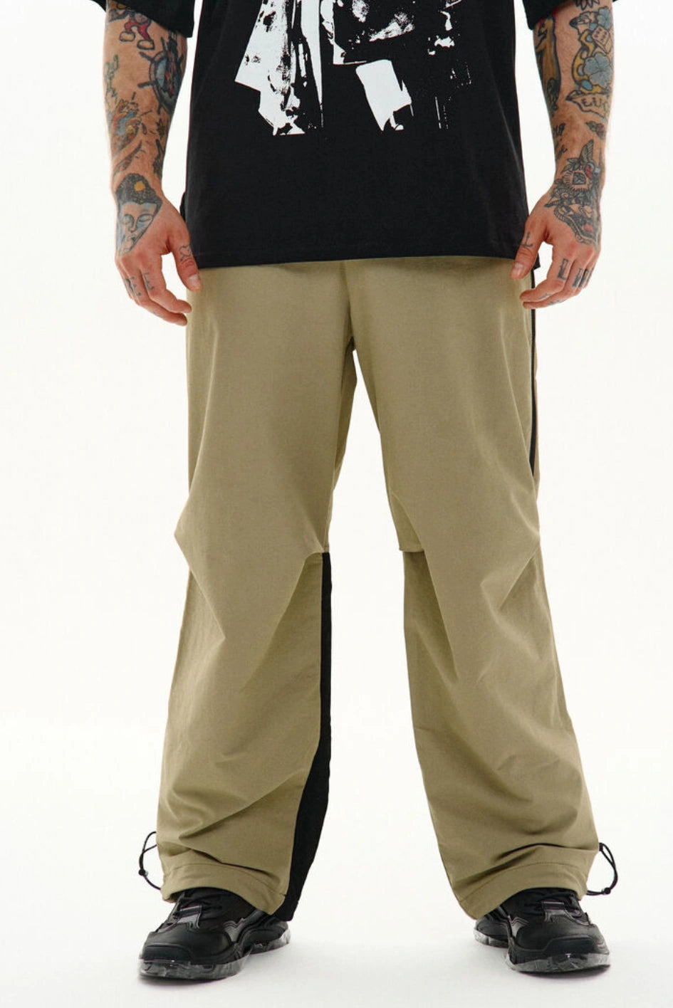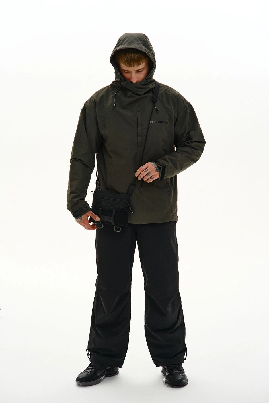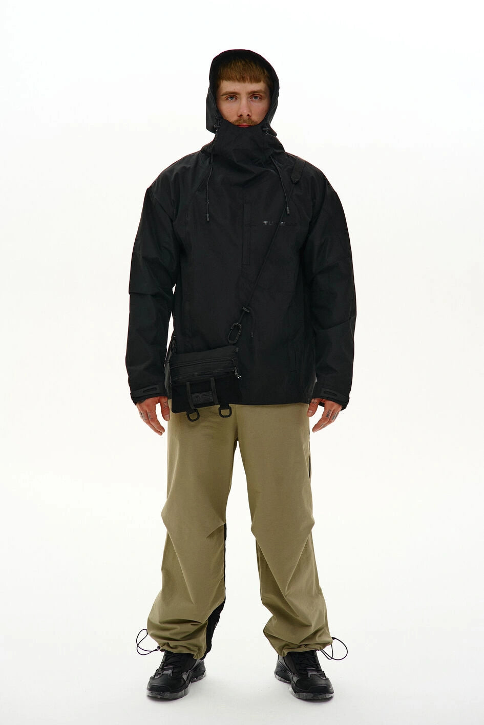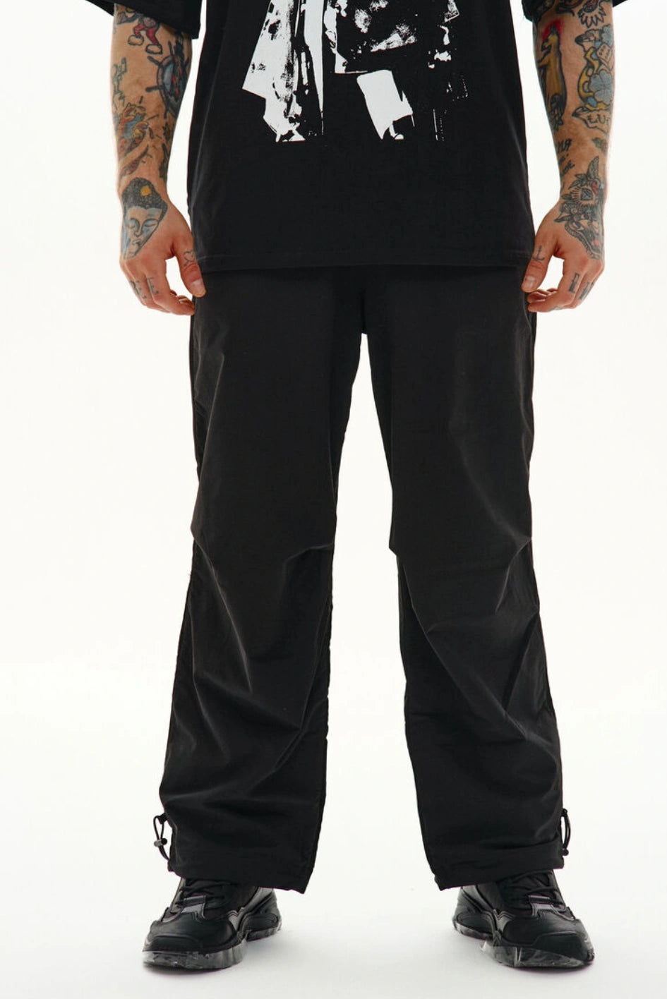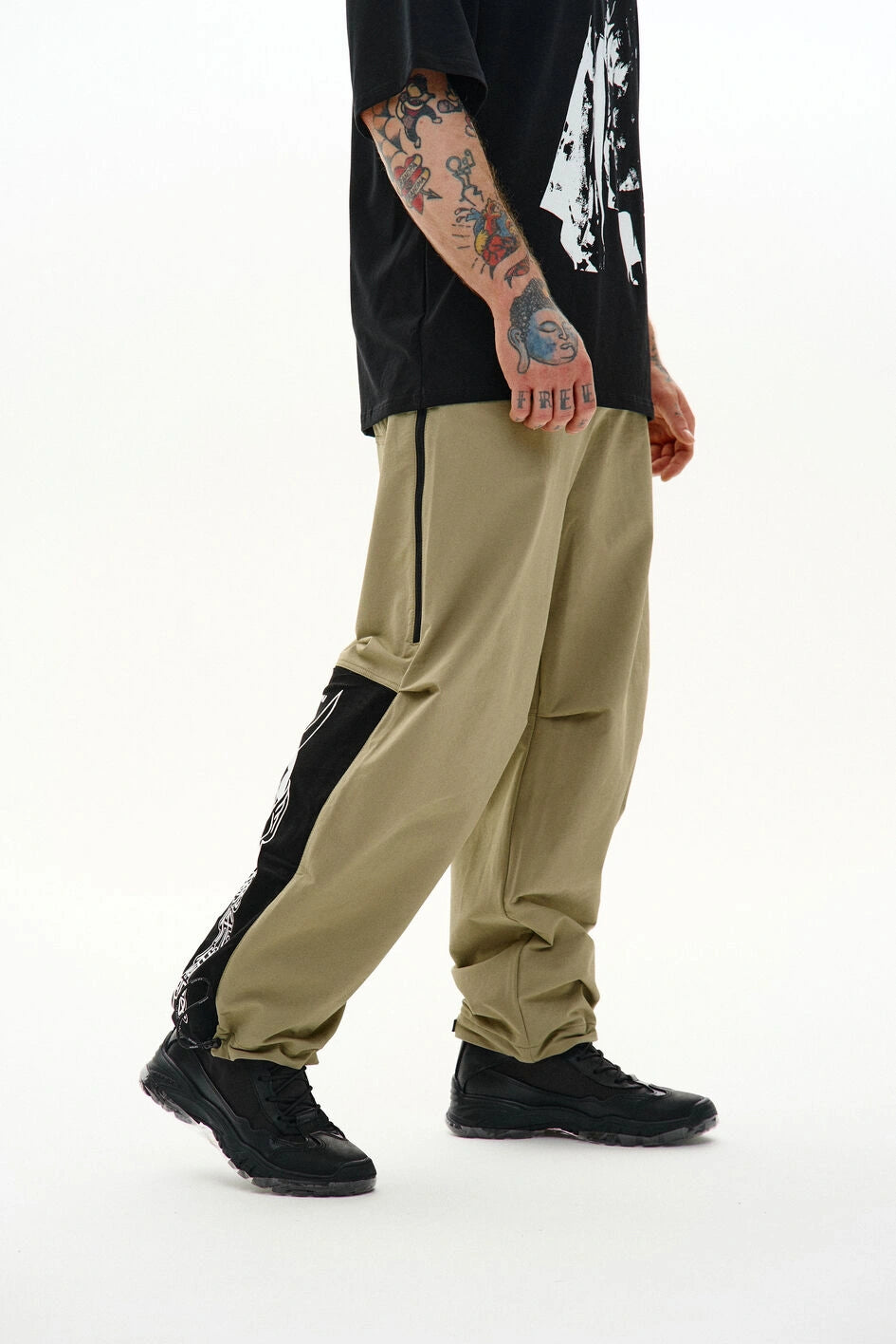 Locker geschnittene Hose mit doppelter Taillenregulierung (Gürtel im Bund). Hergestellt aus leichtem, elastischem Material. Der Hosenabschluss ist mit einem elastischen Kordelzug verstellbar. Am Bund befindet sich ein Halb-Ring und spezielle Haken zur Befestigung von Gurten. An den Seiten befinden sich Reißverschlüsse, die Belüftungsöffnungen öffnen. Auf der Rückseite, am rechten Hosenbein, befindet sich ein Leinwand-Einsatz mit Cyber-Samurai-Stickerei. Die Innennähte sind mit Schrägband verarbeitet, und die Taschen wurden mit Doppelnähten gefertigt. Das Modell hat 4 Taschen und Abnäher im Kniebereich.