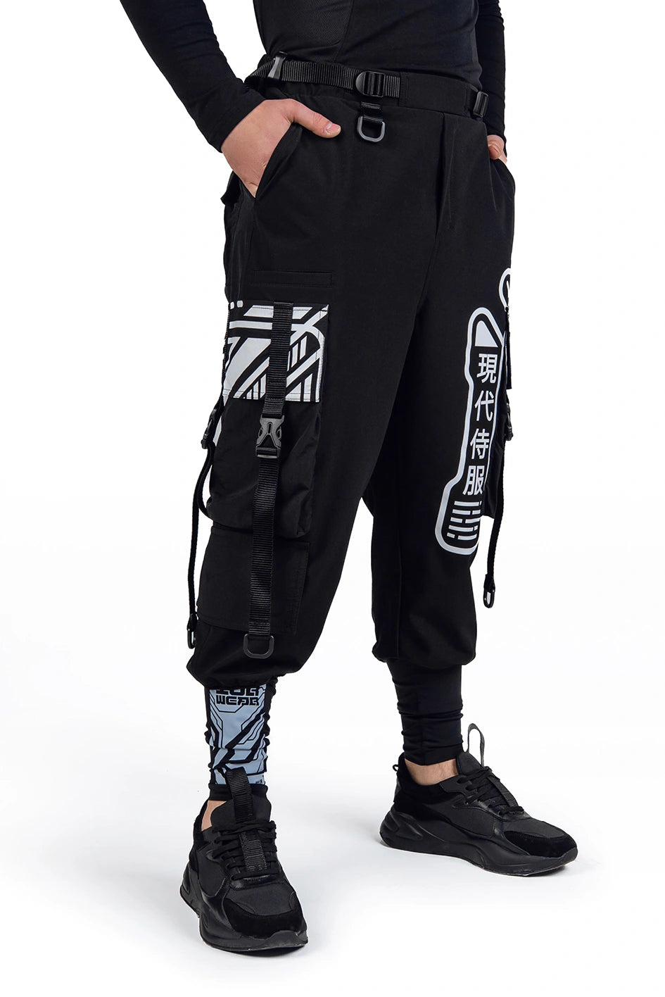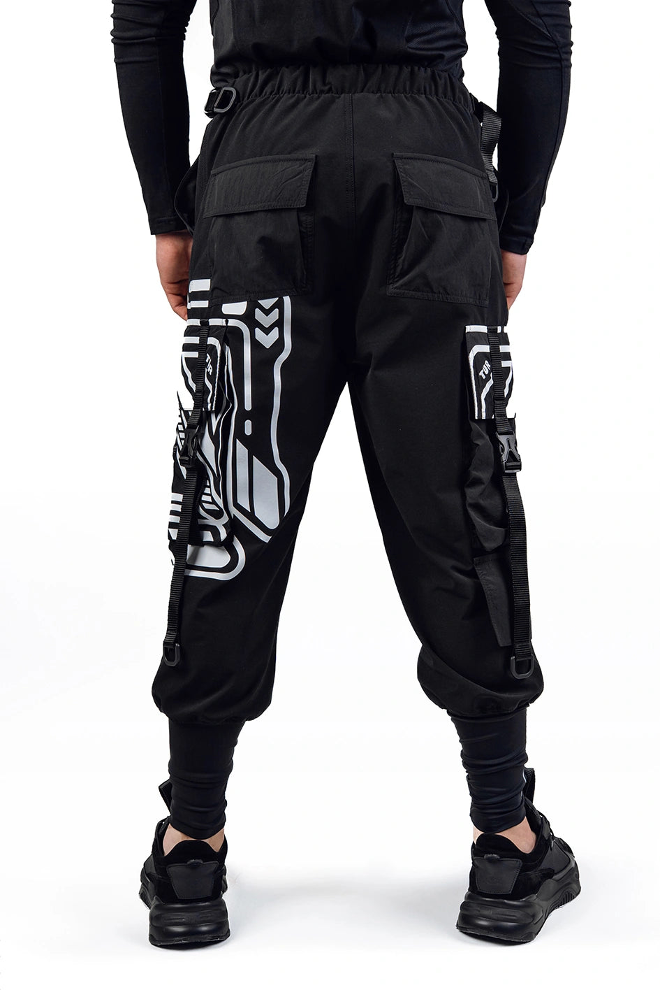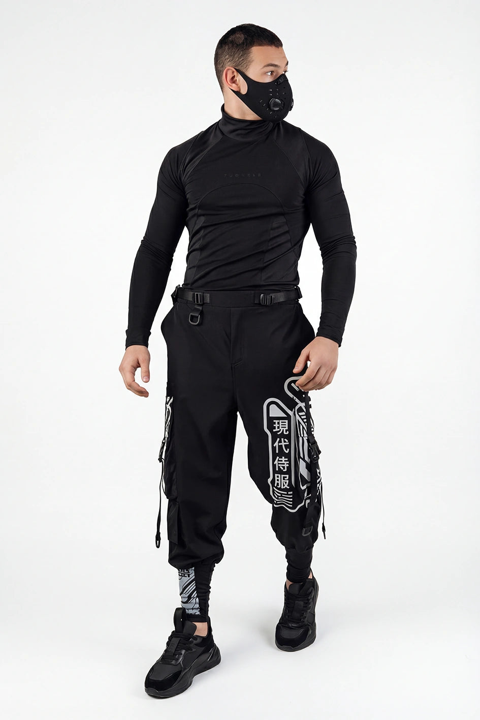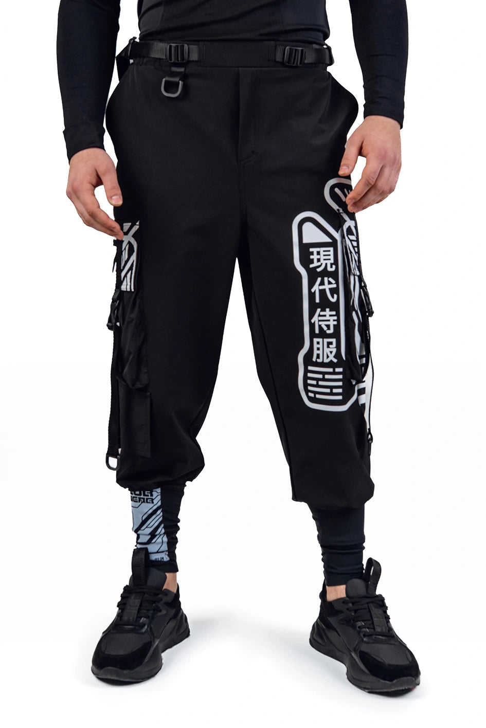 Cargo-Hose mit geradem Schnitt, die eine Neuauflage des Modells Yoshida im Rahmen des Reborn-Konzepts darstellt. Das Modell bewahrt die DNA der ersten Cargo-Hosen mit Prints und interpretiert sie im Cyberpunk-Stil neu. Die Passform wird durch den elastischen Bund sowie das doppelte Gurtsystem reguliert. Die Konstruktion umfasst sieben funktionale Taschen: zwei obere Eingrifftaschen, eine separate Tasche für ein Smartphone, zwei geräumige Seitentaschen mit Fastex-Verschlüssen und Bandverstellung sowie zwei hintere Taschen mit Klettklappen. Die aufgesetzten Taschen bestehen aus Stoff mit „Crash“-Effekt. Unter der rechten Tasche befindet sich eine dekorative Klappe, die eine zusätzliche visuelle Ebene schafft. Unter dem Bund auf der rechten Seite befindet sich ein D-Ring für Accessoires. Der Saum der Hosenbeine ist mit hohen elastischen Bündchen aus Nylon versehen, die die Form und Passform halten. Das Modell wird durch Prints im Cyberpunk-Stil mit firmeneigenen Hieroglyphen „Rüstung des modernen Samurai“ ergänzt. Die Hose bildet ein akzentuierendes Element im Outfit und passt zur Ästhetik von Cyberpunk, Urban Samurai und Darkwear.