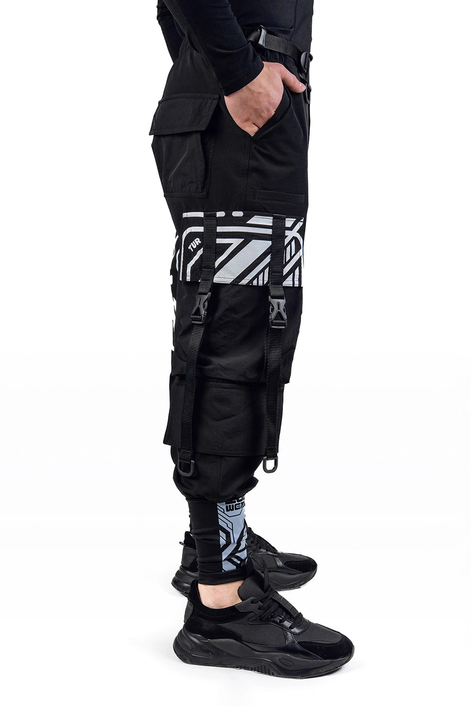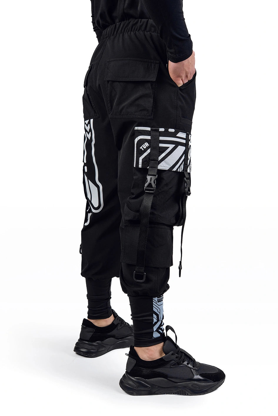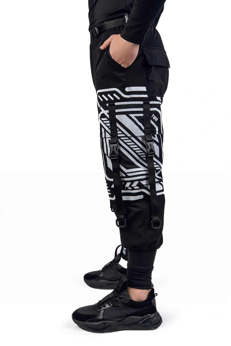Cargo-Hose mit geradem Schnitt, die eine Neuauflage des Modells Yoshida im Rahmen des Reborn-Konzepts darstellt. Das Modell bewahrt die DNA der ersten Cargo-Hosen mit Prints und interpretiert sie im Cyberpunk-Stil neu. Die Passform wird durch den elastischen Bund sowie das doppelte Gurtsystem reguliert. Die Konstruktion umfasst sieben funktionale Taschen: zwei obere Eingrifftaschen, eine separate Tasche für ein Smartphone, zwei geräumige Seitentaschen mit Fastex-Verschlüssen und Bandverstellung sowie zwei hintere Taschen mit Klettklappen. Die aufgesetzten Taschen bestehen aus Stoff mit „Crash“-Effekt. Unter der rechten Tasche befindet sich eine dekorative Klappe, die eine zusätzliche visuelle Ebene schafft. Unter dem Bund auf der rechten Seite befindet sich ein D-Ring für Accessoires. Der Saum der Hosenbeine ist mit hohen elastischen Bündchen aus Nylon versehen, die die Form und Passform halten. Das Modell wird durch Prints im Cyberpunk-Stil mit firmeneigenen Hieroglyphen „Rüstung des modernen Samurai“ ergänzt. Die Hose bildet ein akzentuierendes Element im Outfit und passt zur Ästhetik von Cyberpunk, Urban Samurai und Darkwear.
