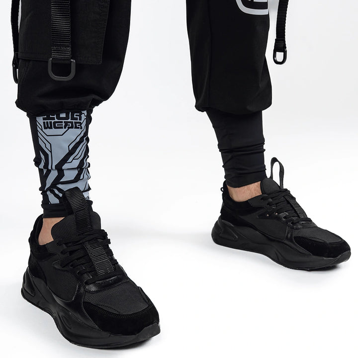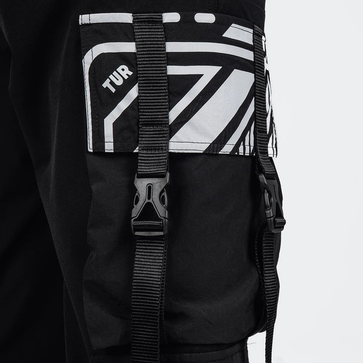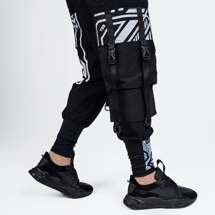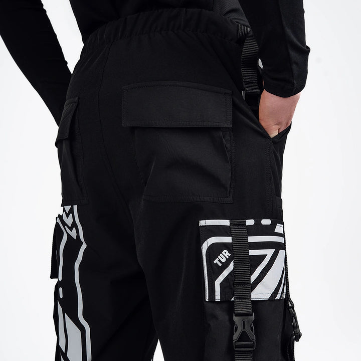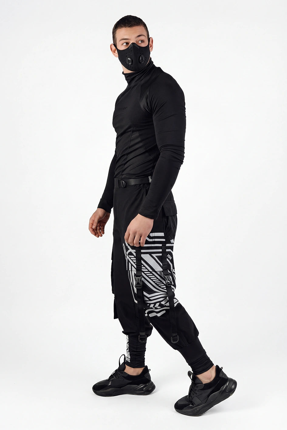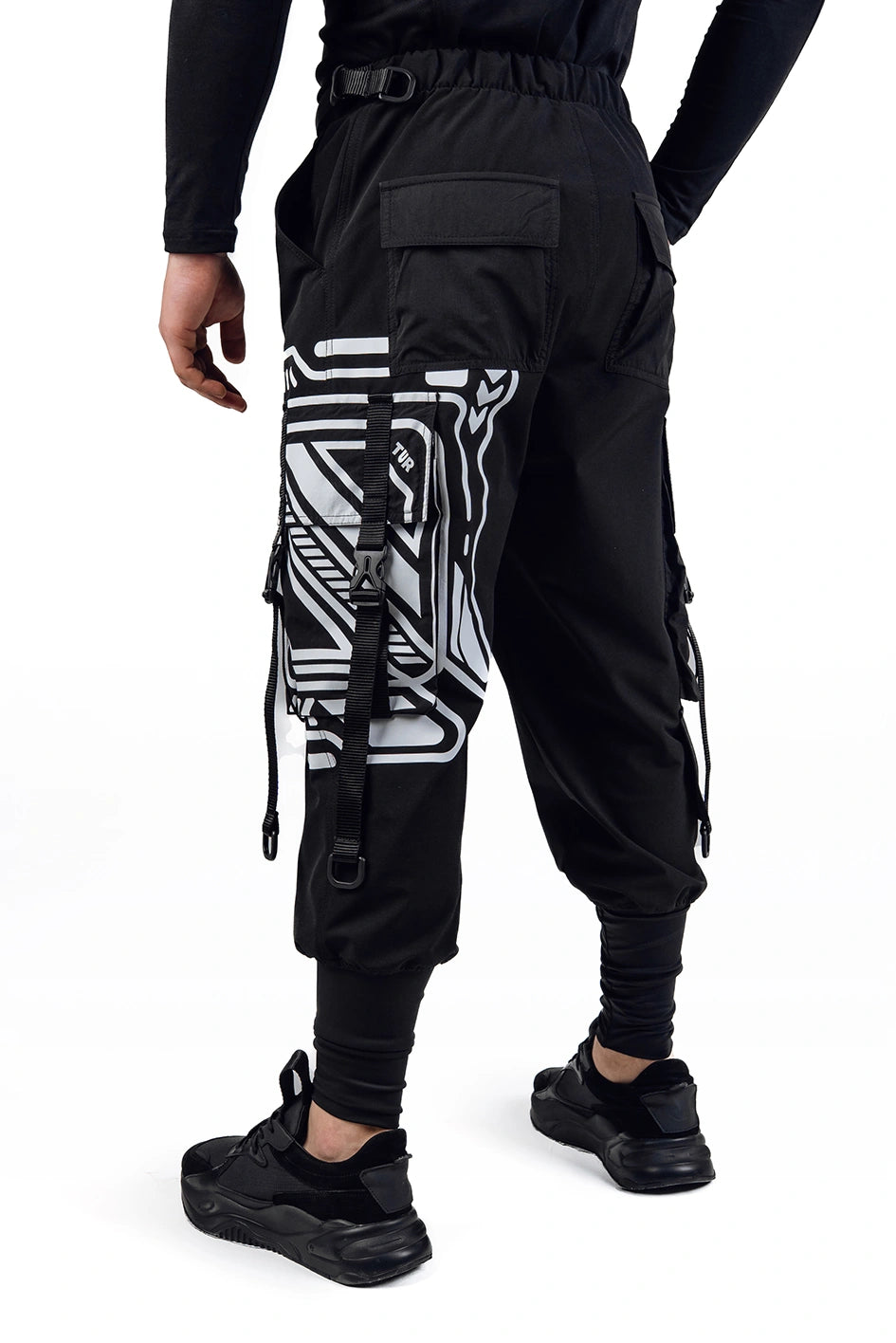Cargo-Hose mit geradem Schnitt, die eine Neuauflage des Modells Yoshida im Rahmen des Reborn-Konzepts darstellt. Das Modell bewahrt die DNA der ersten Cargo-Hosen mit Prints und interpretiert sie im Cyberpunk-Stil neu. Die Passform wird durch den elastischen Bund sowie das doppelte Gurtsystem reguliert. Die Konstruktion umfasst sieben funktionale Taschen: zwei obere Eingrifftaschen, eine separate Tasche für ein Smartphone, zwei geräumige Seitentaschen mit Fastex-Verschlüssen und Bandverstellung sowie zwei hintere Taschen mit Klettklappen. Die aufgesetzten Taschen bestehen aus Stoff mit „Crash“-Effekt. Unter der rechten Tasche befindet sich eine dekorative Klappe, die eine zusätzliche visuelle Ebene schafft. Unter dem Bund auf der rechten Seite befindet sich ein D-Ring für Accessoires. Der Saum der Hosenbeine ist mit hohen elastischen Bündchen aus Nylon versehen, die die Form und Passform halten. Das Modell wird durch Prints im Cyberpunk-Stil mit firmeneigenen Hieroglyphen „Rüstung des modernen Samurai“ ergänzt. Die Hose bildet ein akzentuierendes Element im Outfit und passt zur Ästhetik von Cyberpunk, Urban Samurai und Darkwear.