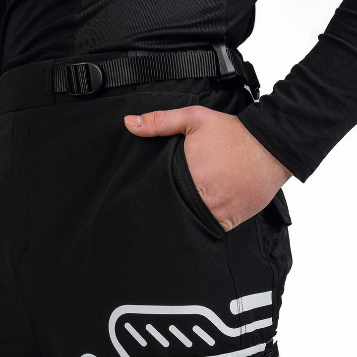 Der Hauptstoff ist technisches Nylon mit vierseitiger Elastizität. Das Material hat eine körnige Textur, eine matte Oberfläche sowie eine dichte, aber elastische Struktur. Auf der Innenseite ist der Stoff weich und angenehm für den Körper, im Gefühl ähnlich wie Strickware. Das Material hält gut die Form, schränkt die Bewegungen nicht ein und hält intensiver täglicher Nutzung stand. Die DWR-Beschichtung sorgt für grundlegenden Schutz vor Feuchtigkeit und Schmutz — Tropfen werden nicht aufgenommen, sondern bleiben auf der Oberfläche. Zusätzliche Elemente bestehen aus Nylonstoff mit „Crash“-Effekt, der eine gekräuselte Struktur hat und die Verschleißfestigkeit an stark beanspruchten Stellen erhöht. Im Produkt wird ein YKK-Reißverschluss verwendet, der Zuverlässigkeit und eine reibungslose Funktion gewährleistet. Der Bund ist mit einem elastischen Band für eine adaptive Passform sowie einem integrierten Gürtel mit beidseitiger Verstellung ausgestattet. An den Seiten befinden sich Haken zur Befestigung des Gürtels. Unter dem Bund befindet sich ein D-Ring zum Befestigen von Accessoires oder Karabinern.