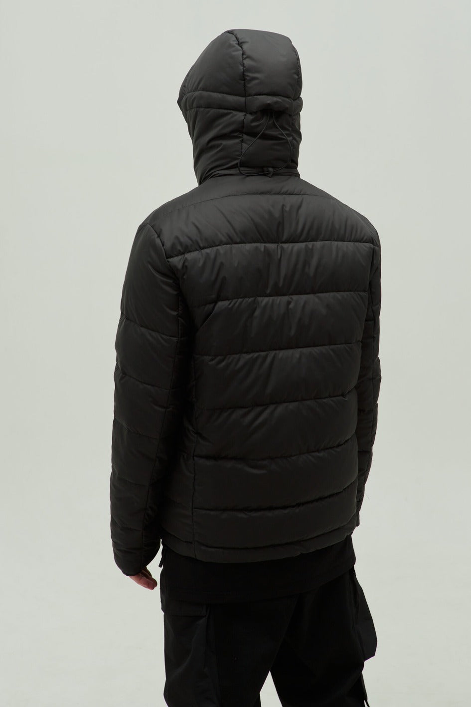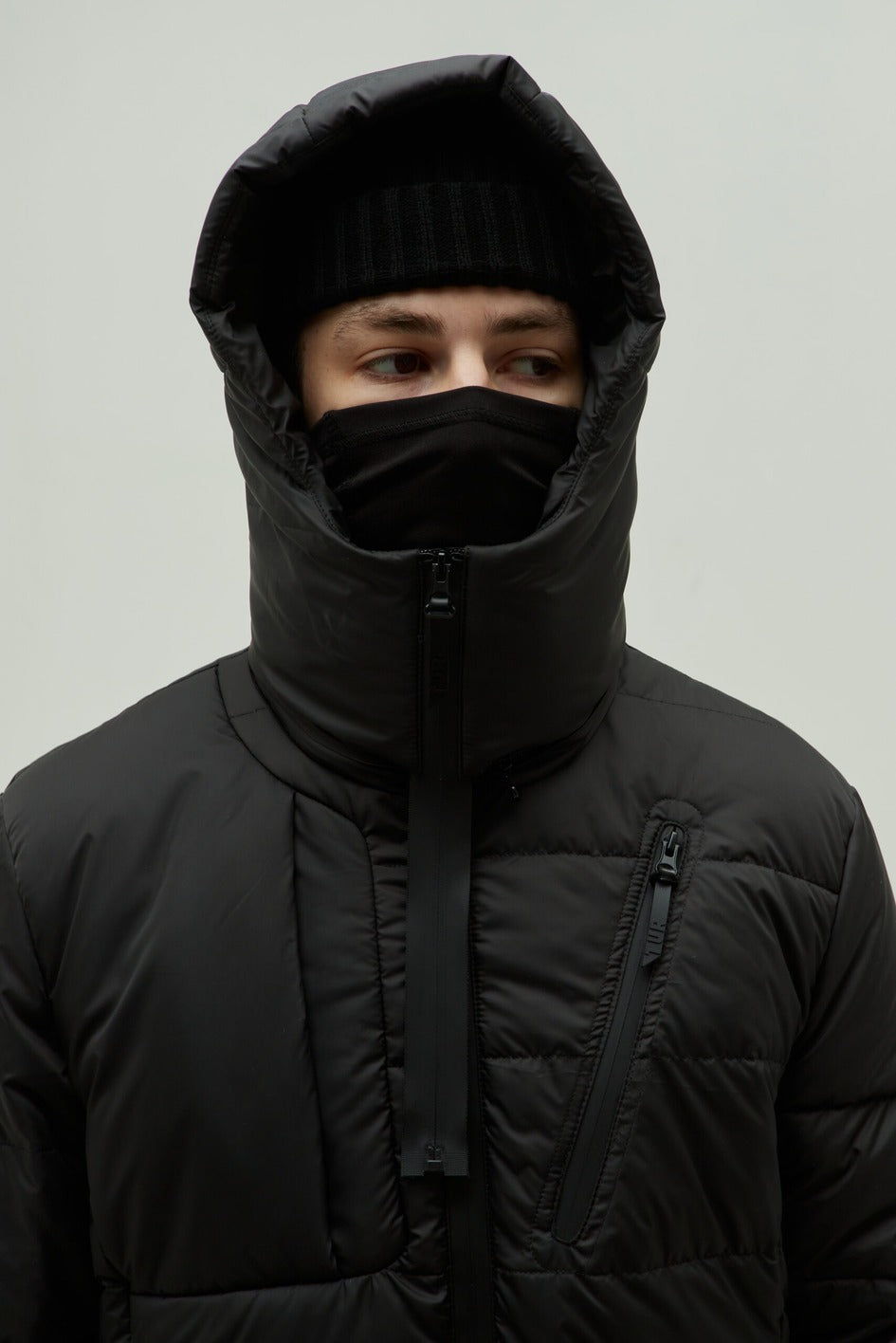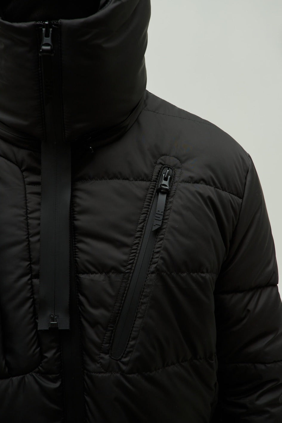 Jacke mit geradem Schnitt, mittlerer Länge. Abnehmbarer, verstellbarer Kapuzenkragen. Zwei Taschen auf der Vorderseite: eine mit schrägem, wasserfestem Reißverschluss, die andere unter einer Klappe. An den Seiten zwei Taschen mit verdeckten Reißverschlüssen. Innen eine Tasche. Innenfutter auf der Innenseite. Der Saum der Jacke ist mit Gummizug und Verschlüssen versehen.