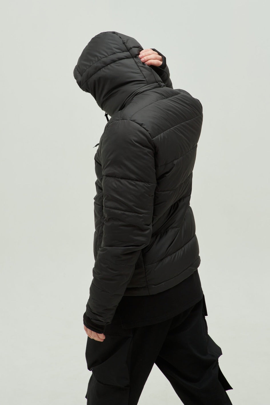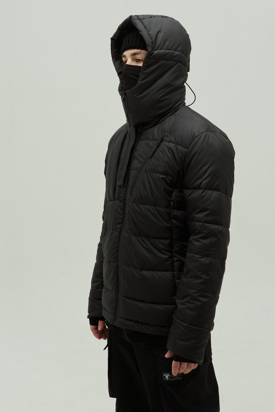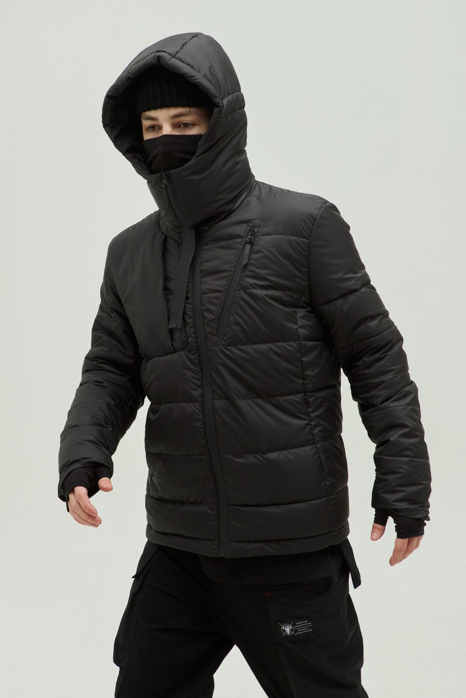 Jacke mit geradem Schnitt, mittlerer Länge. Abnehmbarer, verstellbarer Kapuzenkragen. Zwei Taschen auf der Vorderseite: eine mit schrägem, wasserfestem Reißverschluss, die andere unter einer Klappe. An den Seiten zwei Taschen mit verdeckten Reißverschlüssen. Innen eine Tasche. Innenfutter auf der Innenseite. Der Saum der Jacke ist mit Gummizug und Verschlüssen versehen.