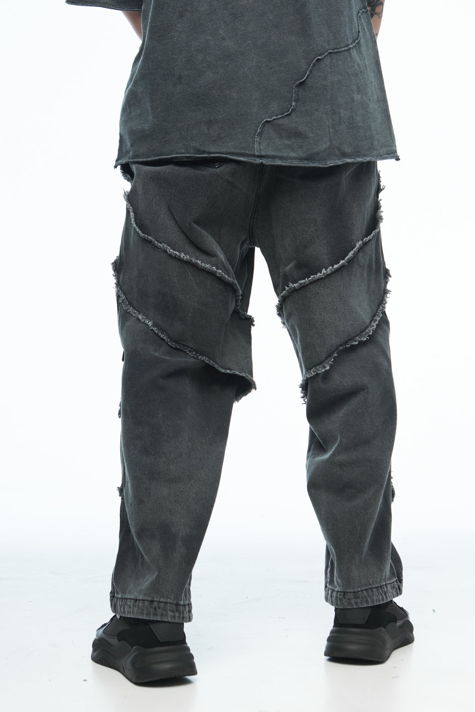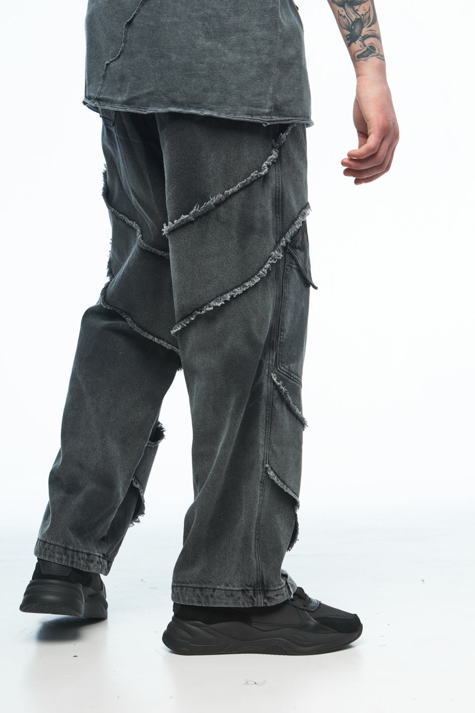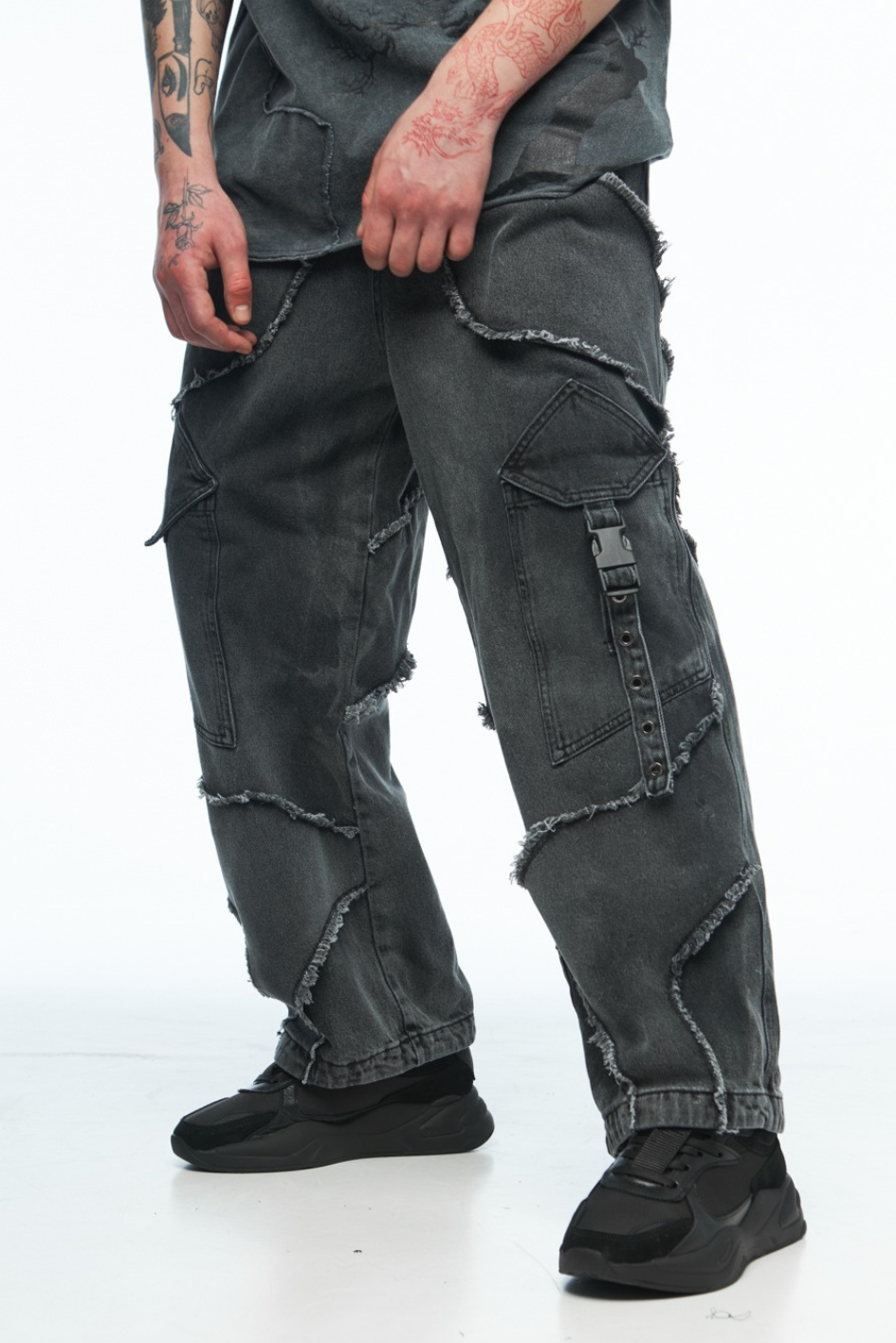 Gekochte, lockere Jeans mit betonten Nähten. Mit Reißverschluss und Knopf vorne zu schließen. Sie haben sechs Taschen: Vorderaschen, seitliche aufgenähte Taschen auf Hüfthöhe und aufgenähte Taschen hinten.