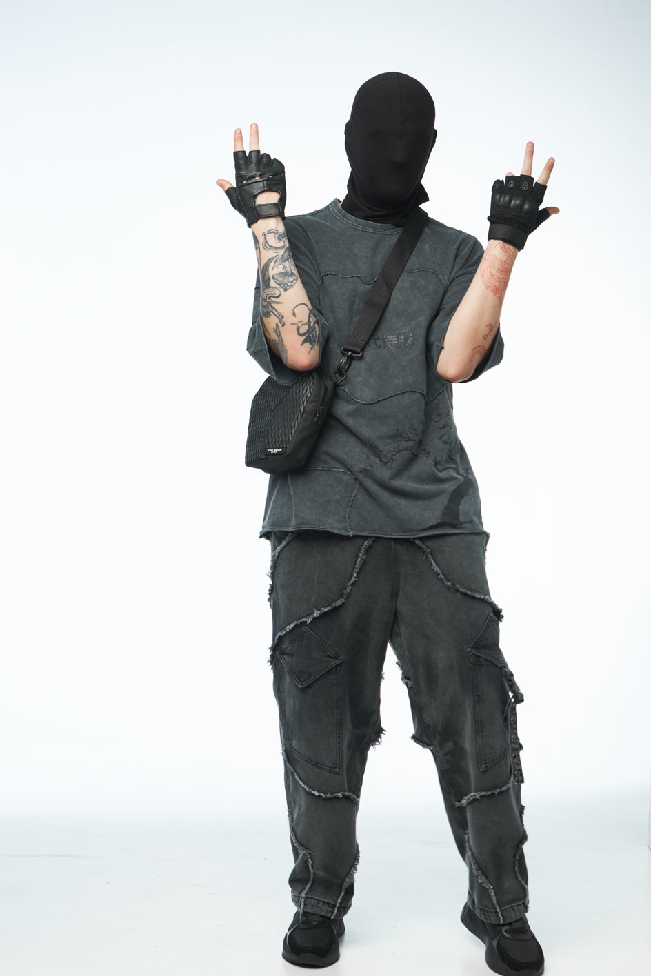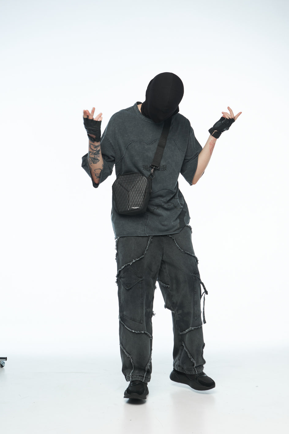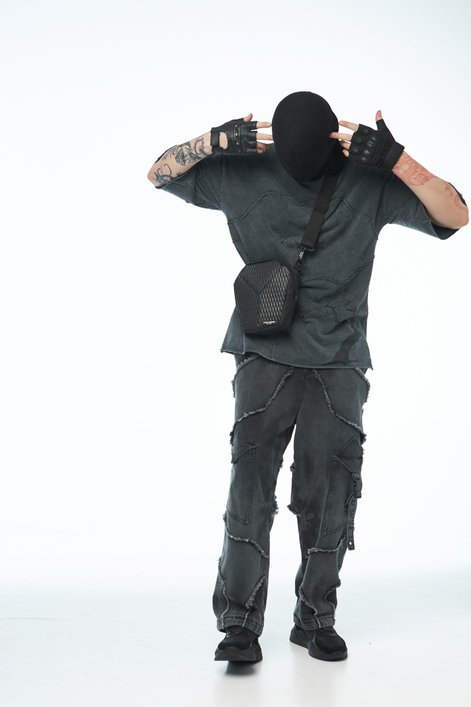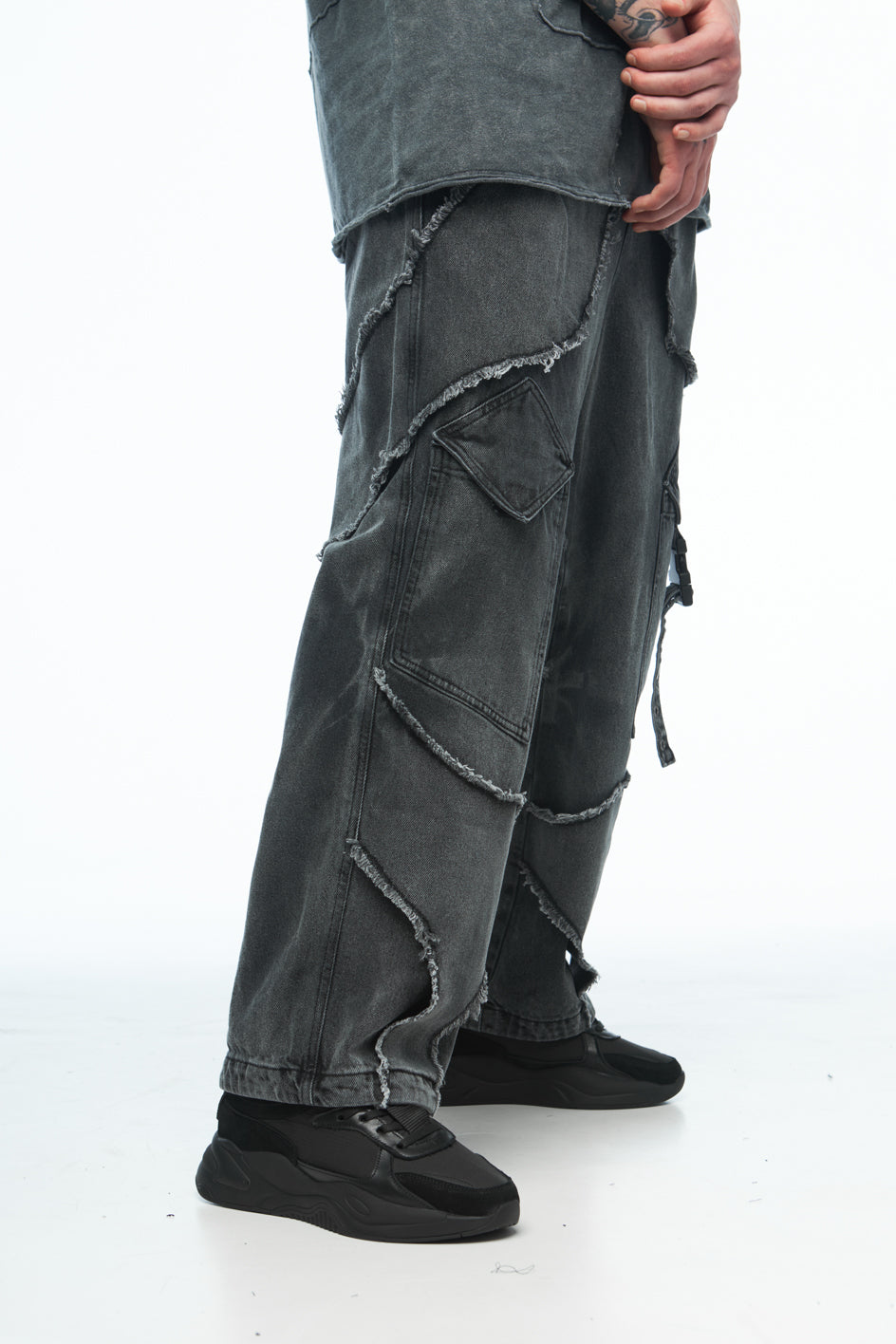 Gekochte, lockere Jeans mit betonten Nähten. Mit Reißverschluss und Knopf vorne zu schließen. Sie haben sechs Taschen: Vorderaschen, seitliche aufgenähte Taschen auf Hüfthöhe und aufgenähte Taschen hinten.