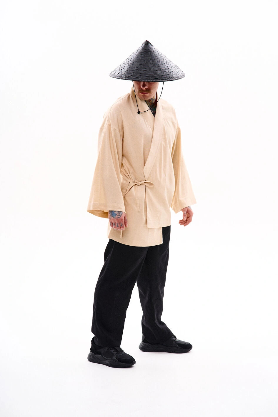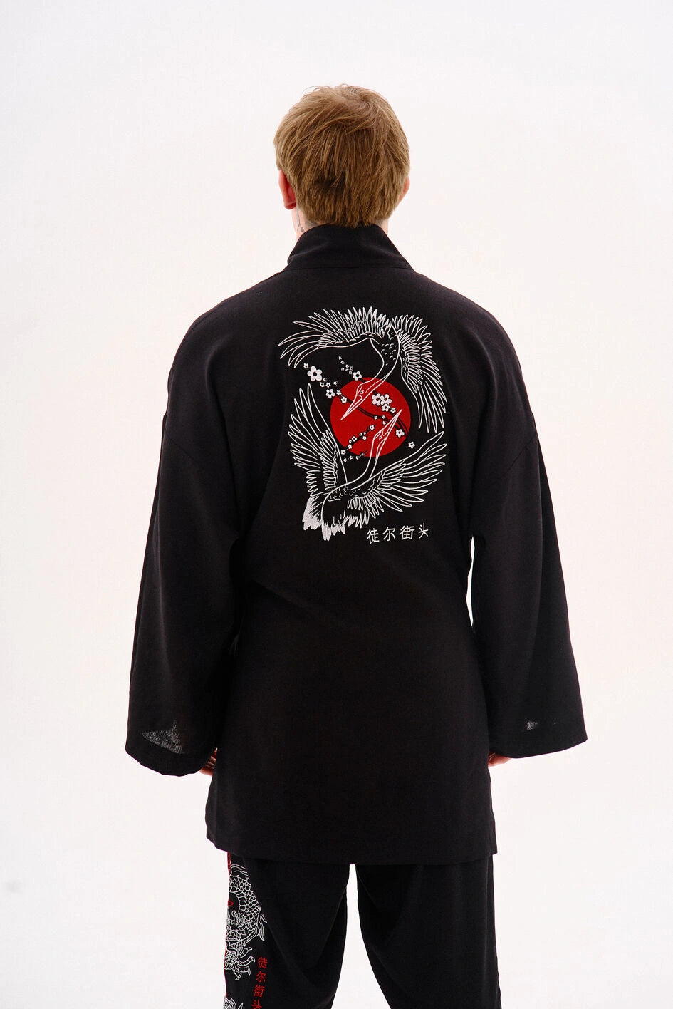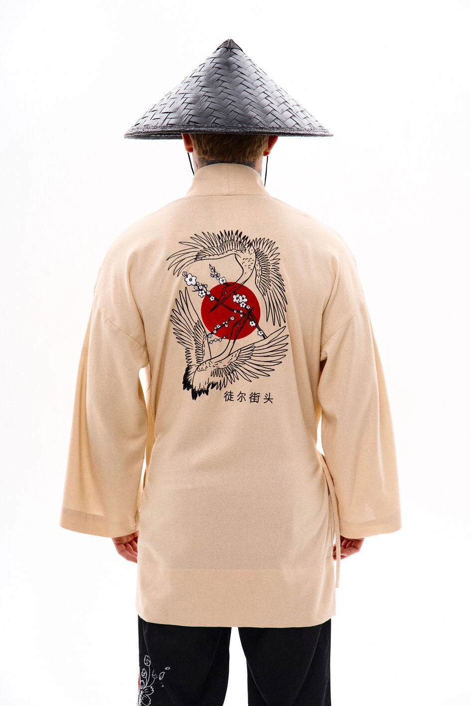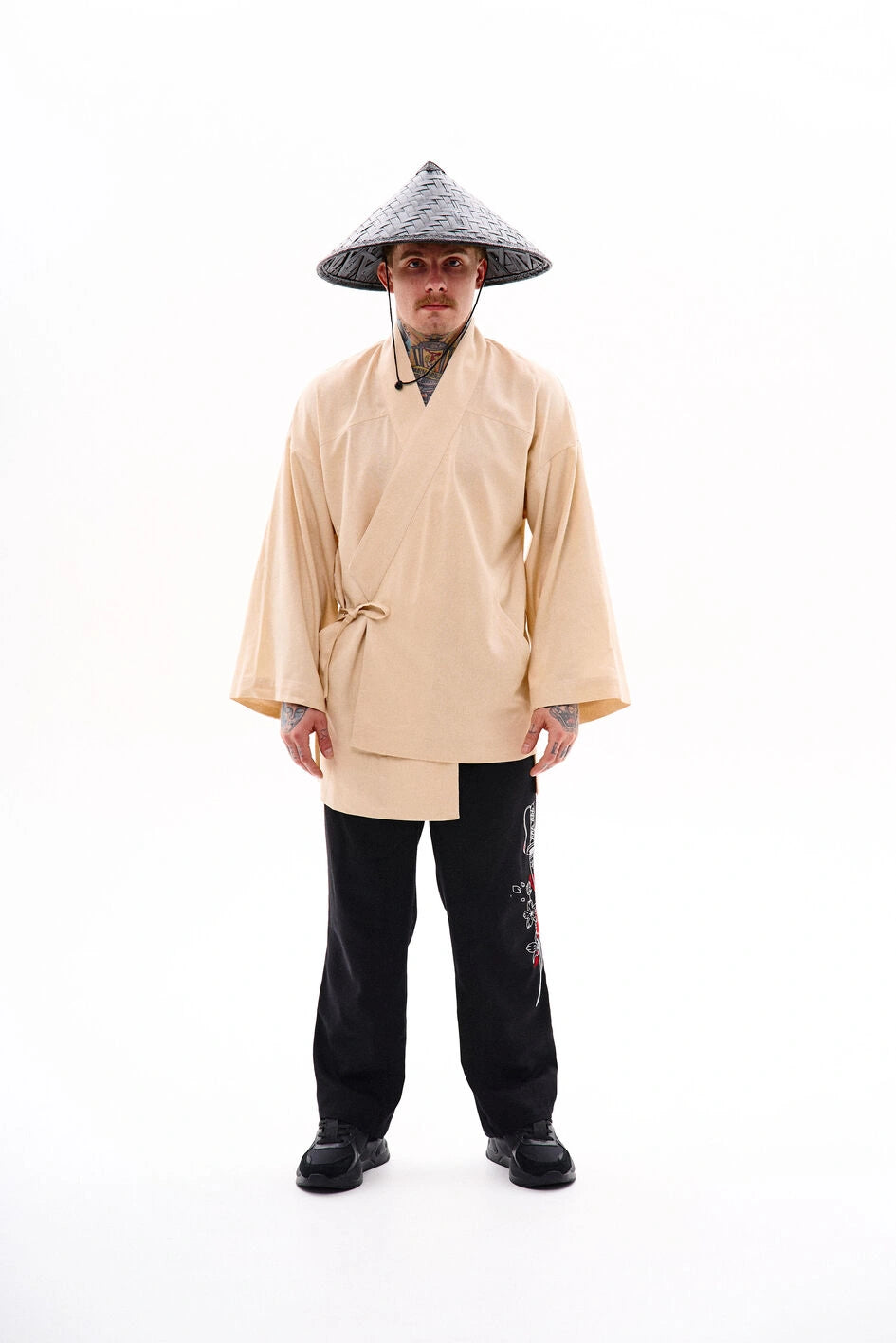 Oversize-Kimono aus Leinen, unter der Achsel mit einem Band fixiert. Mit dekorativen Nähten, zwei Taschen und abnehmbaren Bändern an den Ärmeln für einen visuellen Effekt. Auf der Rückseite befindet sich eine Stickerei im japanischen Stil. Erhältlich in zwei Farben. Passt perfekt zu Leinenhosen „Murakami“ oder Hosen „Yamaguchi“.
