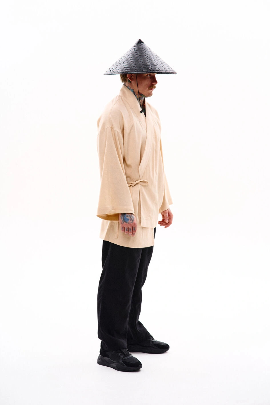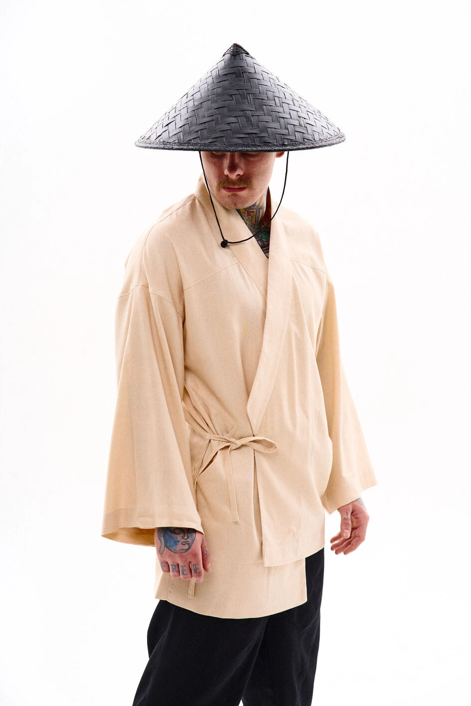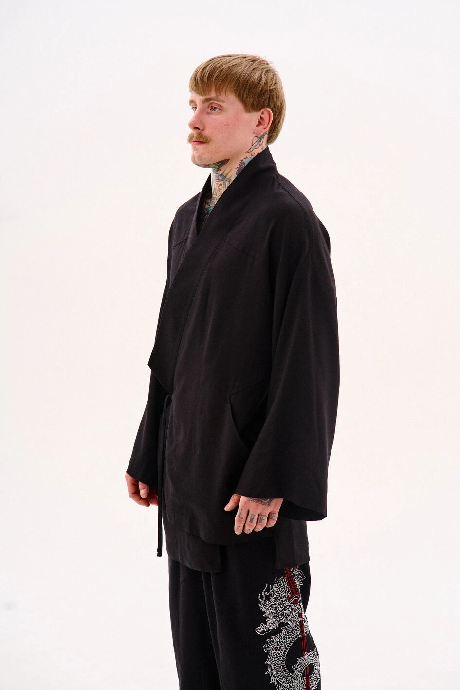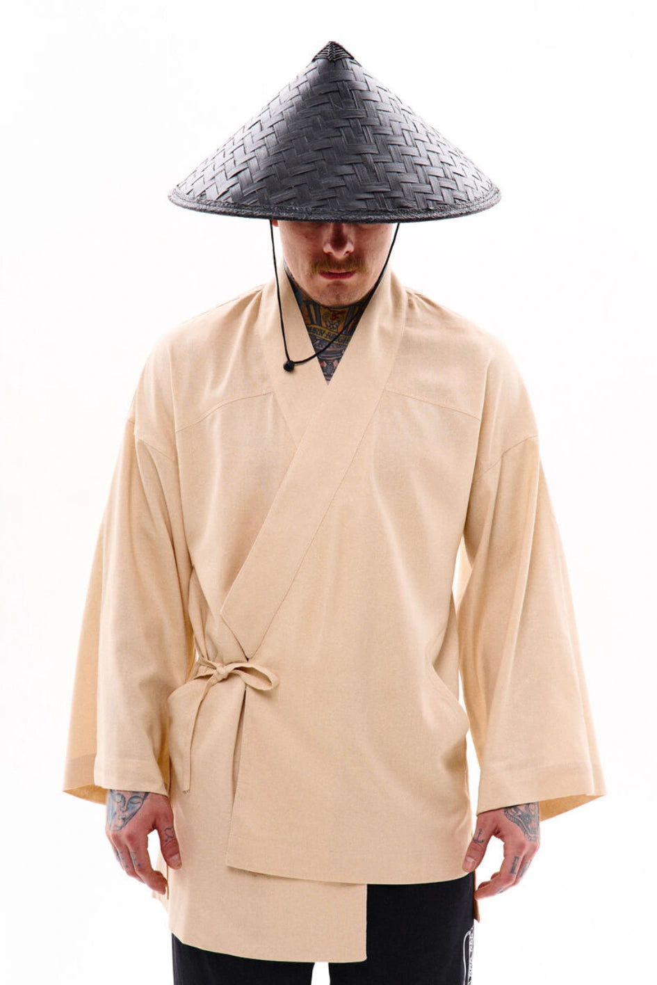 Oversize-Kimono aus Leinen, unter der Achsel mit einem Band fixiert. Mit dekorativen Nähten, zwei Taschen und abnehmbaren Bändern an den Ärmeln für einen visuellen Effekt. Auf der Rückseite befindet sich eine Stickerei im japanischen Stil. Erhältlich in zwei Farben. Passt perfekt zu Leinenhosen „Murakami“ oder Hosen „Yamaguchi“.
