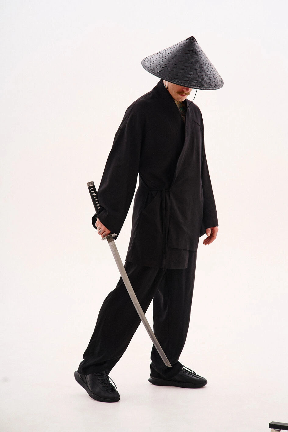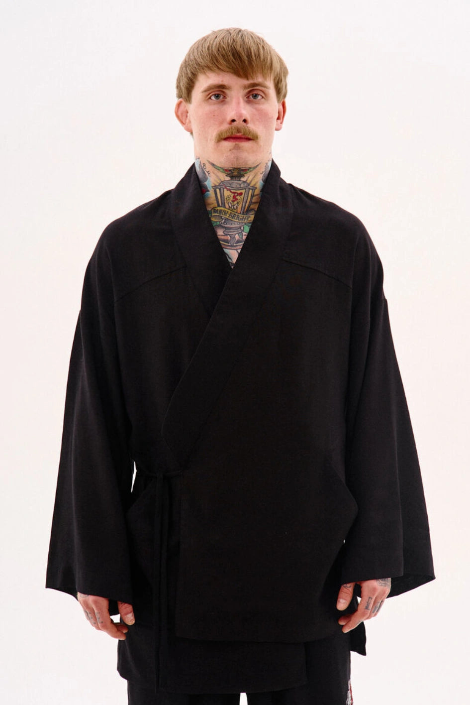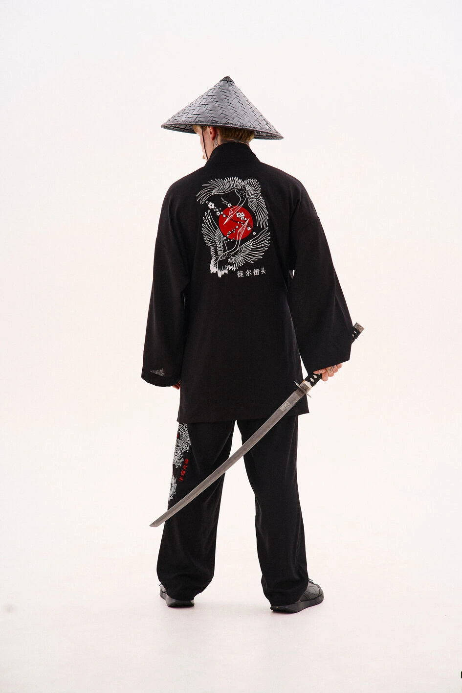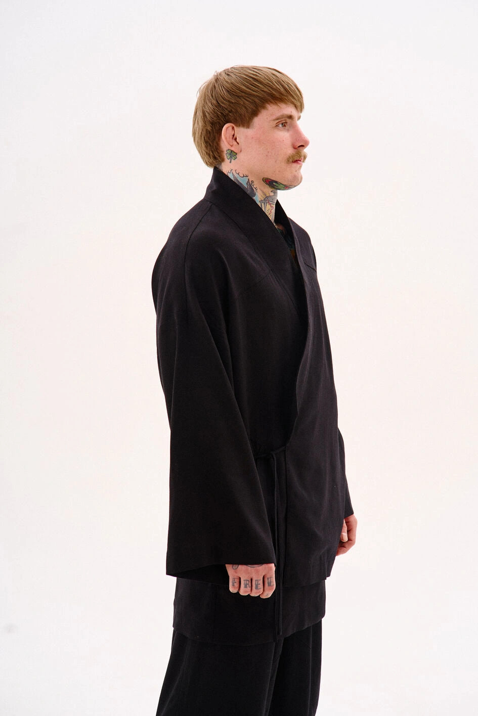 Oversize-Kimono aus Leinen, unter der Achsel mit einem Band fixiert. Mit dekorativen Nähten, zwei Taschen und abnehmbaren Bändern an den Ärmeln für einen visuellen Effekt. Auf der Rückseite befindet sich eine Stickerei im japanischen Stil. Erhältlich in zwei Farben. Passt perfekt zu Leinenhosen „Murakami“ oder Hosen „Yamaguchi“.