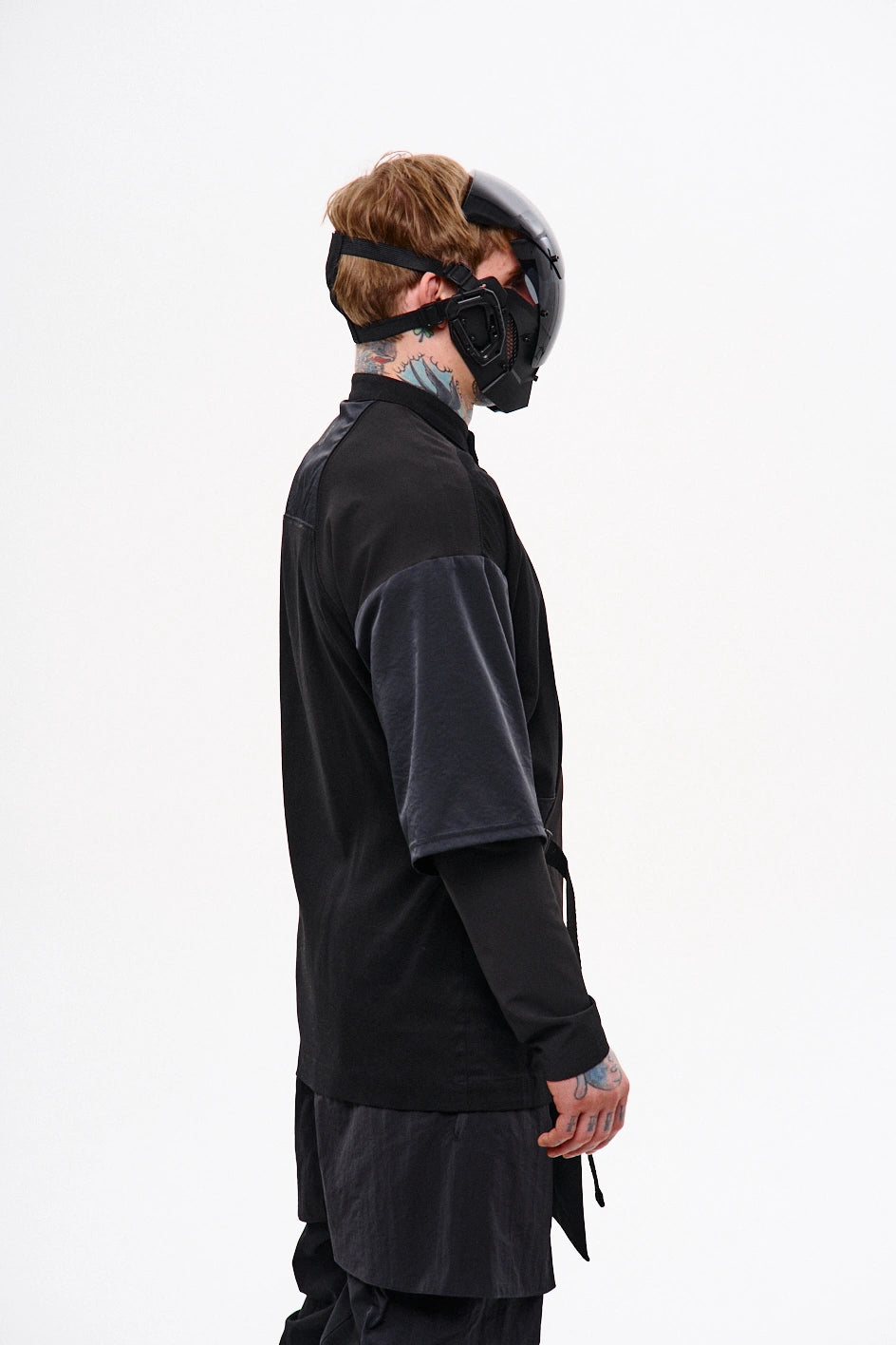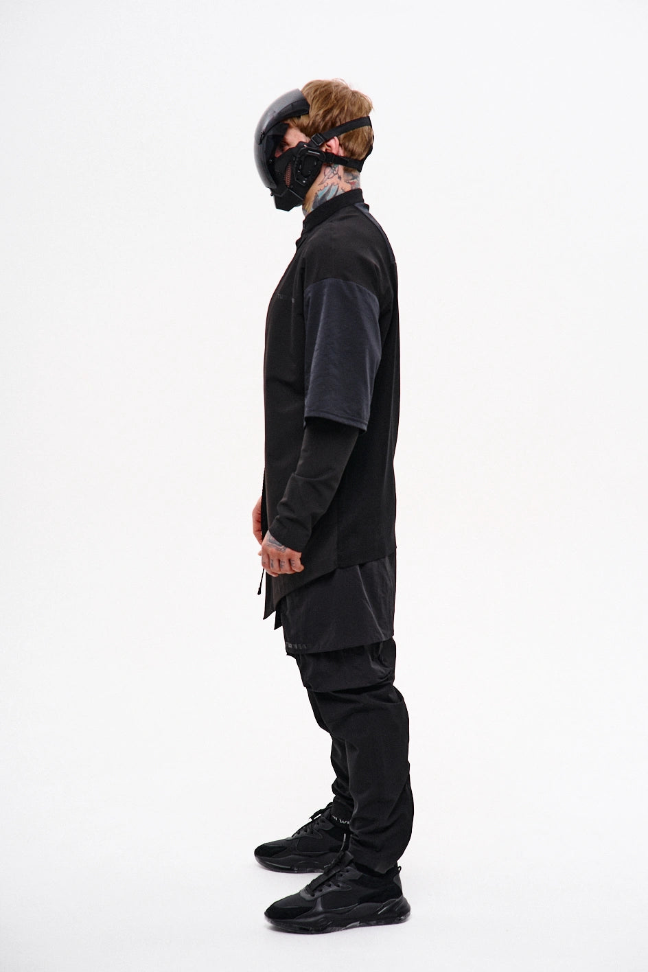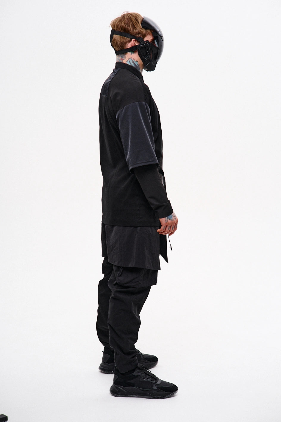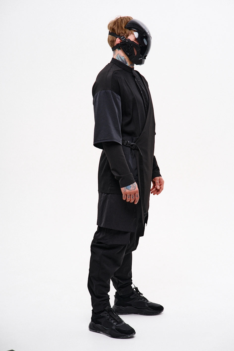 Longsleeve, der Elemente eines Hemdes, Kimonos und klassischen Longsleeves vereint. Ein Teil des Produkts ist aus Leinen gefertigt und verfügt über einen Stehkragen mit Knopfverschluss. Die asymmetrische Blende, die die Vorderseite des Kleidungsstücks bedeckt, wird mit Druckknöpfen geschlossen. Unter dem umklappbaren Teil befindet sich eine Reißverschlusstasche sowie eine Kängurutasche. Die Ärmel haben ein Kimono-Muster, aus dem die langen Ärmel hervorgehen. Die Nähte am Rücken, an der Passe und die horizontale Reliefnaht an der Blende sind mit einer Nähmaschine ohne Nähfaden gefertigt; die Nähte befinden sich auf beiden Seiten der Naht. Das Produkt ist universell und schlicht.