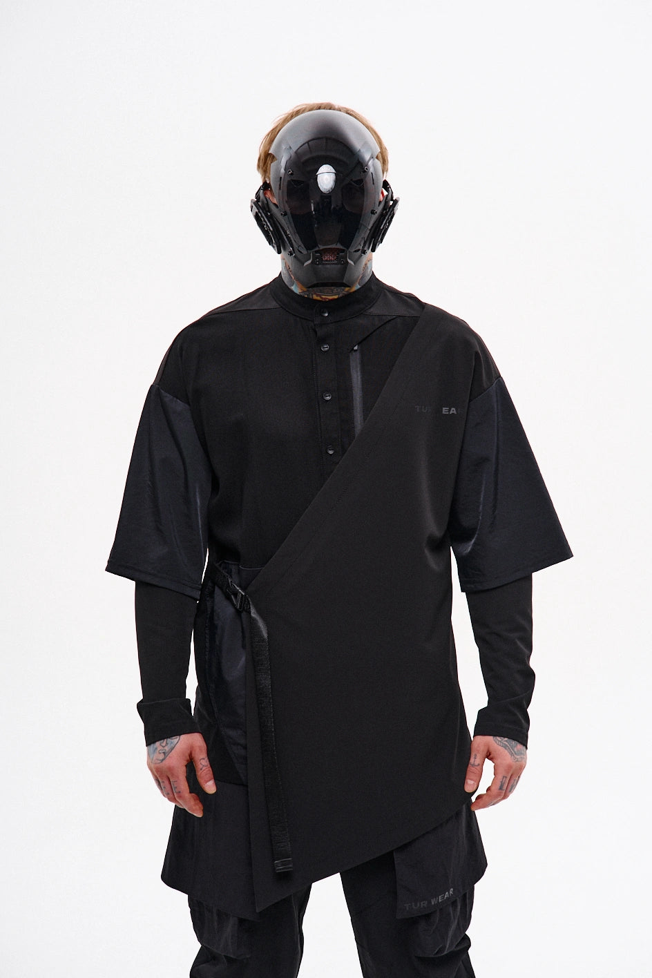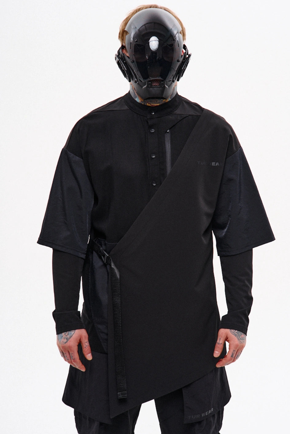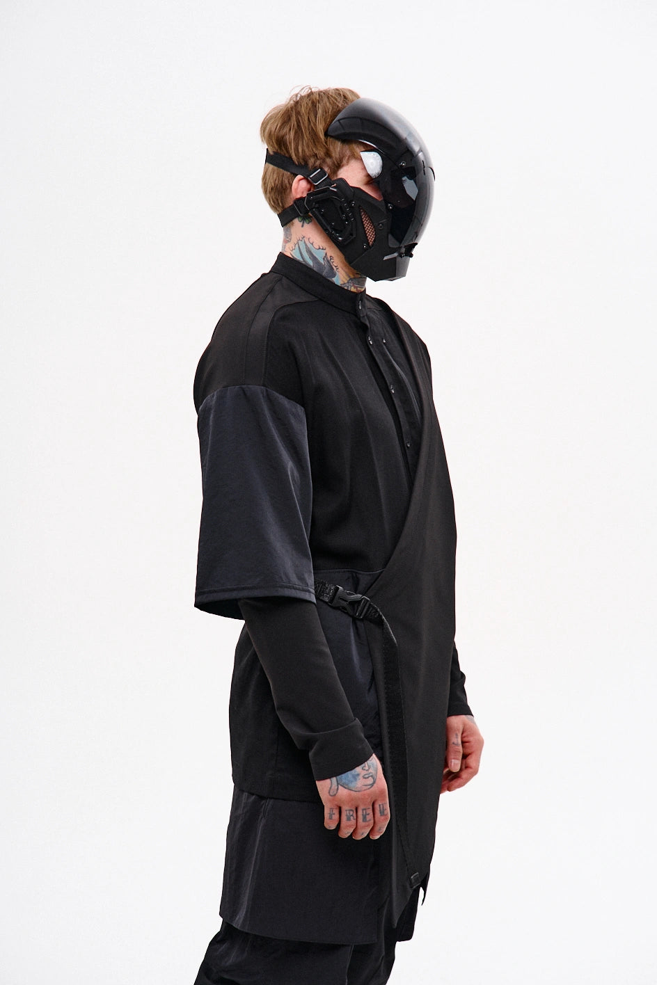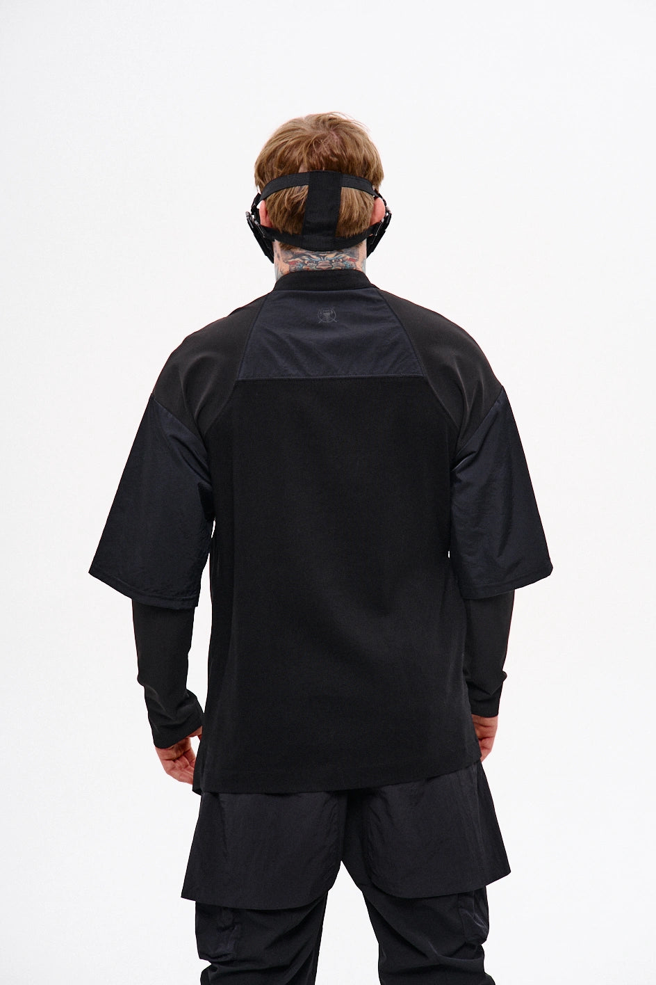 Longsleeve, der Elemente eines Hemdes, Kimonos und klassischen Longsleeves vereint. Ein Teil des Produkts ist aus Leinen gefertigt und verfügt über einen Stehkragen mit Knopfverschluss. Die asymmetrische Blende, die die Vorderseite des Kleidungsstücks bedeckt, wird mit Druckknöpfen geschlossen. Unter dem umklappbaren Teil befindet sich eine Reißverschlusstasche sowie eine Kängurutasche. Die Ärmel haben ein Kimono-Muster, aus dem die langen Ärmel hervorgehen. Die Nähte am Rücken, an der Passe und die horizontale Reliefnaht an der Blende sind mit einer Nähmaschine ohne Nähfaden gefertigt; die Nähte befinden sich auf beiden Seiten der Naht. Das Produkt ist universell und schlicht.