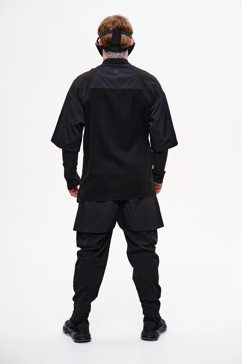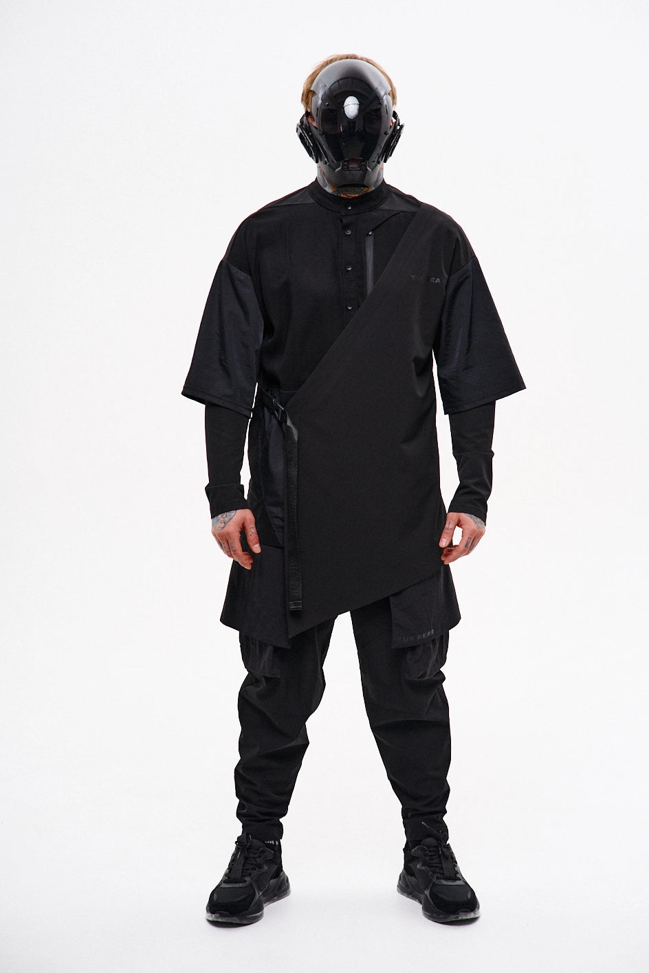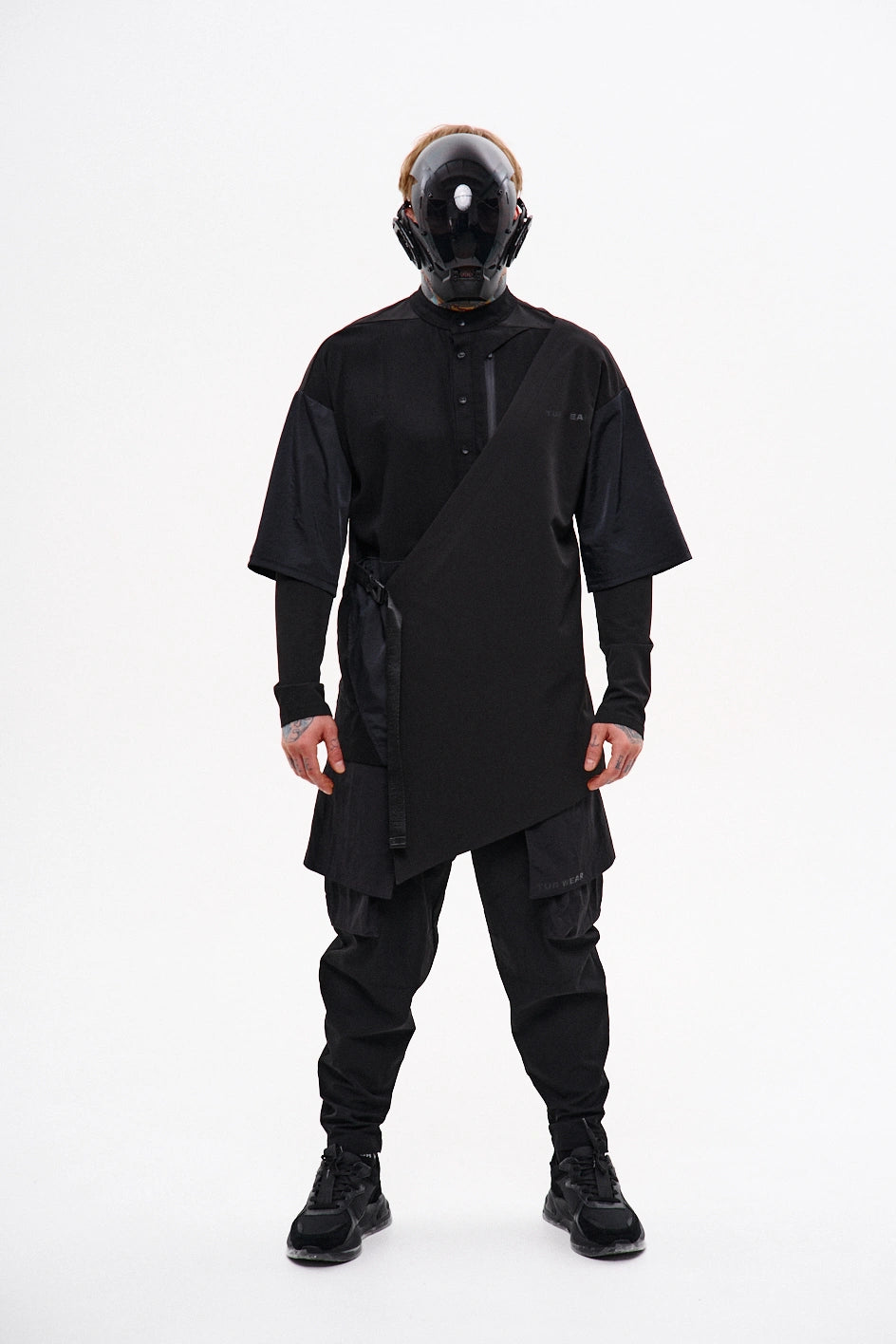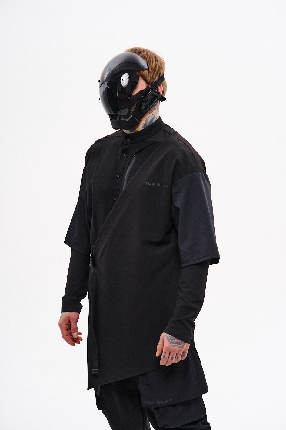 Longsleeve, der Elemente eines Hemdes, Kimonos und klassischen Longsleeves vereint. Ein Teil des Produkts ist aus Leinen gefertigt und verfügt über einen Stehkragen mit Knopfverschluss. Die asymmetrische Blende, die die Vorderseite des Kleidungsstücks bedeckt, wird mit Druckknöpfen geschlossen. Unter dem umklappbaren Teil befindet sich eine Reißverschlusstasche sowie eine Kängurutasche. Die Ärmel haben ein Kimono-Muster, aus dem die langen Ärmel hervorgehen. Die Nähte am Rücken, an der Passe und die horizontale Reliefnaht an der Blende sind mit einer Nähmaschine ohne Nähfaden gefertigt; die Nähte befinden sich auf beiden Seiten der Naht. Das Produkt ist universell und schlicht.