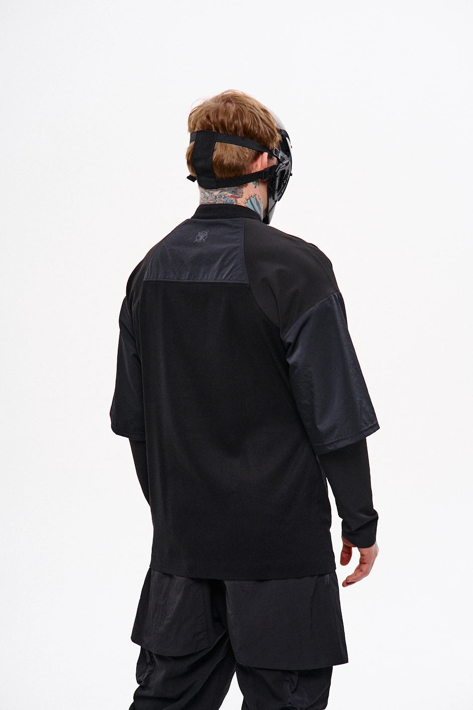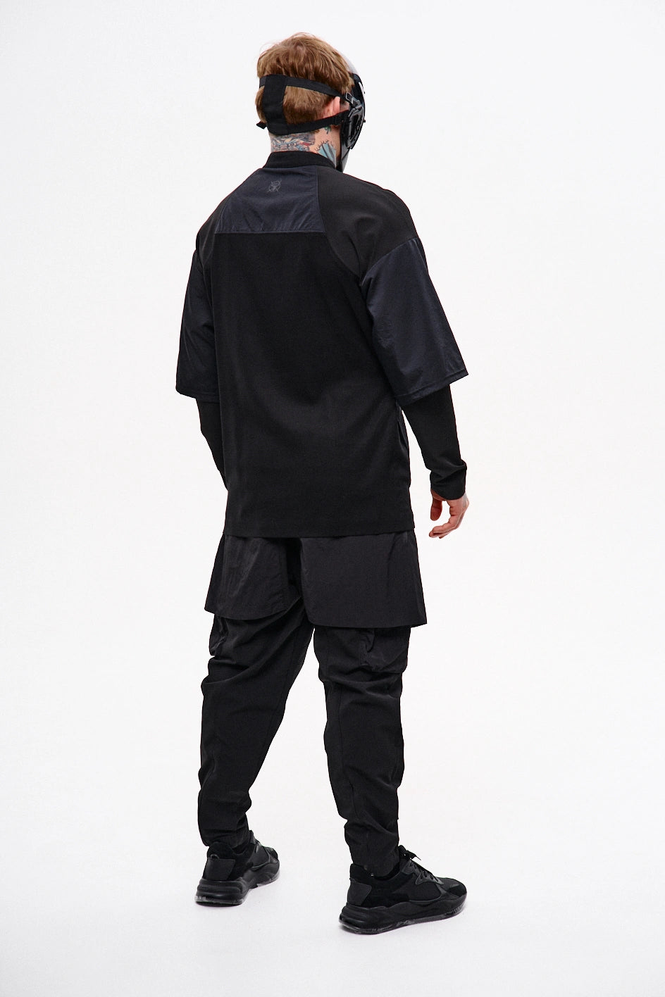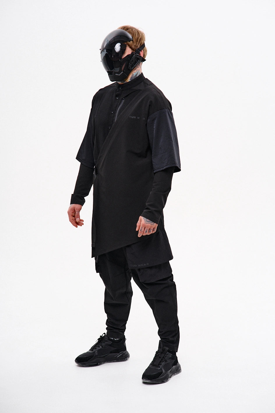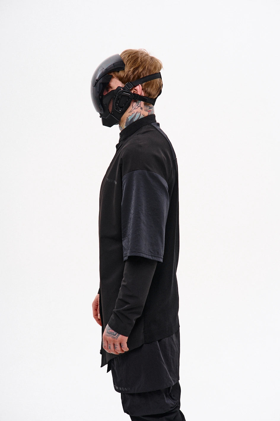 Longsleeve, der Elemente eines Hemdes, Kimonos und klassischen Longsleeves vereint. Ein Teil des Produkts ist aus Leinen gefertigt und verfügt über einen Stehkragen mit Knopfverschluss. Die asymmetrische Blende, die die Vorderseite des Kleidungsstücks bedeckt, wird mit Druckknöpfen geschlossen. Unter dem umklappbaren Teil befindet sich eine Reißverschlusstasche sowie eine Kängurutasche. Die Ärmel haben ein Kimono-Muster, aus dem die langen Ärmel hervorgehen. Die Nähte am Rücken, an der Passe und die horizontale Reliefnaht an der Blende sind mit einer Nähmaschine ohne Nähfaden gefertigt; die Nähte befinden sich auf beiden Seiten der Naht. Das Produkt ist universell und schlicht.
