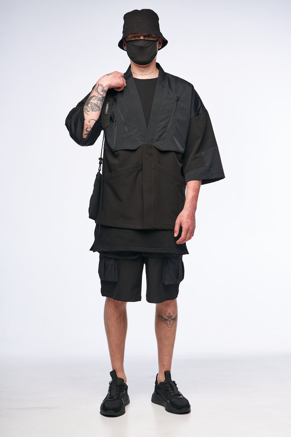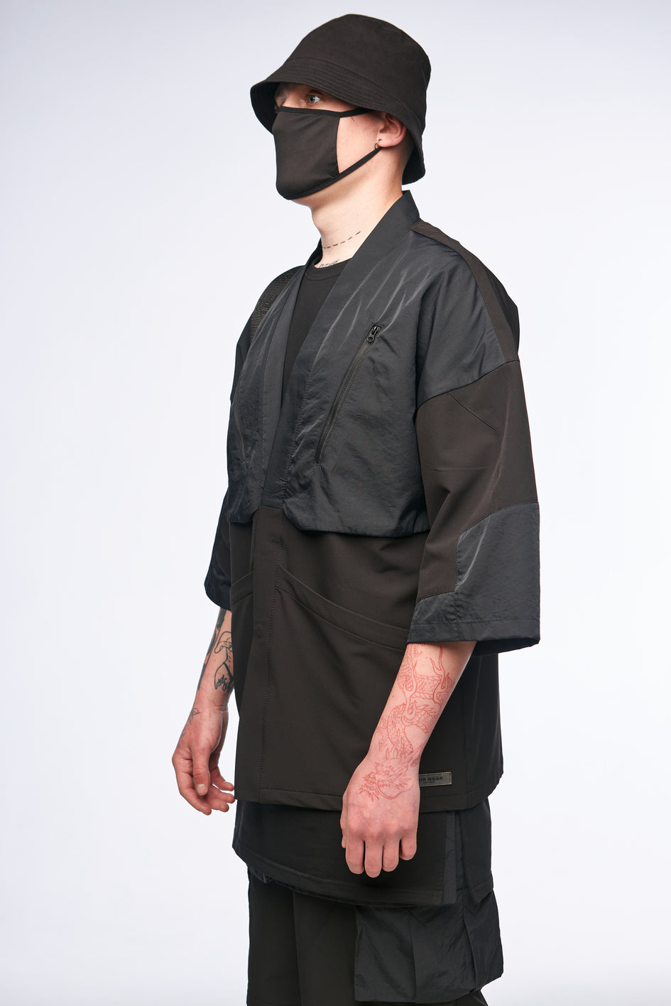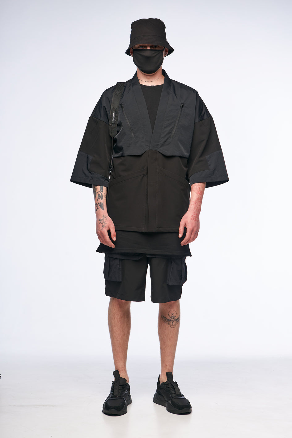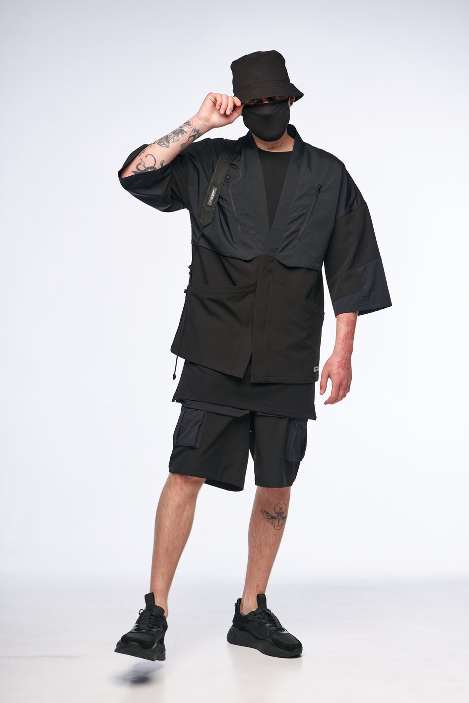 Kimono im Oversize-Schnitt. Obere aufgesetzte Taschen aus Ripstop-Gewebe mit Reißverschlussöffnung. Verschlüsse sind magnetisch.