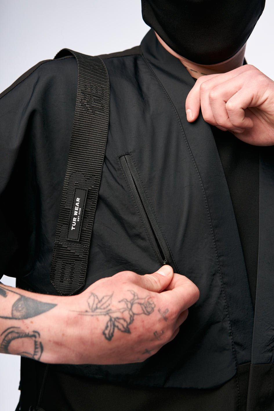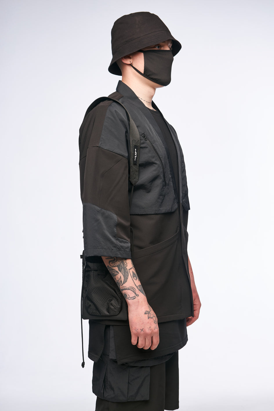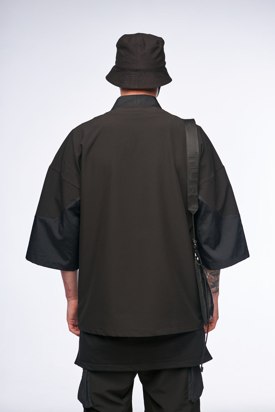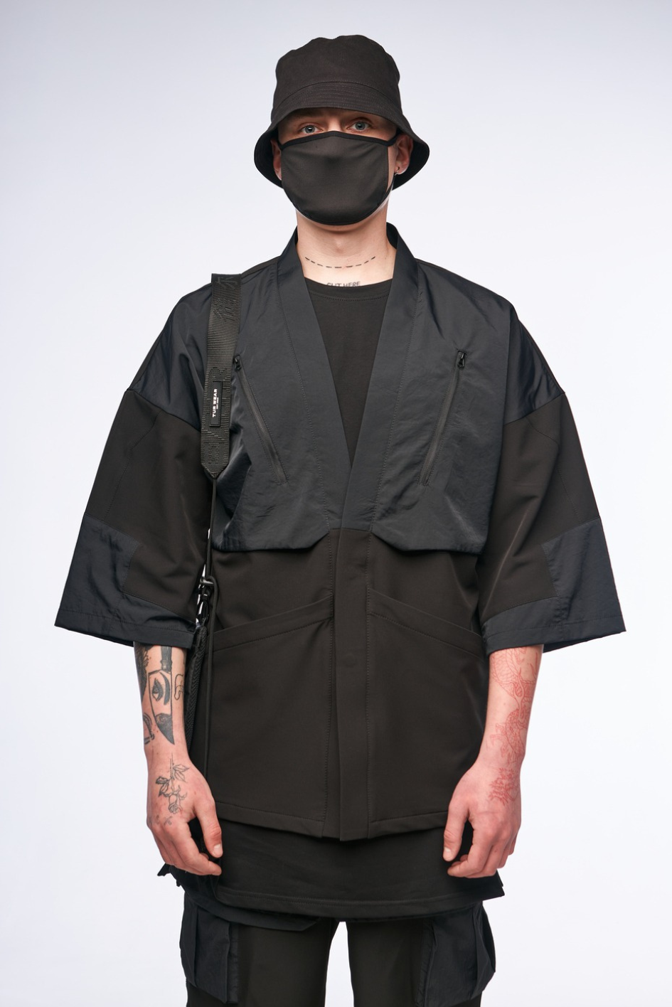 Kimono im Oversize-Schnitt. Obere aufgesetzte Taschen aus Ripstop-Gewebe mit Reißverschlussöffnung. Verschlüsse sind magnetisch.