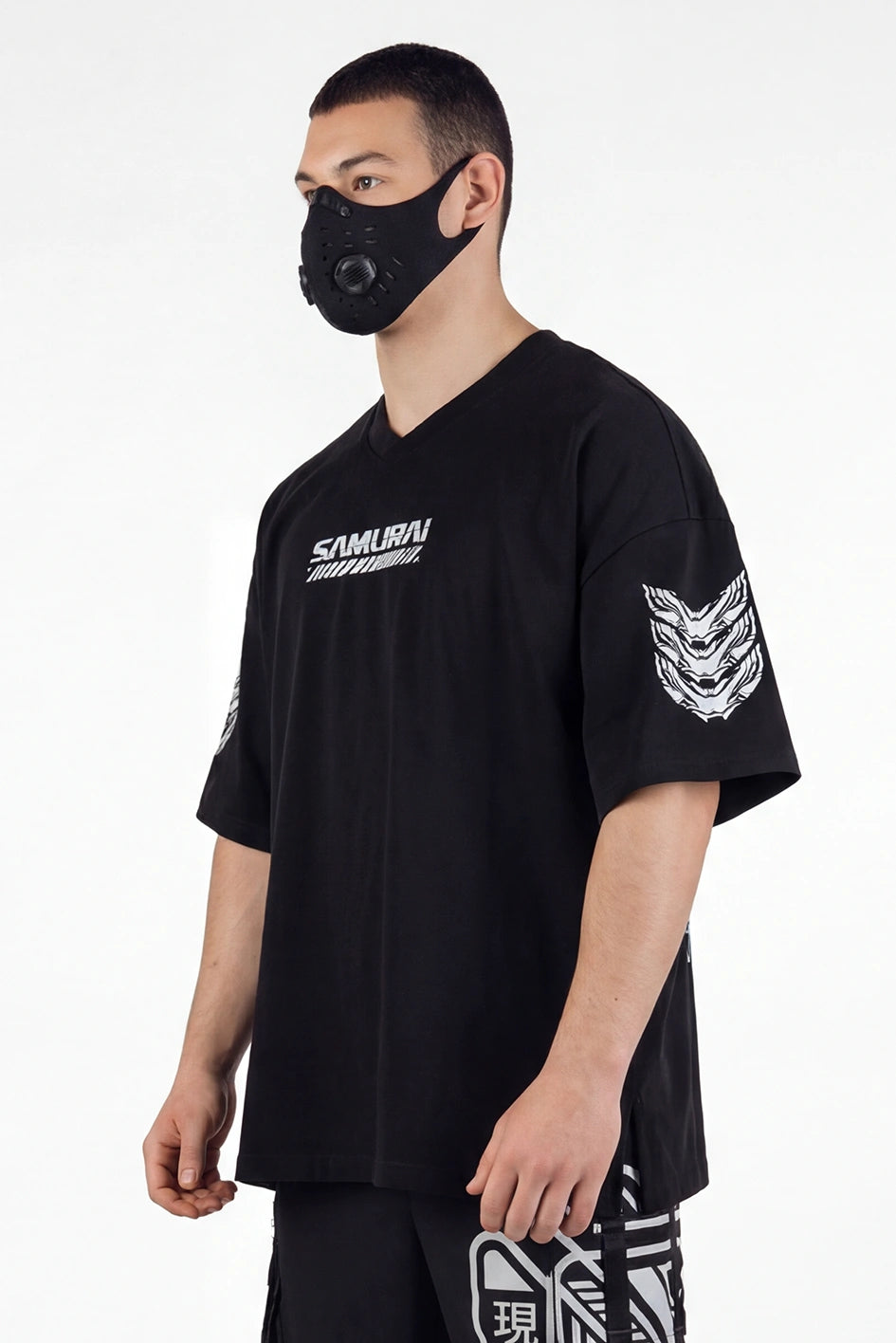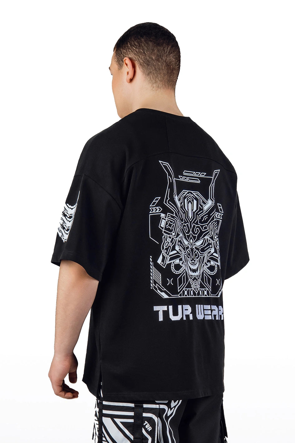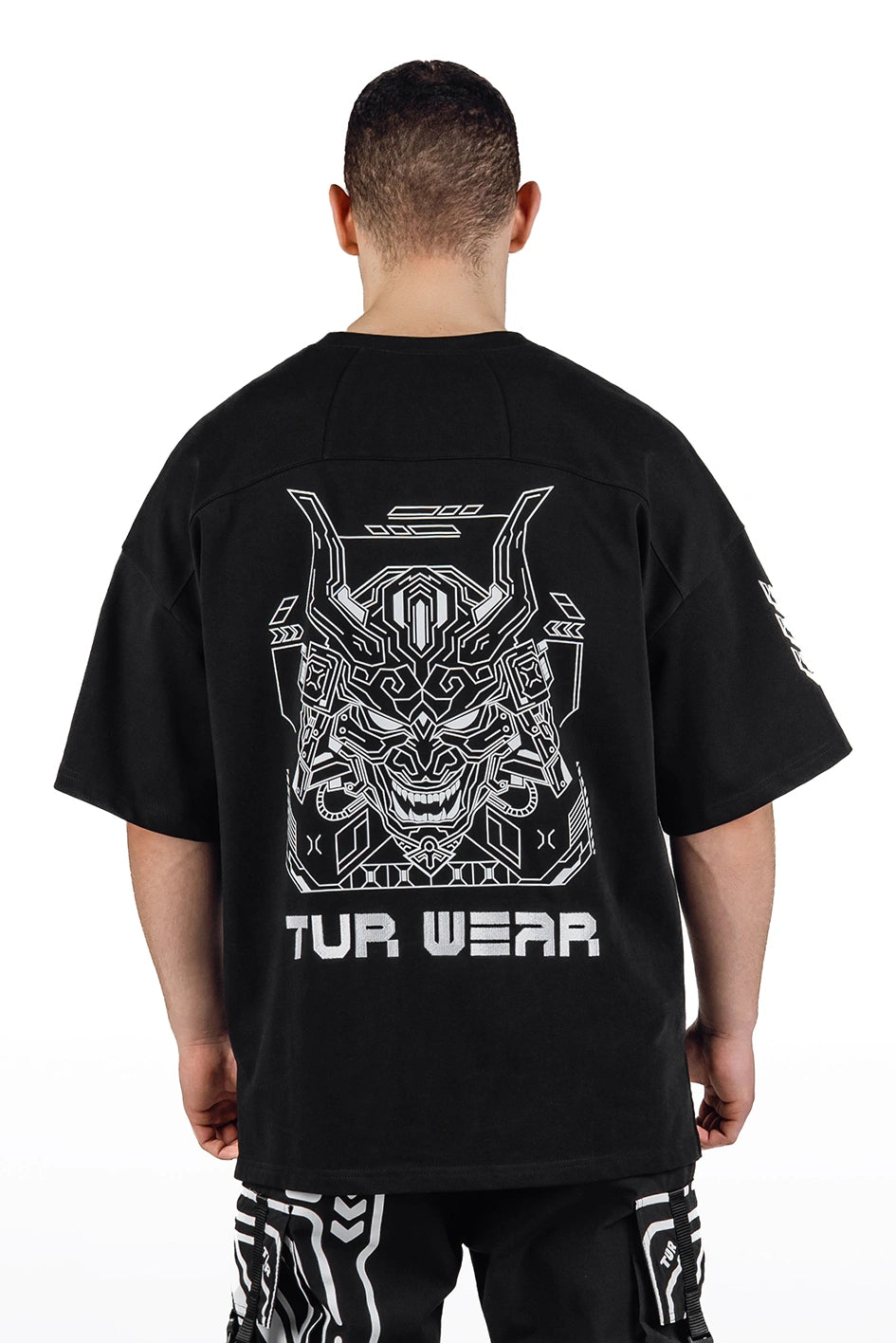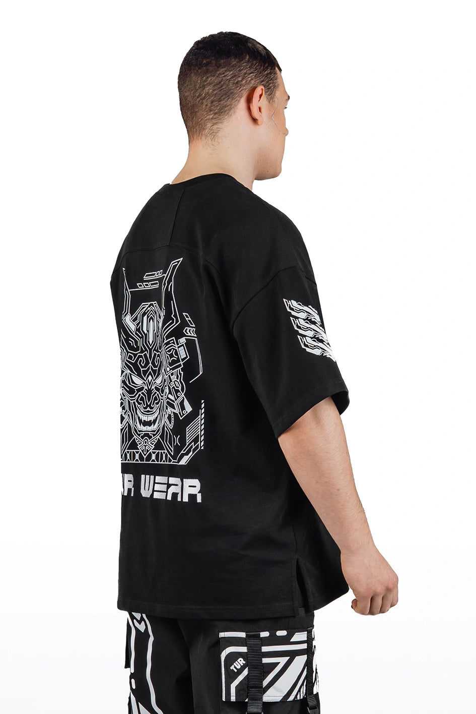 Oversize-T-Shirt mit verlängerter Silhouette und asymmetrischer Länge. Der Modellname Arasaka ist von der корпорації aus dem Universum Cyberpunk 2077 inspiriert, was sich im Design widerspiegelt. Der Ausschnitt ist im Kimono-Stil gestaltet und schafft eine charakteristische Geometrie im oberen Teil des Produkts. Auf dem Rücken befindet sich ein zusätzlicher Relief-Einsatz, der die Konstruktion verstärkt und Volumen hinzufügt. An der Seite befindet sich ein Schlitz für mehr Bewegungsfreiheit und bessere Passform. Das Modell wird durch grafische Prints und Stickerei ergänzt, die die Cyberpunk-Ästhetik unterstreichen. Das T-Shirt passt zu Looks im Stil Cyberpunk, Urban Samurai sowie zur alltäglichen urbanen Garderobe.