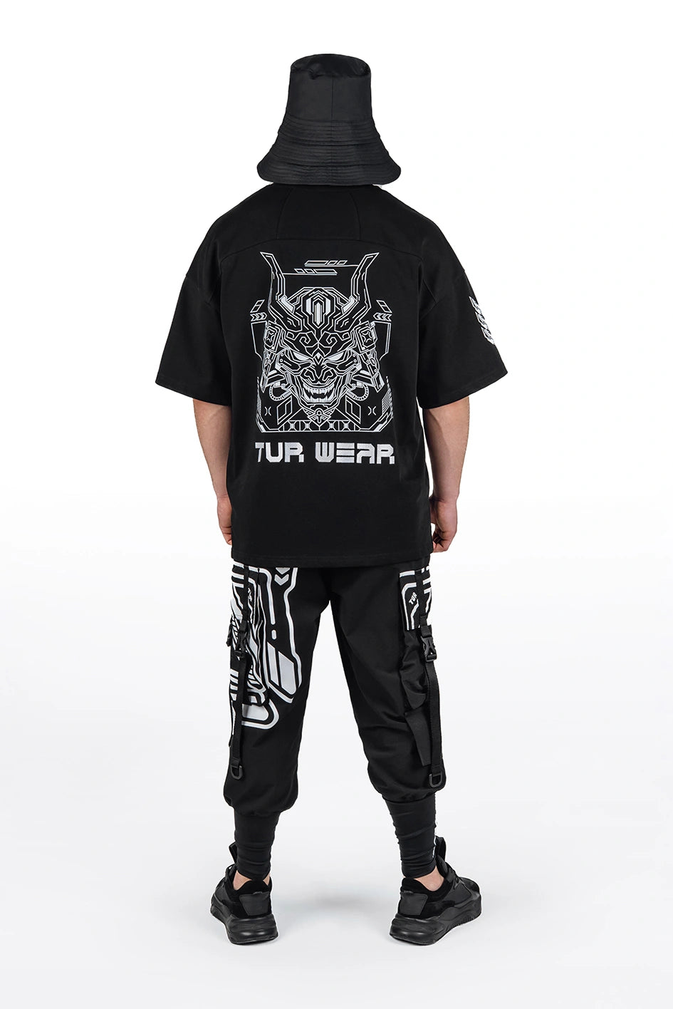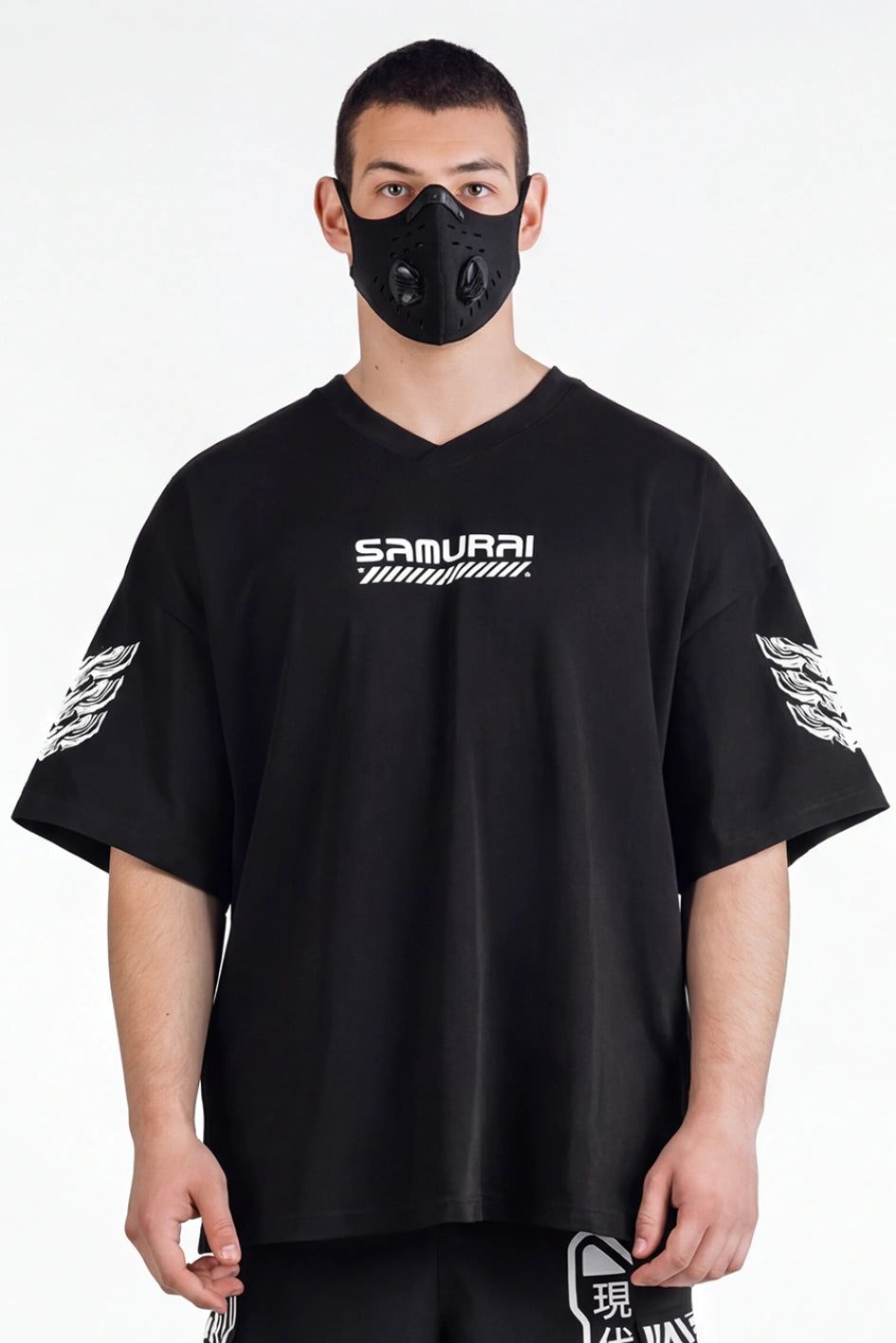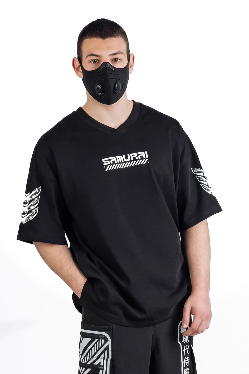 Oversize-T-Shirt mit verlängerter Silhouette und asymmetrischer Länge. Der Modellname Arasaka ist von der корпорації aus dem Universum Cyberpunk 2077 inspiriert, was sich im Design widerspiegelt. Der Ausschnitt ist im Kimono-Stil gestaltet und schafft eine charakteristische Geometrie im oberen Teil des Produkts. Auf dem Rücken befindet sich ein zusätzlicher Relief-Einsatz, der die Konstruktion verstärkt und Volumen hinzufügt. An der Seite befindet sich ein Schlitz für mehr Bewegungsfreiheit und bessere Passform. Das Modell wird durch grafische Prints und Stickerei ergänzt, die die Cyberpunk-Ästhetik unterstreichen. Das T-Shirt passt zu Looks im Stil Cyberpunk, Urban Samurai sowie zur alltäglichen urbanen Garderobe.