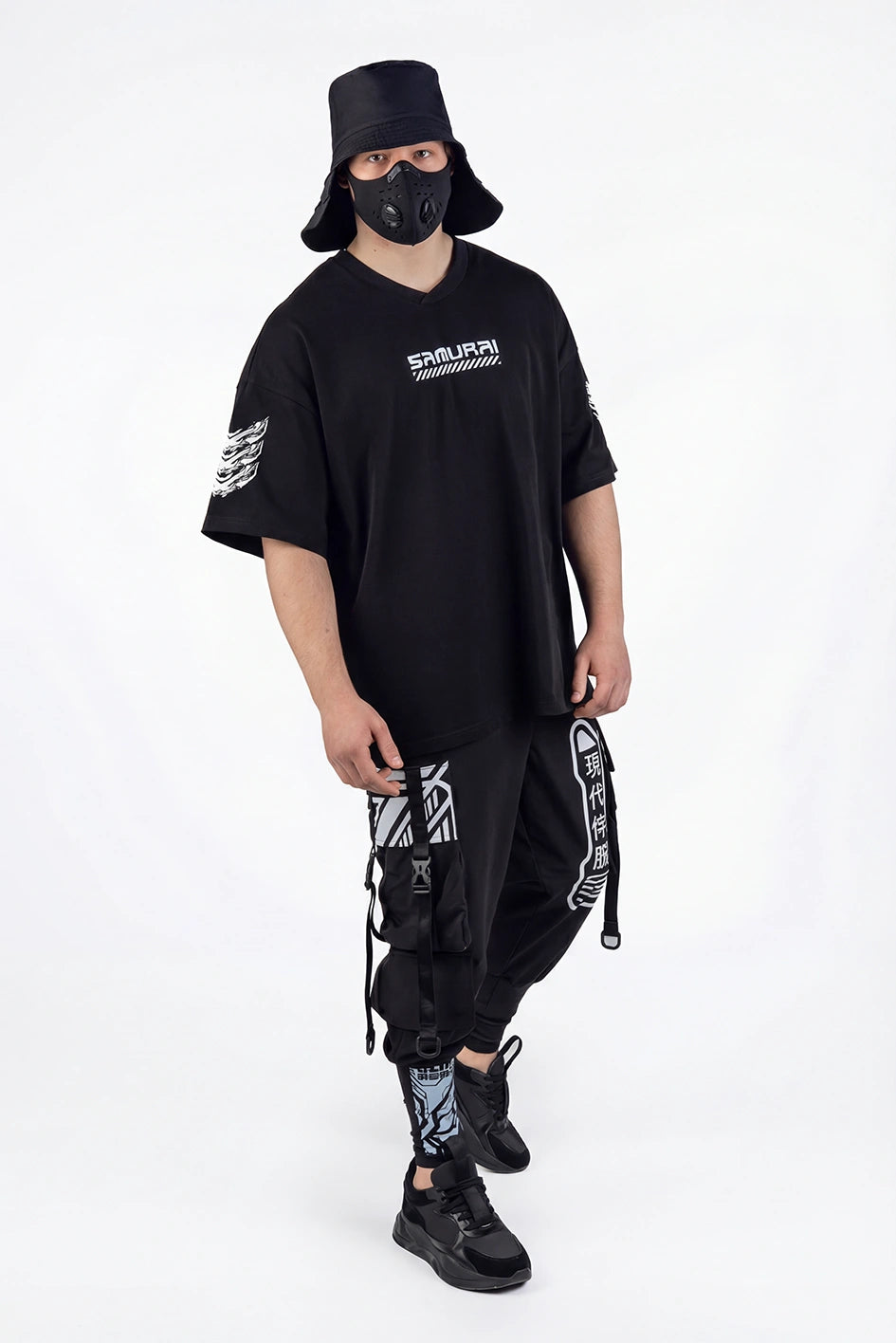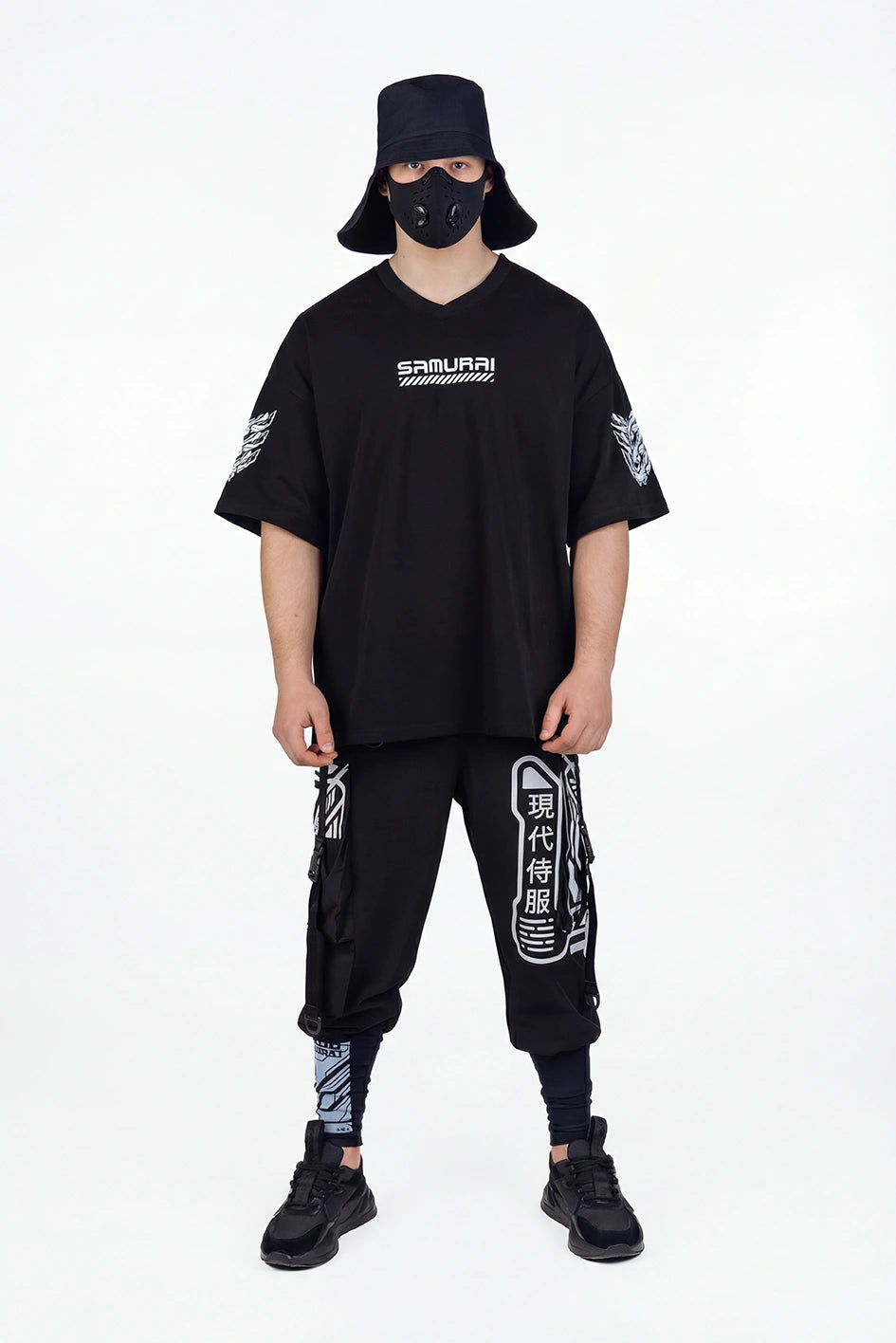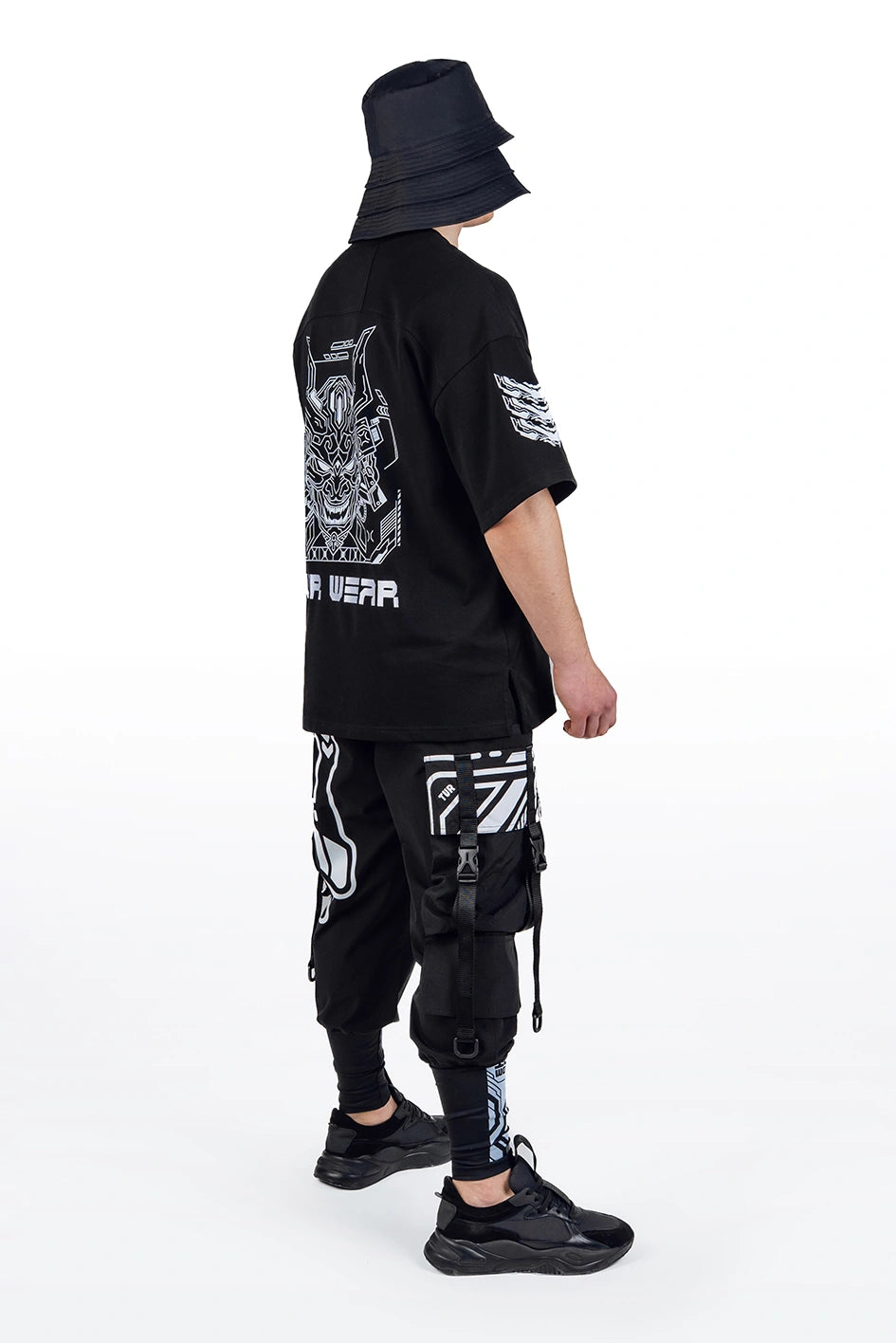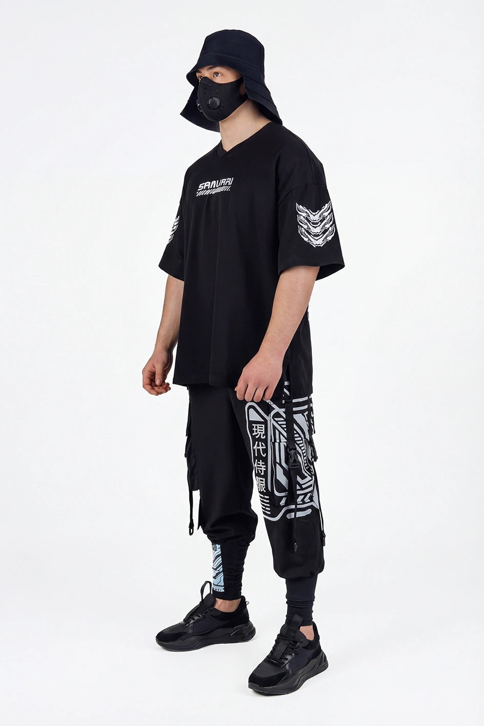 Oversize-T-Shirt mit verlängerter Silhouette und asymmetrischer Länge. Der Modellname Arasaka ist von der корпорації aus dem Universum Cyberpunk 2077 inspiriert, was sich im Design widerspiegelt. Der Ausschnitt ist im Kimono-Stil gestaltet und schafft eine charakteristische Geometrie im oberen Teil des Produkts. Auf dem Rücken befindet sich ein zusätzlicher Relief-Einsatz, der die Konstruktion verstärkt und Volumen hinzufügt. An der Seite befindet sich ein Schlitz für mehr Bewegungsfreiheit und bessere Passform. Das Modell wird durch grafische Prints und Stickerei ergänzt, die die Cyberpunk-Ästhetik unterstreichen. Das T-Shirt passt zu Looks im Stil Cyberpunk, Urban Samurai sowie zur alltäglichen urbanen Garderobe.