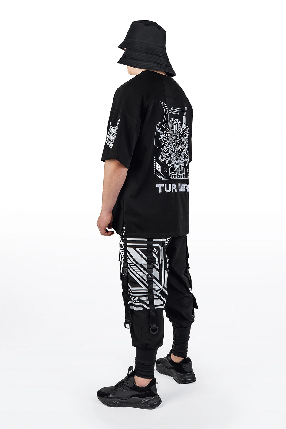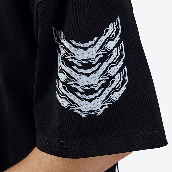 Das Modell ist aus Stretch-Jersey (Kulir) gefertigt — einem Strickstoff mit mittlerem Gewicht, glatter Oberfläche und weicher Textur. Das Material hat ein mattes Finish und sorgt für Komfort im Kontakt mit der Haut. Dank des Polyesteranteils behält der Stoff besser seine Form, ist weniger anfällig für Verformungen und hält regelmäßiger Nutzung stand. Das Material ist elastisch, passt sich gut den Bewegungen an und schränkt die Mobilität nicht ein. Der Ausschnitt ist mit einem Rippbündchen (Rib) verarbeitet, was Formstabilität und eine gute Passform ohne Ausdehnung gewährleistet. Dekorative Elemente sind in Form von Prints und Stickerei im Cyberpunk- und futuristischen Stil ausgeführt, was dem Produkt visuelle Tiefe und grafischen Charakter verleiht.