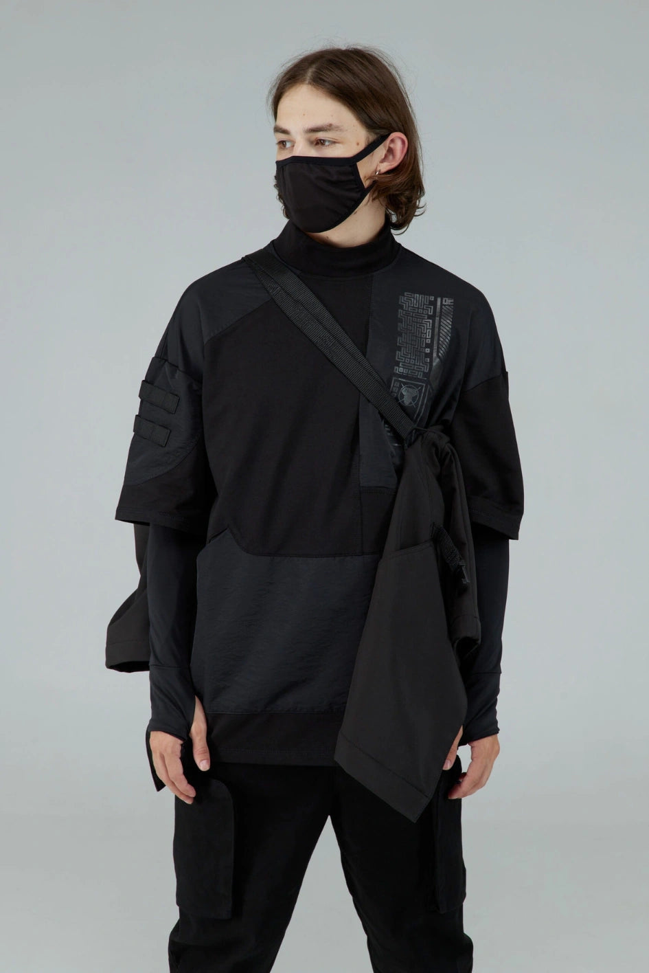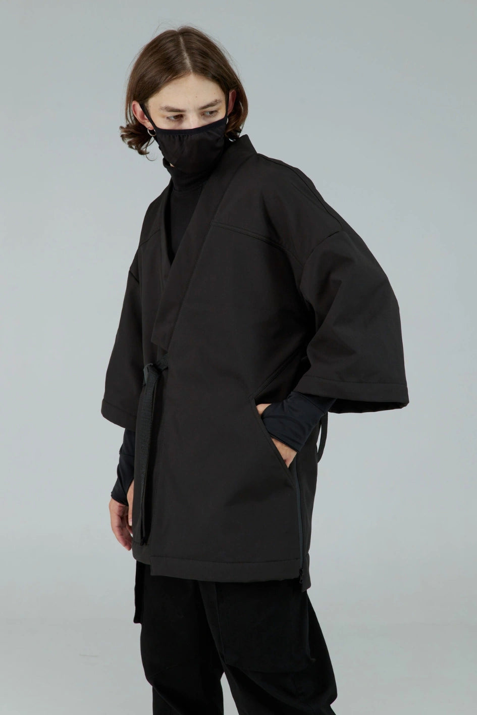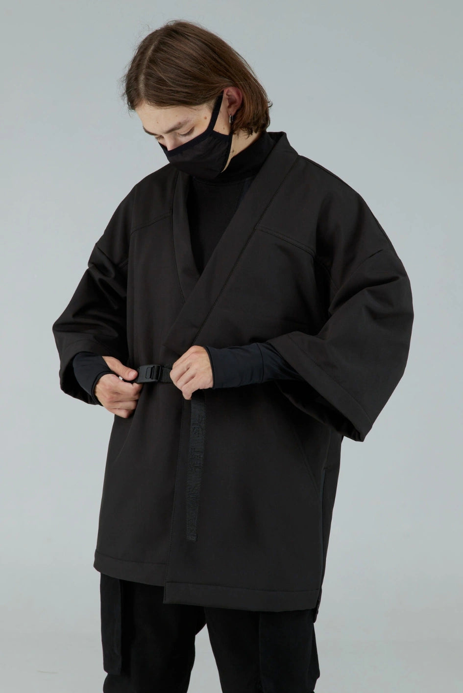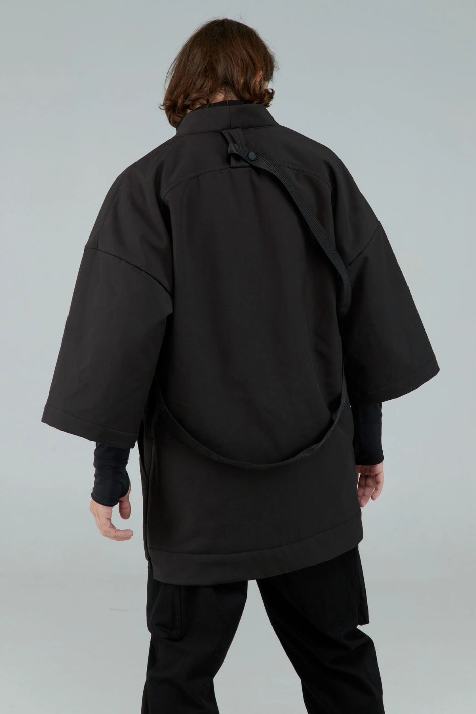 Oversize-Kimono mit Magnetverschluss-Schnalle. Seitliche Schlitze mit Reißverschluss. Das Kimono verfügt über zwei seitliche Außentaschen sowie eine Innentasche. Als Verzierung ist ein Band eingenäht.