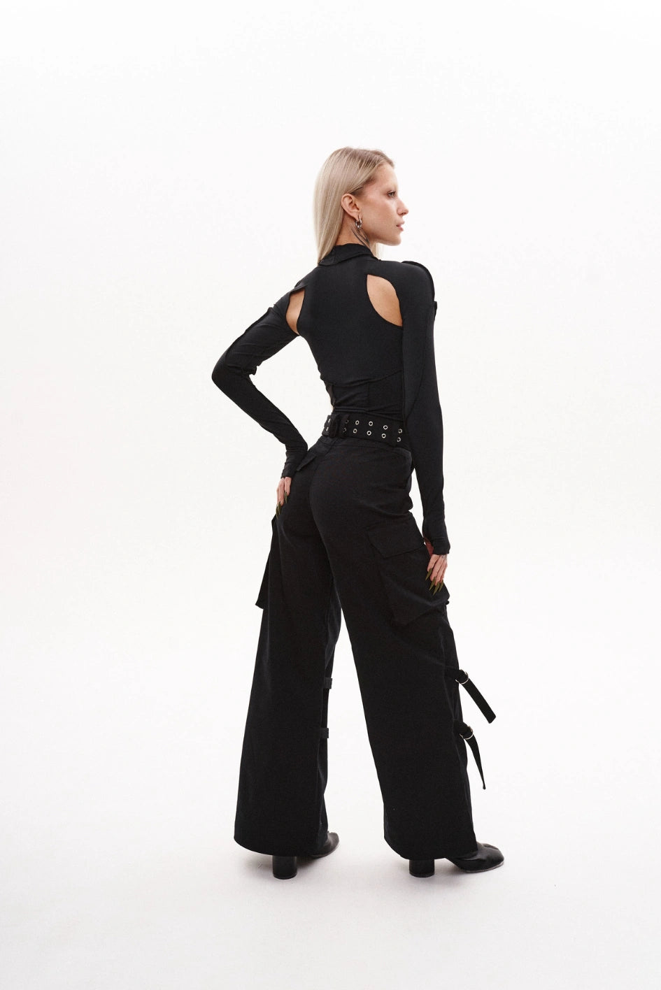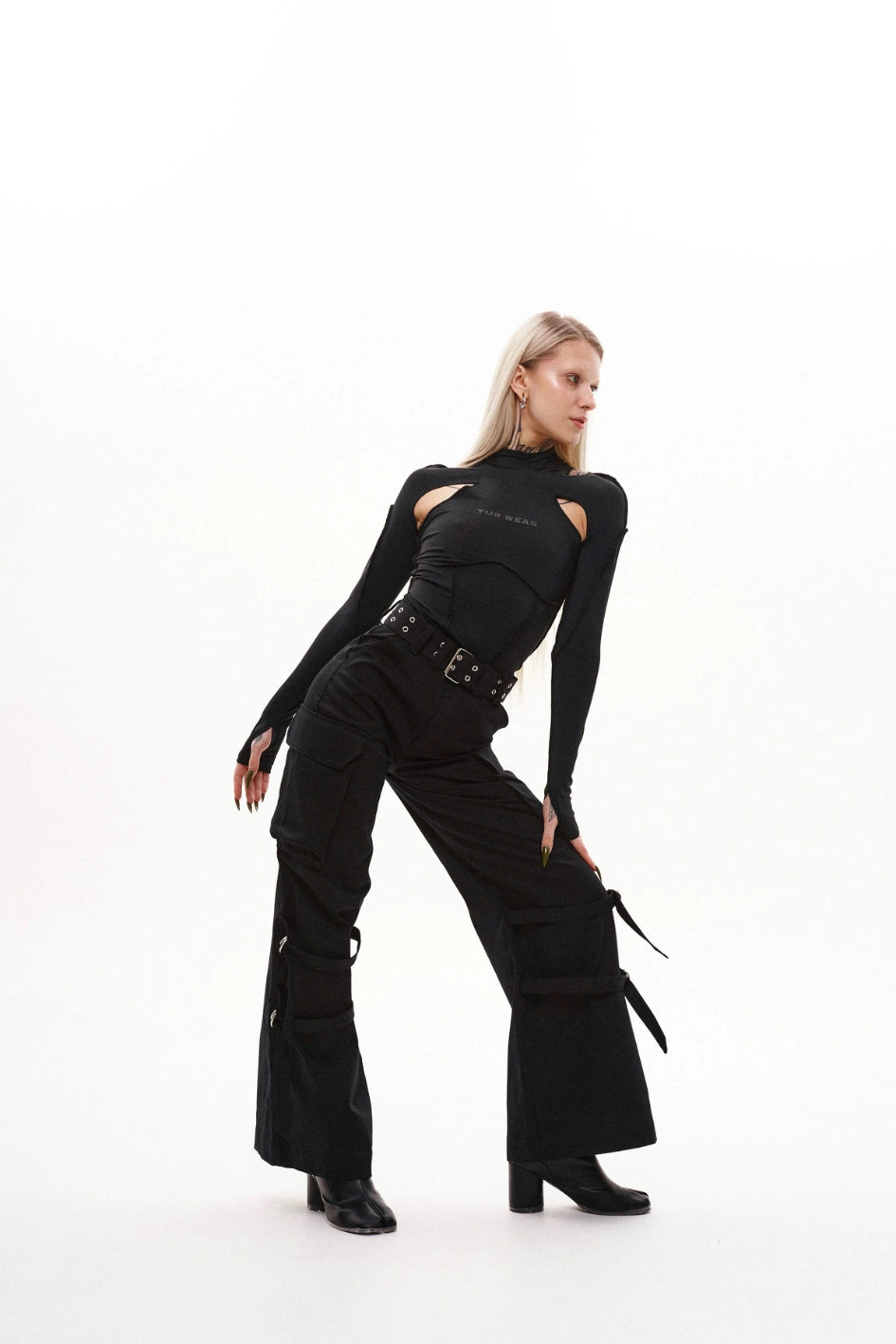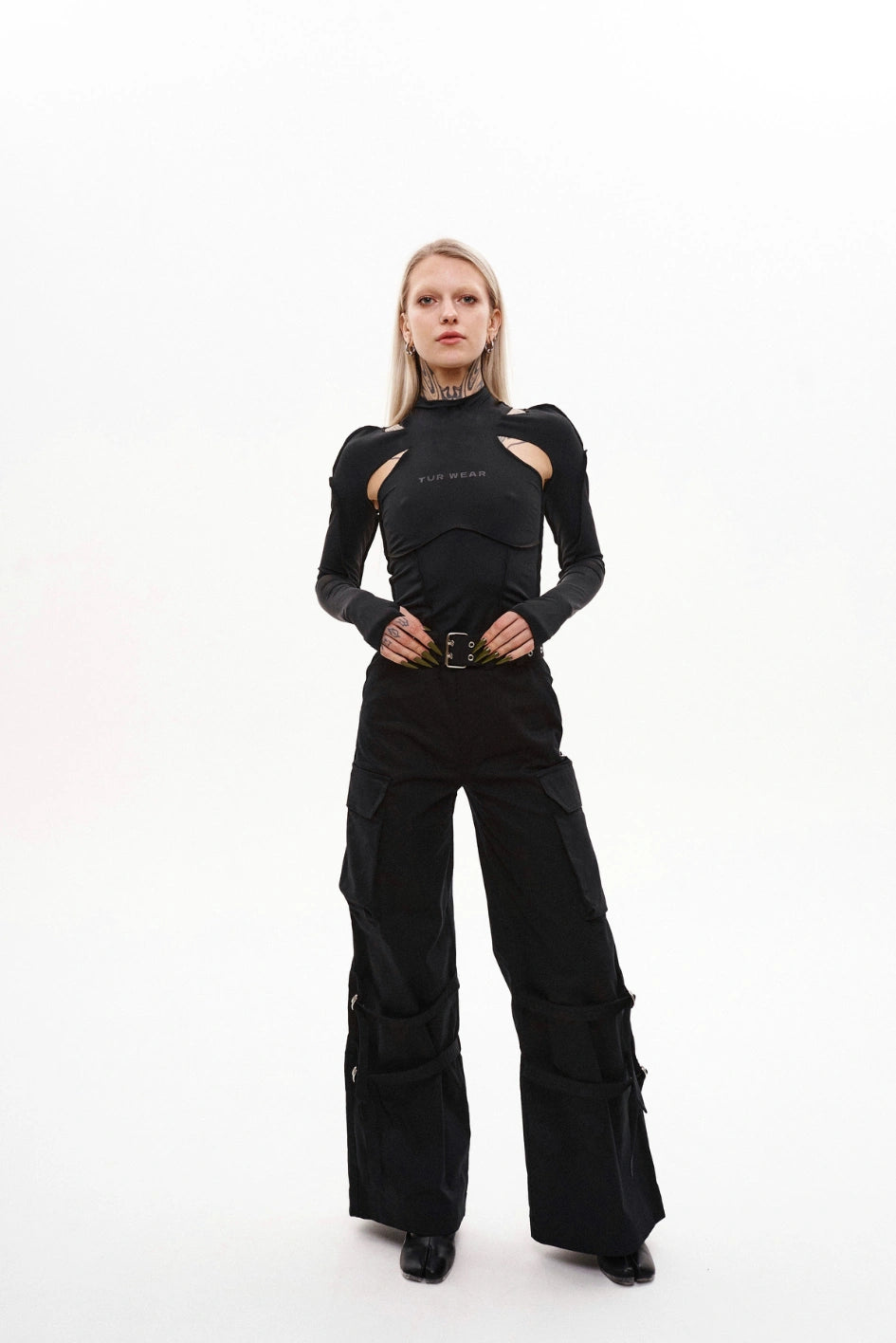 Langarmshirt, das aus zwei Teilen besteht: Die Ärmel sind in der Mitte vorne und hinten verbunden, das Oberteil hat einen Stehkragen. Alle Nähte sind abgesteppt, ohne Einschnitte. Der obere Teil des Stehkragens, der Saum des Kleidungsstücks und die Ärmelabschlüsse sind mit Overlock verarbeitet. Die Ärmel sind verlängert und haben einen Schlitz für den Daumen.