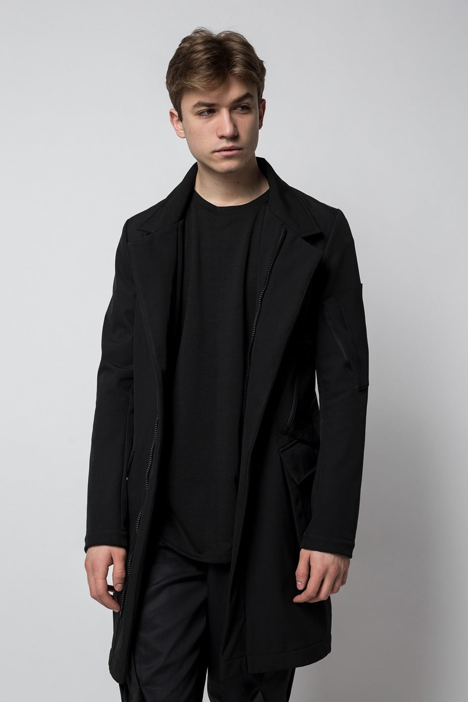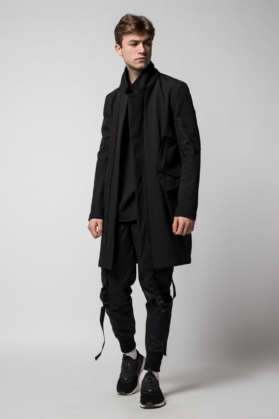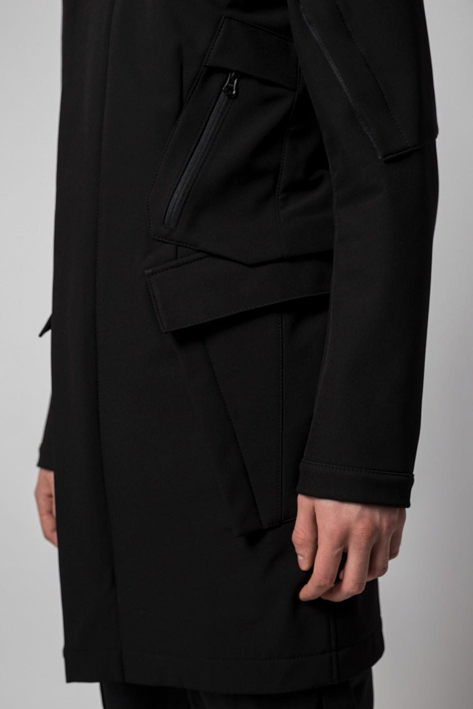 Taillierter Mantel, mittlere Länge. Hauptverschluss – Reißverschluss. Für kältere Tage Magnetverschlüsse an den oberen Klappen. Vier aufgesetzte Taschen: zwei große im Taillenbereich, eine mit Reißverschluss im Brustbereich, eine am linken Ärmel.