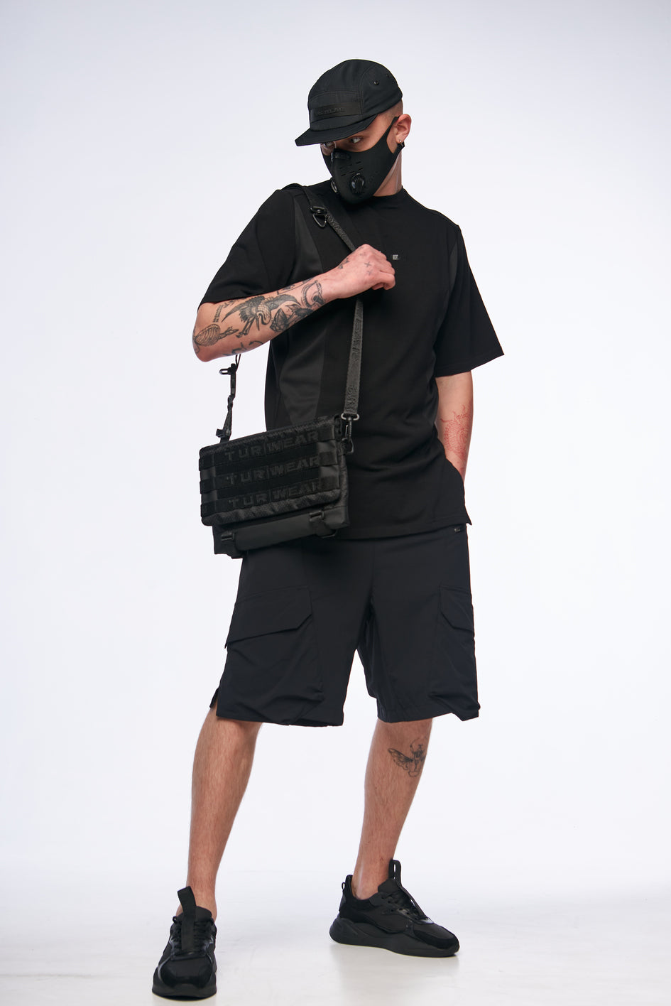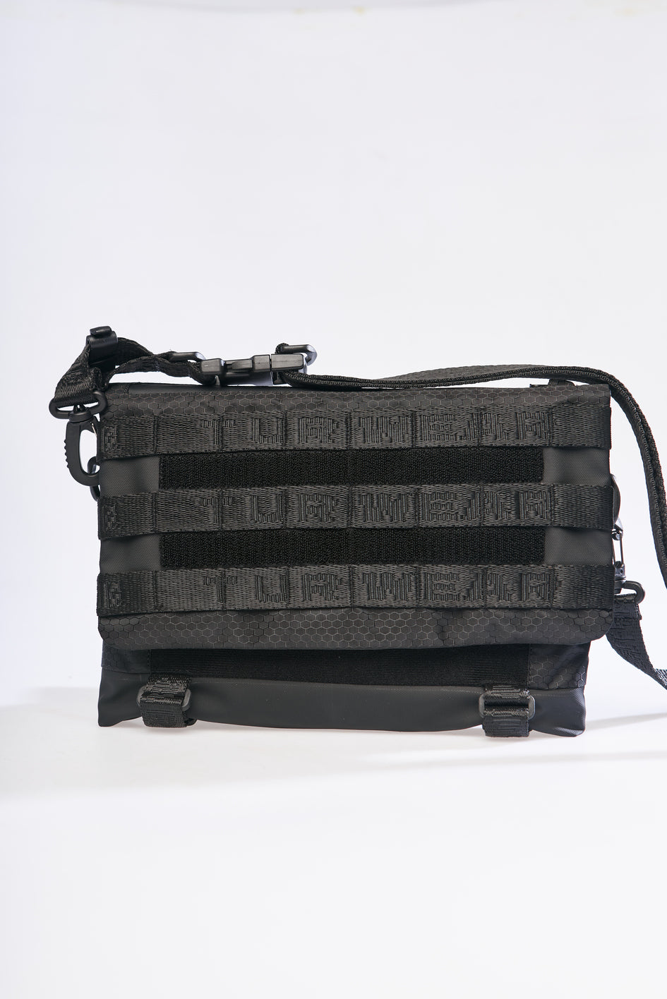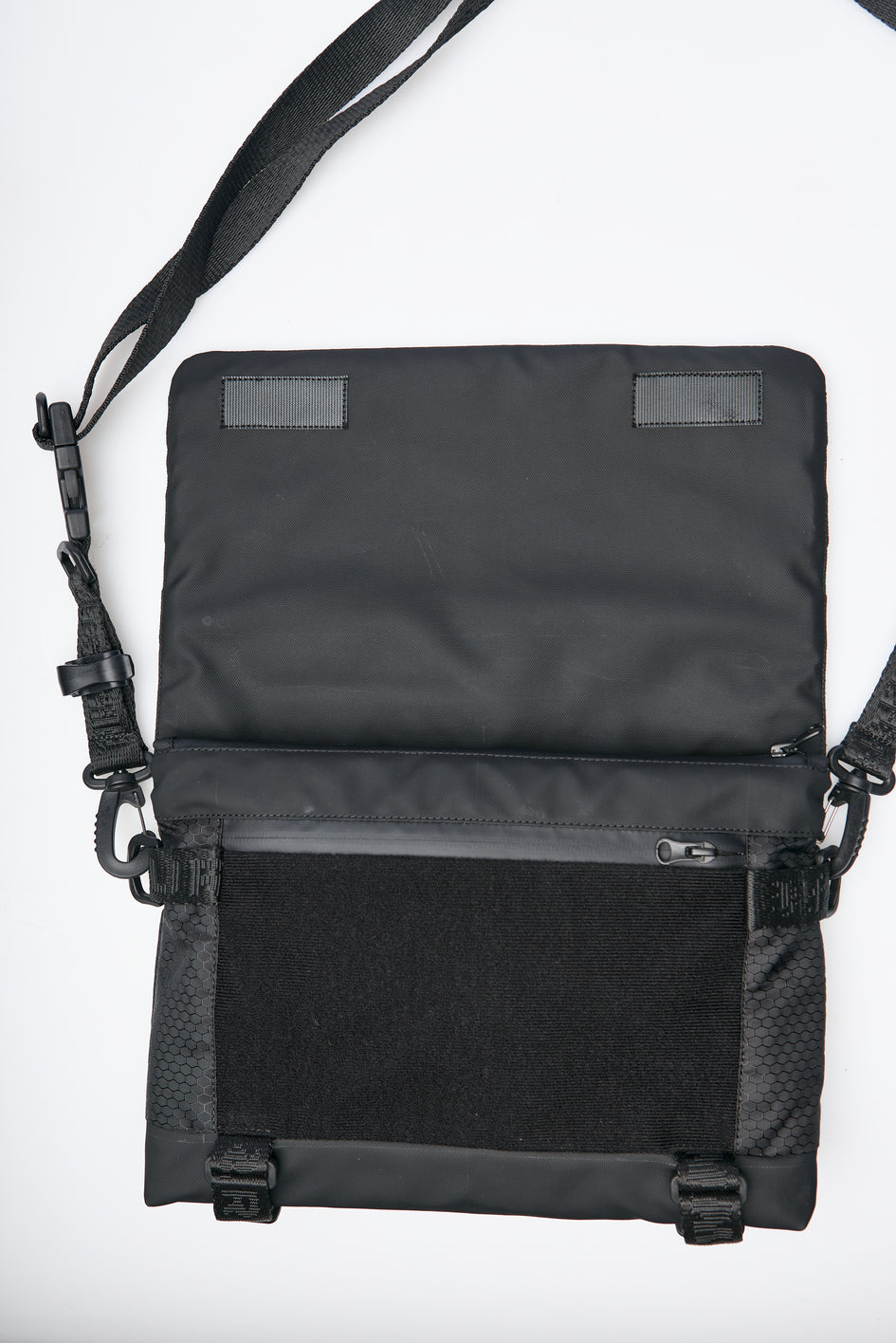 Umhängetasche mit 6 Taschen: Außentasche mit Reißverschluss vorne, Außentasche mit Reißverschluss hinten, Tasche mit Reißverschluss im Deckel, innen eine Tasche über die gesamte Wand sowie zwei kleine Taschen für Kleinigkeiten. Funktionaler Griff mit Karabinern und Entlastungshaken.