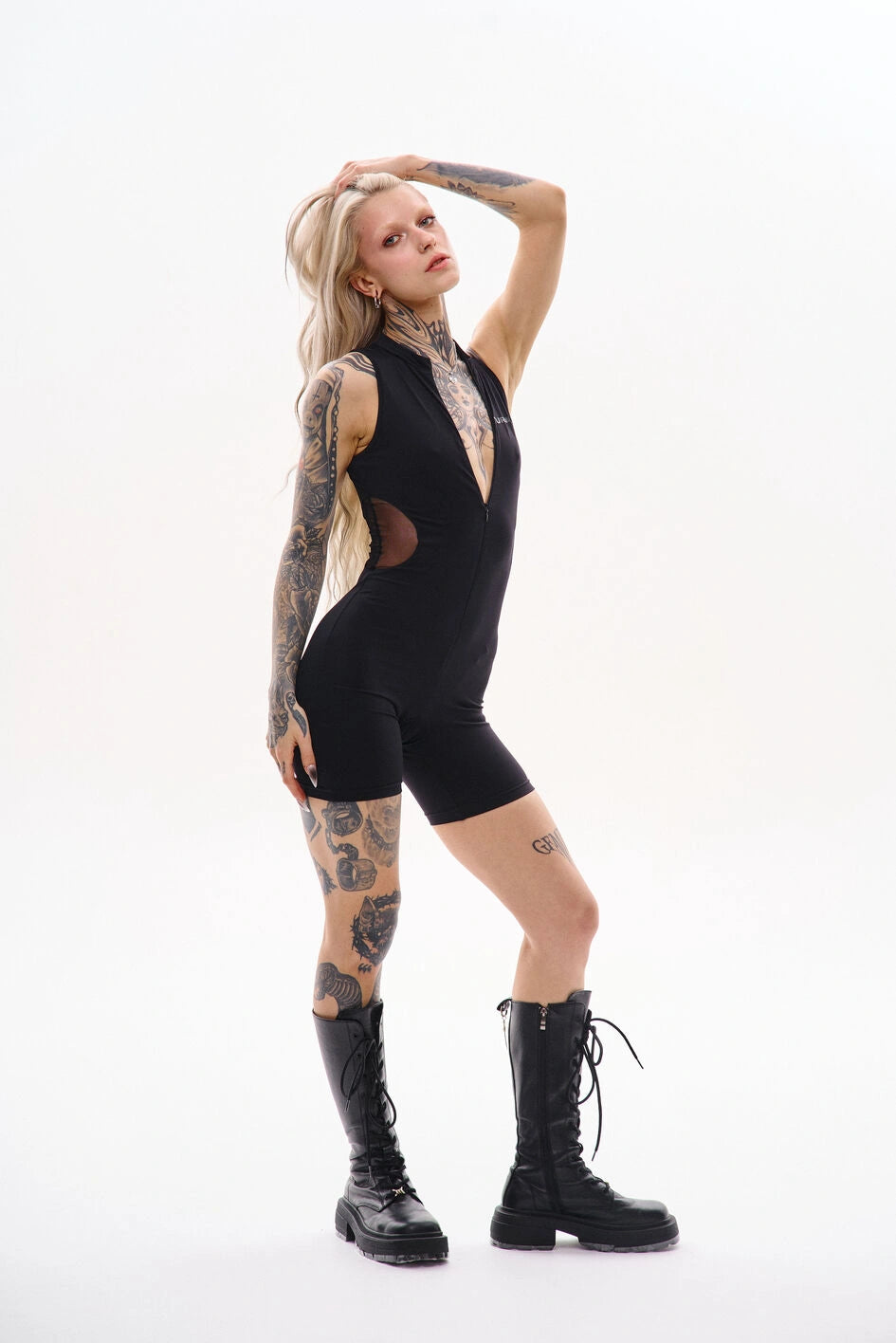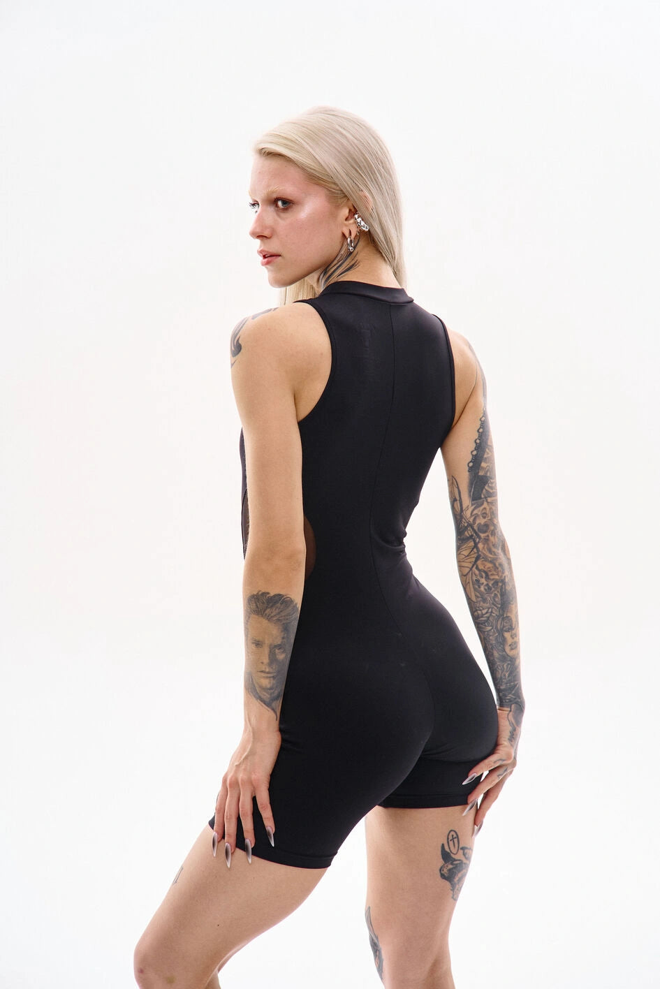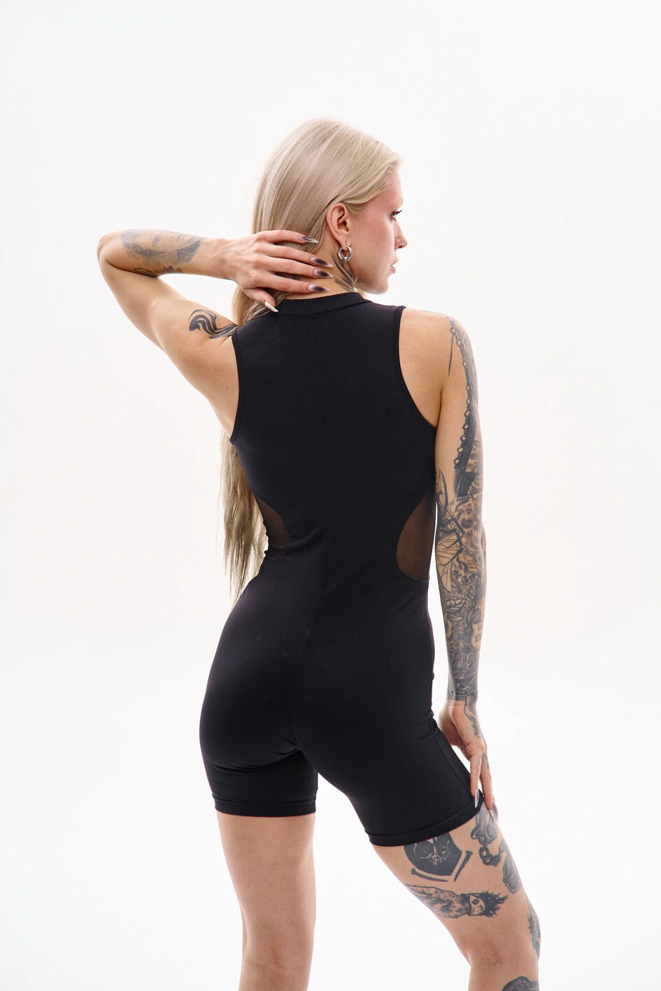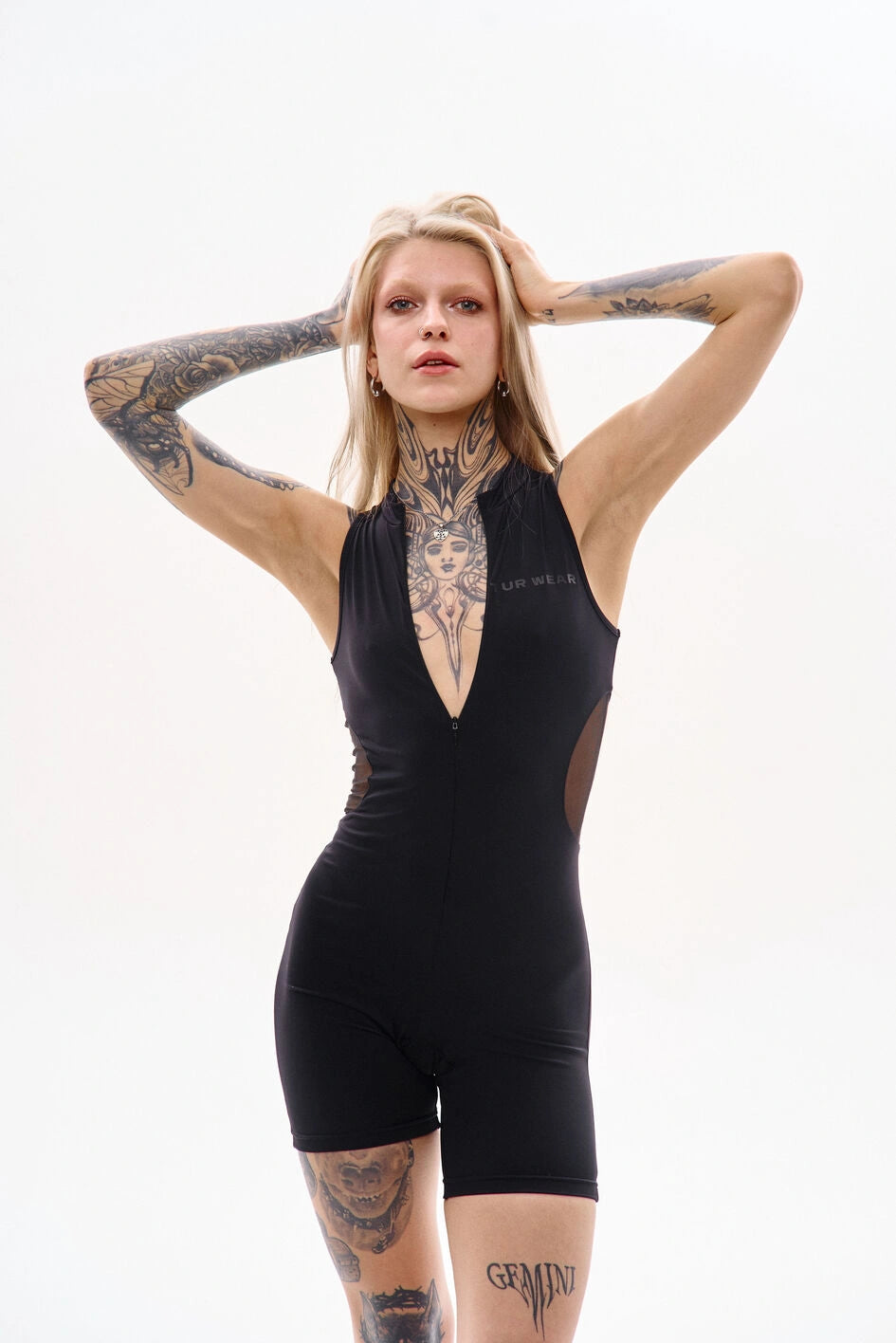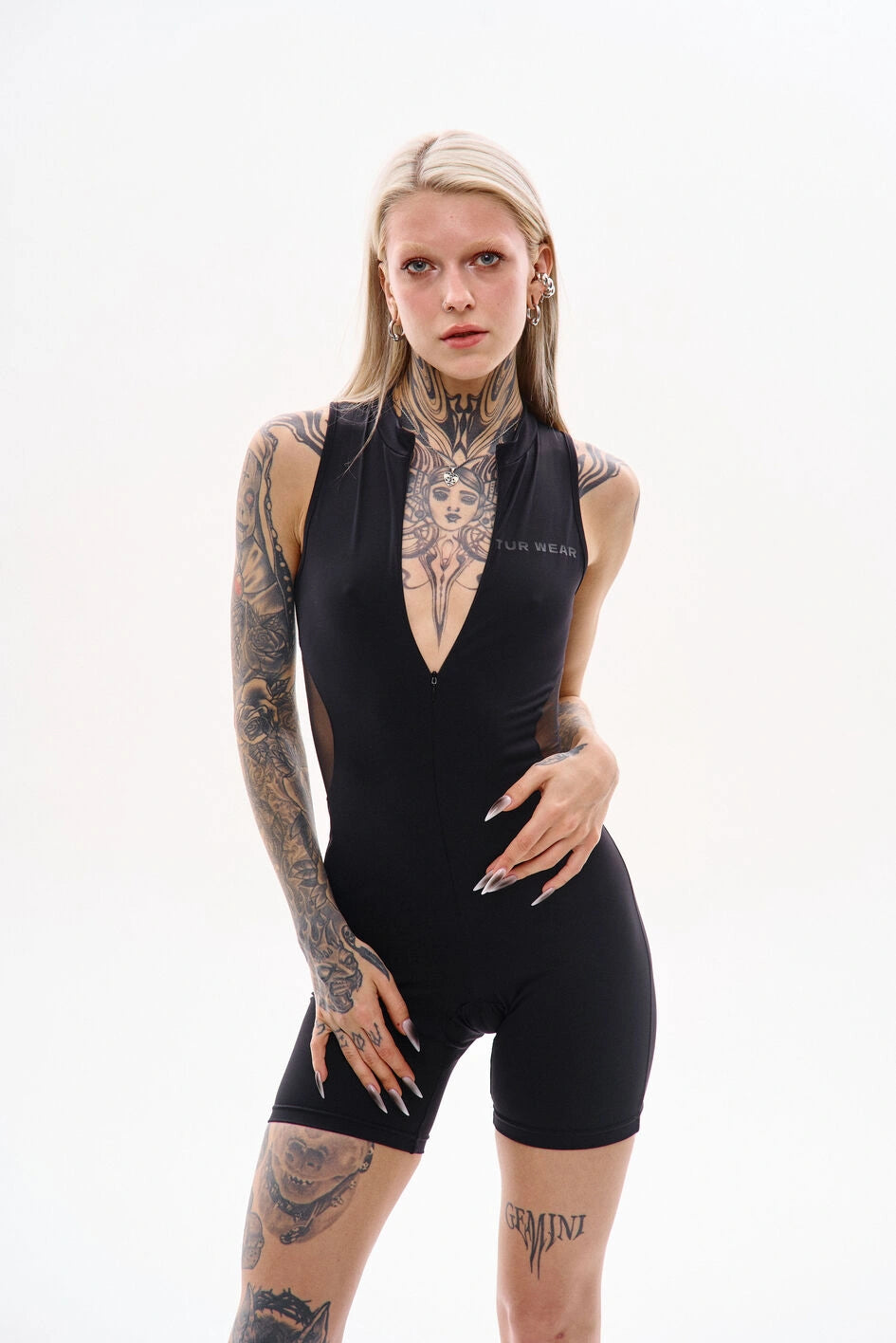 Figurbetonter ärmelloser Overall mit kleinem Stehkragen. Funktionaler Frontreißverschluss. Mesh-Einsätze vorne und hinten betonen die Silhouette und sorgen für Atmungsaktivität. Auffälliger TUR-Print auf der linken Brusttasche – minimalistisch, aber mit Charakter.