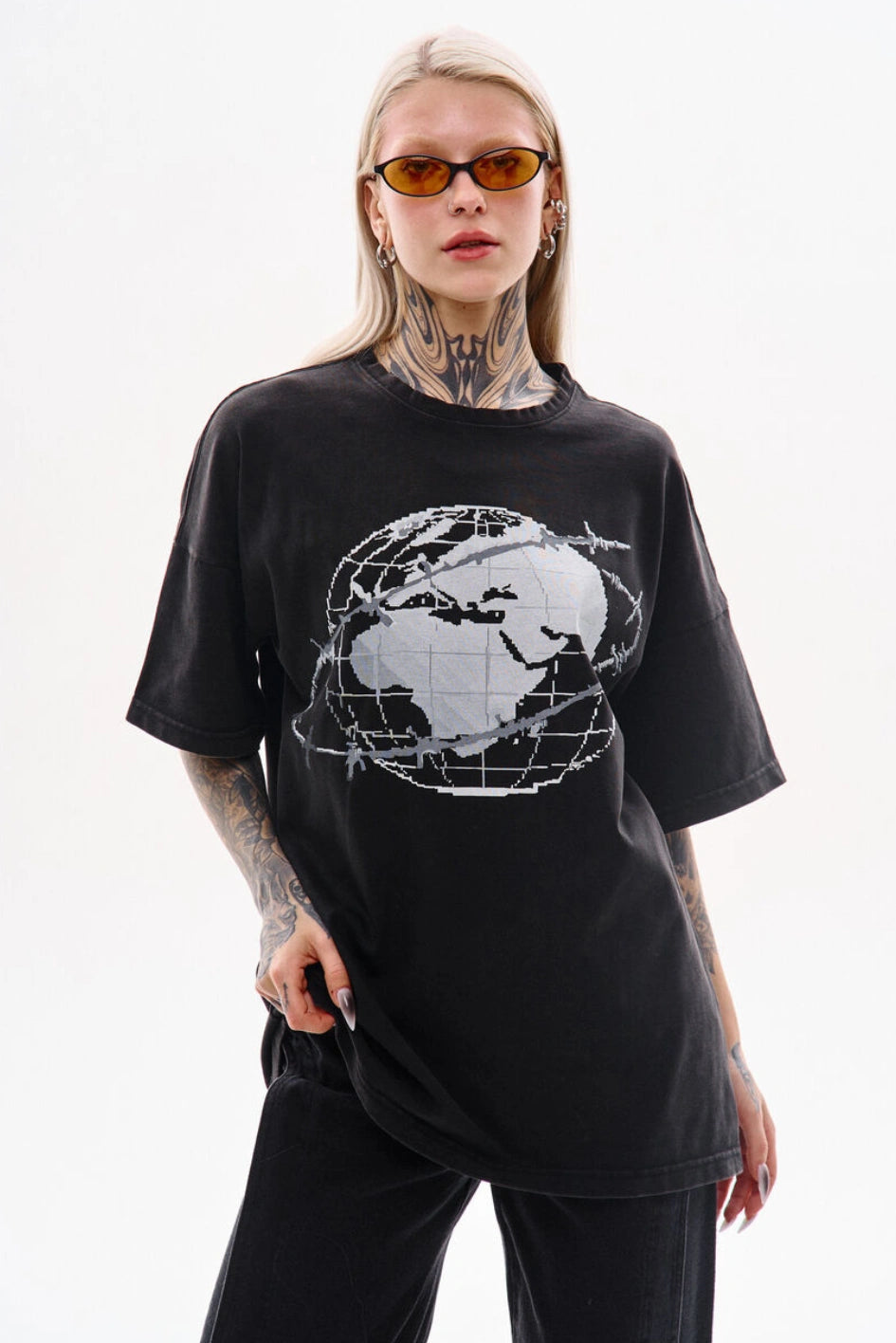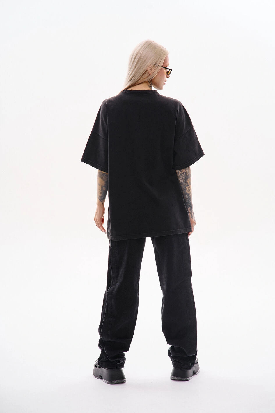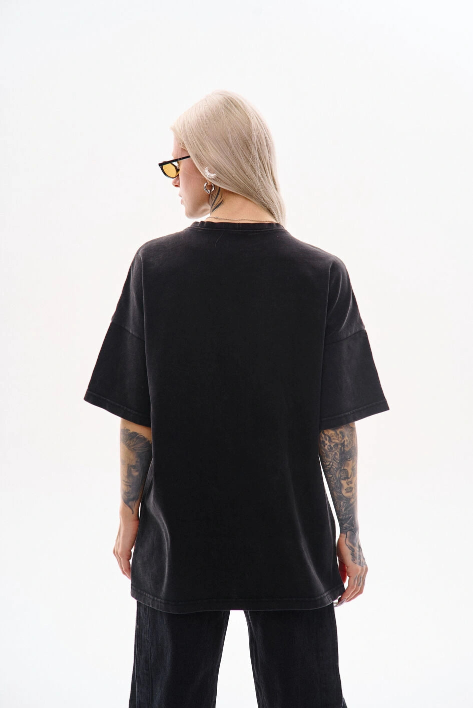 Oversize-T-Shirt mit „gekochtem“ Washed-Effekt – für alle, die Einzigartigkeit im Detail schätzen. Eingesetzte Ärmel und gerippter Halsausschnitt sorgen für Komfort und Langlebigkeit. Universelle Größe, passend für Damengrößen von XS bis L. Ein origineller Print vervollständigt das Konzept und verleiht jedem Outfit Charakter.