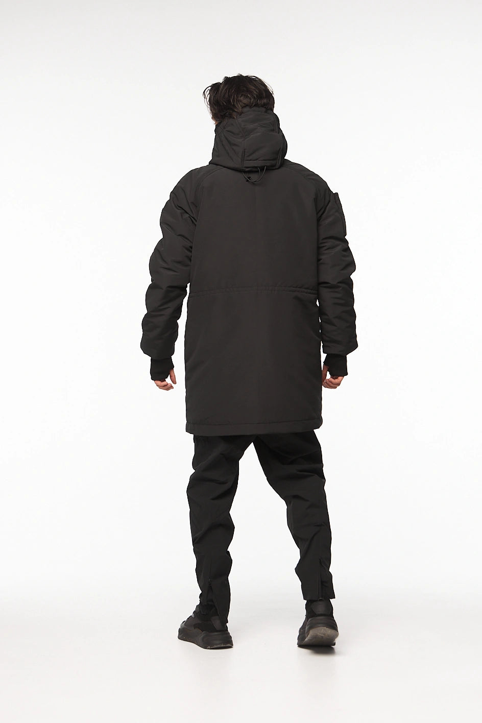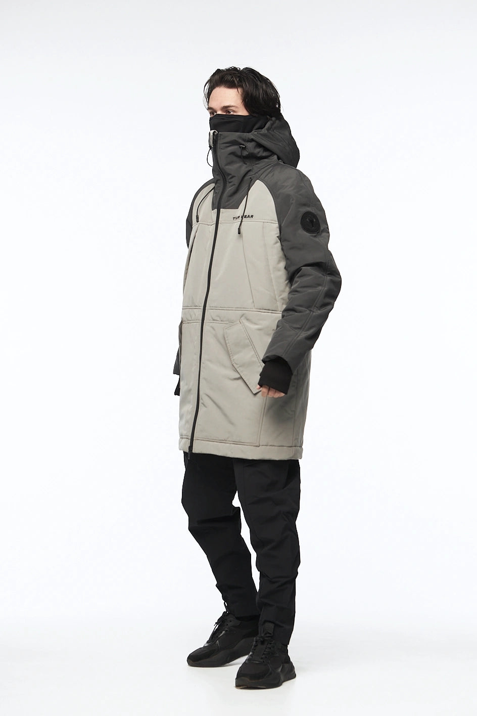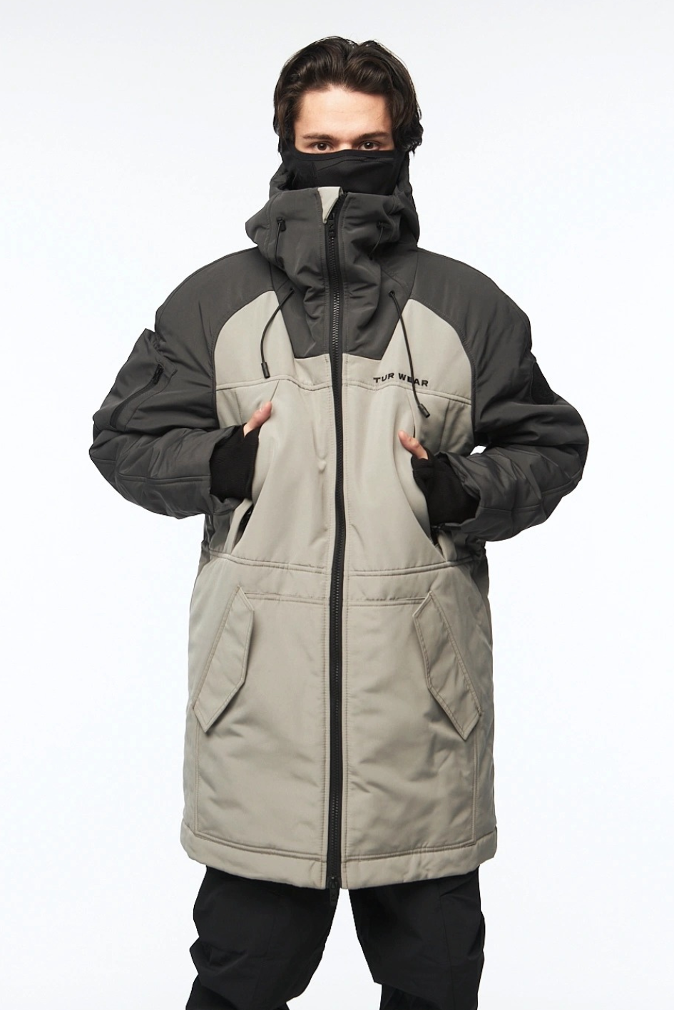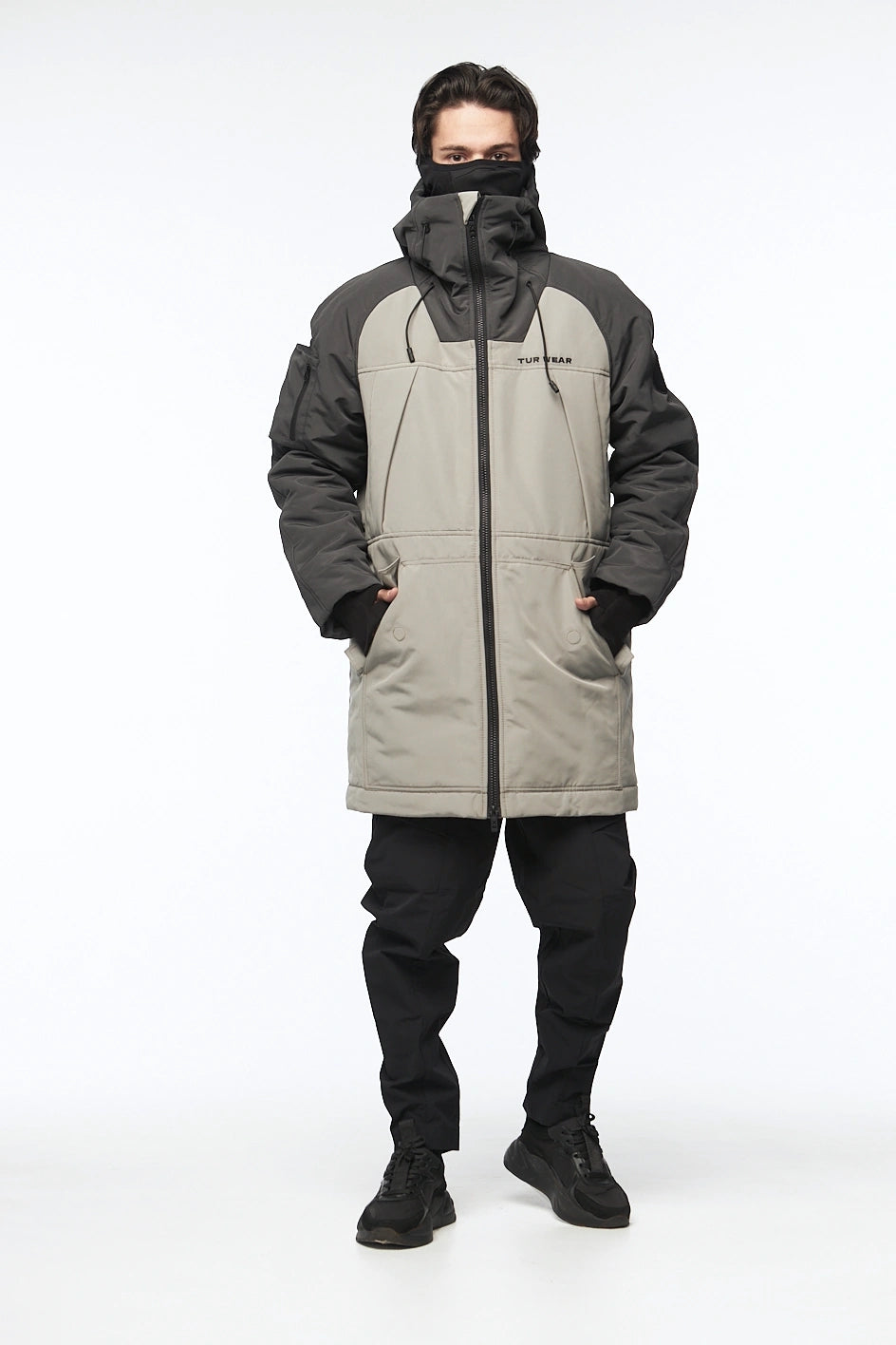 Winterparka aus dichtem, wasserabweisendem Material. Tiefe Kapuze und hoher Kragen. Verlängerter Schnitt und Reißverschluss mit Doppelschieber für hohen Tragekomfort. Zwei Brusttaschen mit Reißverschluss, verdeckt unter einer Leiste, zwei Pattentaschen unten sowie eine Innentasche. In der Taille befindet sich ein Kordelzug. Rippbündchen an den Ärmeln verhindern das Eindringen von Schnee und Wind. Raglanärmel sorgen für universelle Passform. Auf dem rechten Ärmel eine aufgesetzte Tasche mit Reißverschluss, auf dem linken Ärmel ein Firmen-Patch zur Befestigung verschiedener Abzeichen. Schwarze Tur Wear Stickerei im Herzbereich. Die Parka ist für europäische Winter geeignet (bis -25 °C).