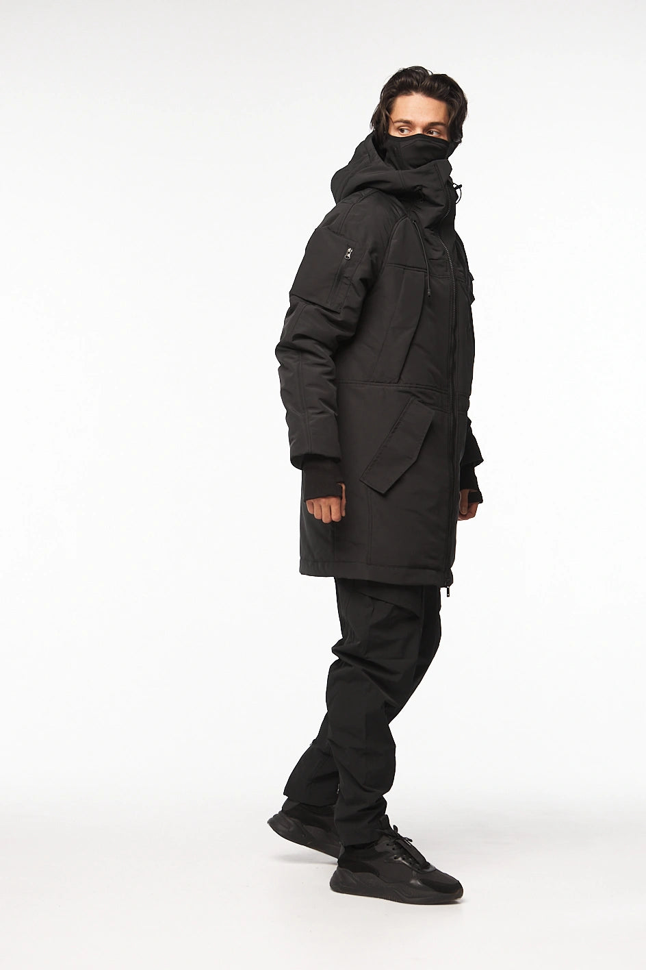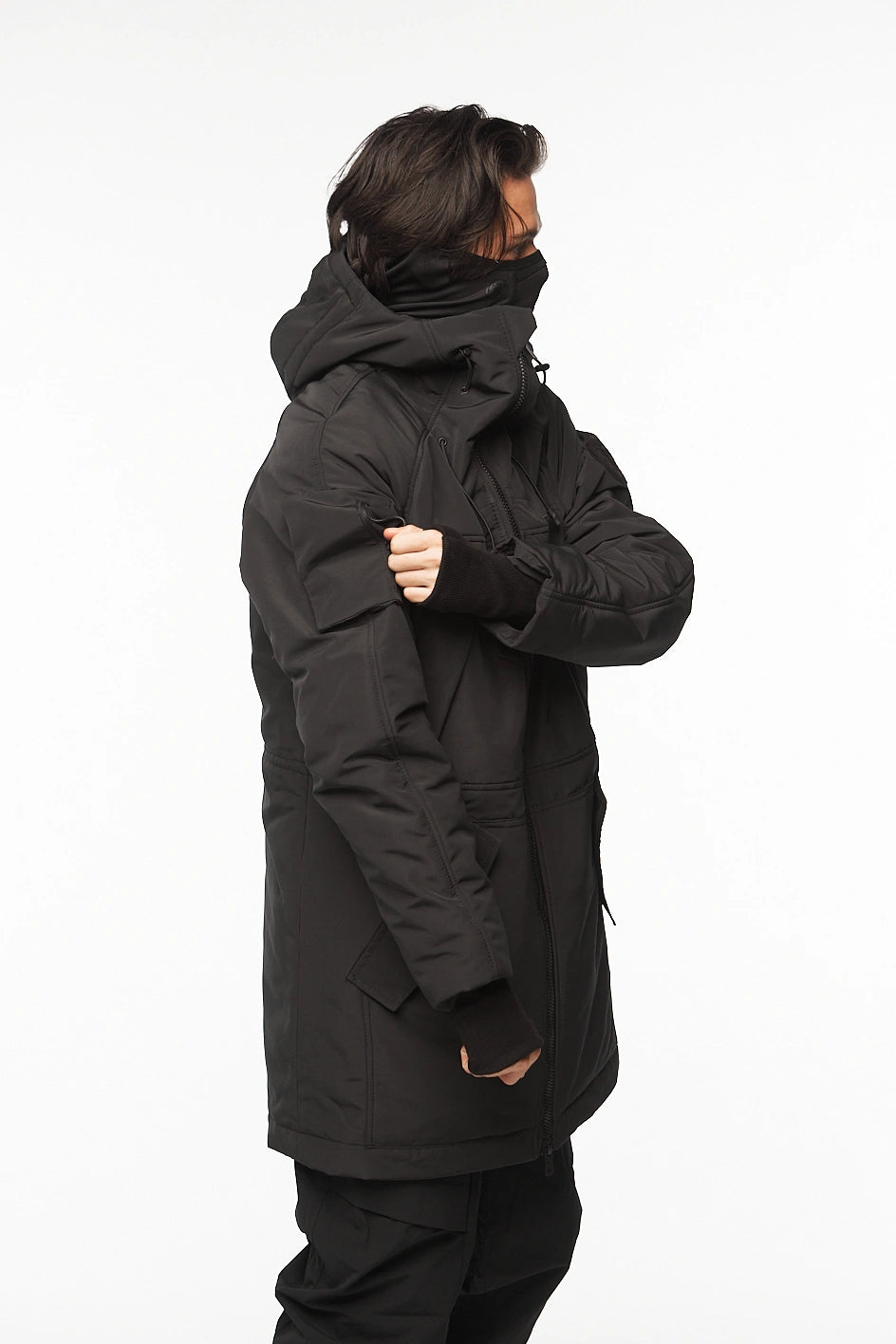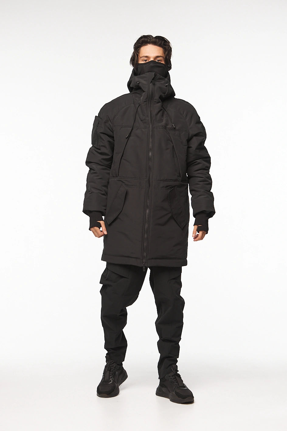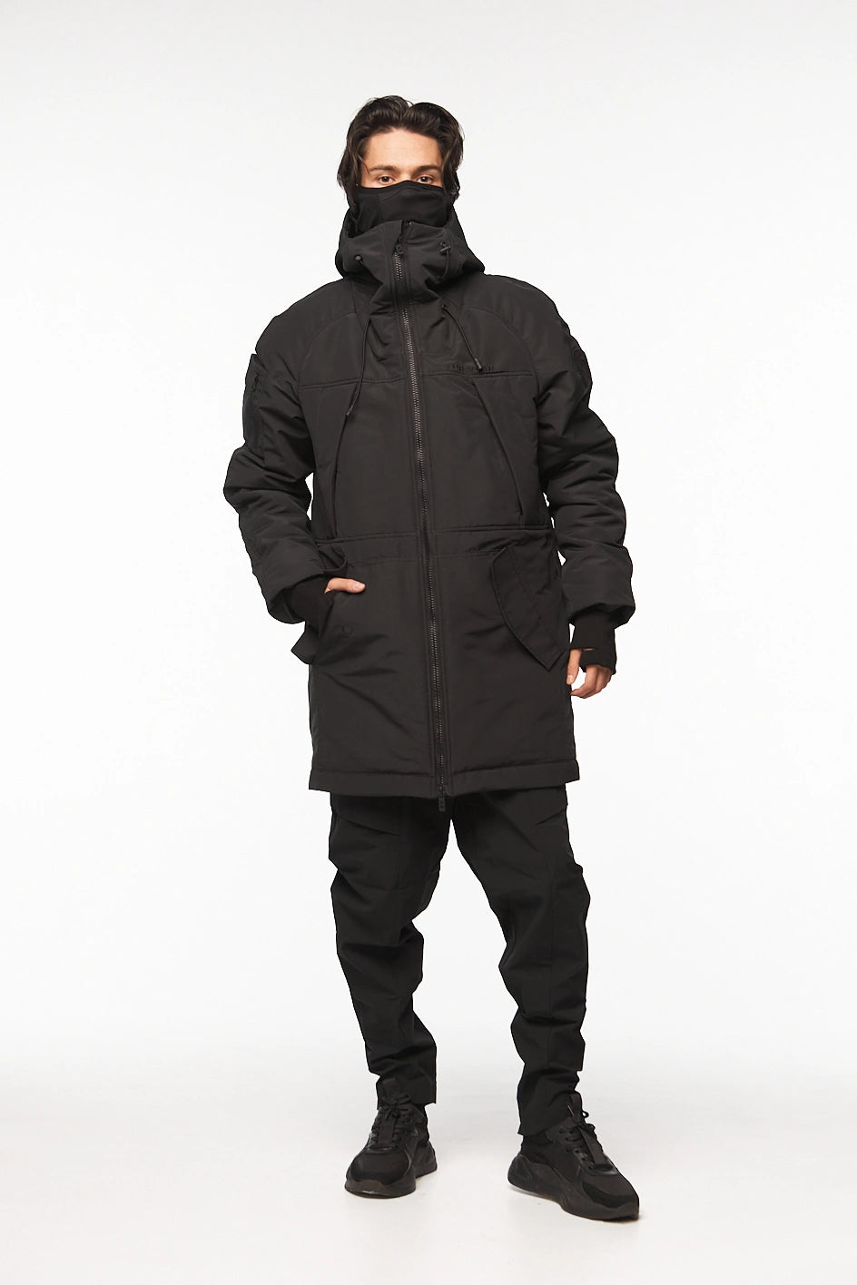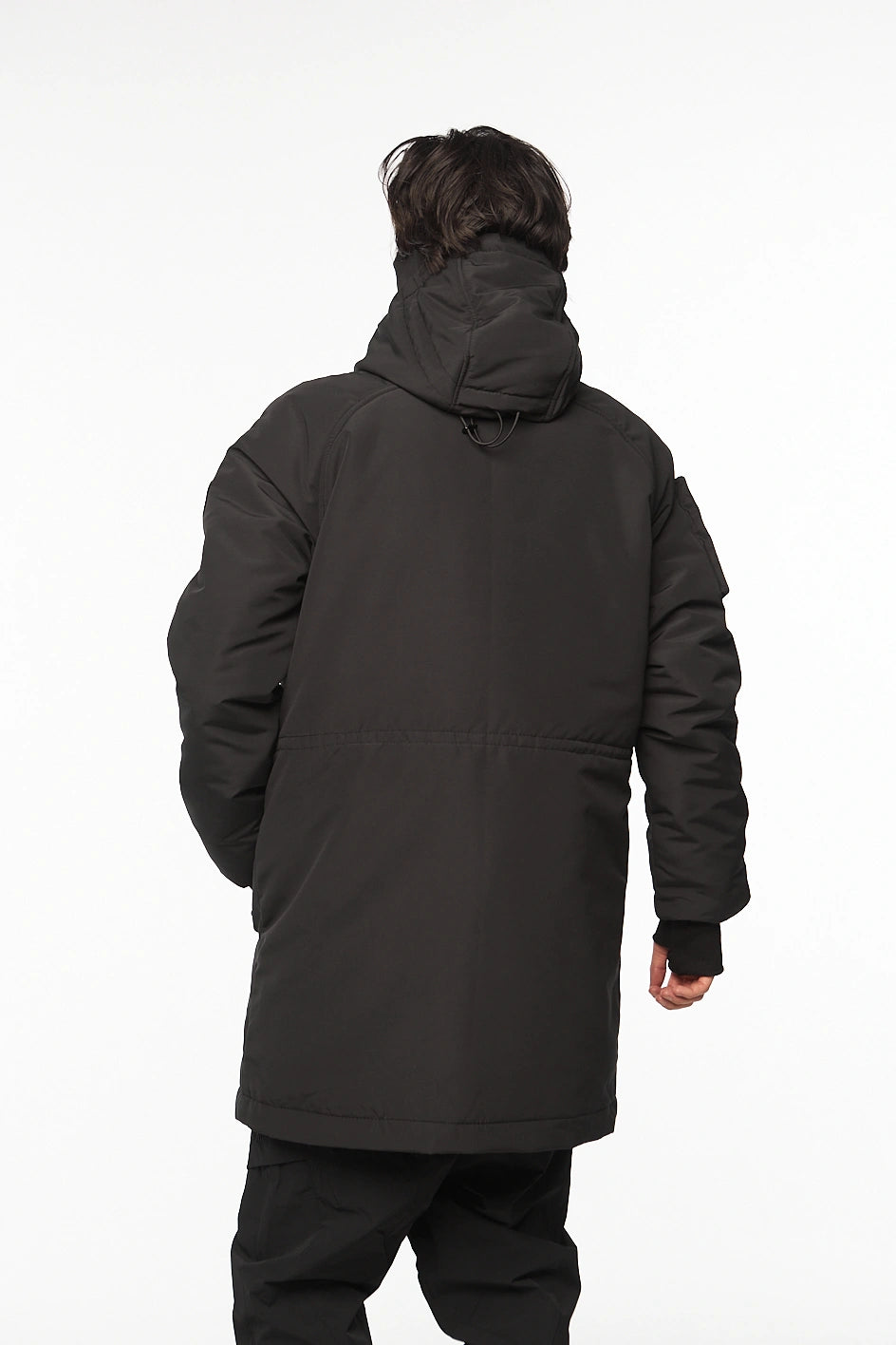 Winterparka aus dichtem, wasserabweisendem Material. Tiefe Kapuze und hoher Kragen. Verlängerter Schnitt und Reißverschluss mit Doppelschieber für hohen Tragekomfort. Zwei Brusttaschen mit Reißverschluss, verdeckt unter einer Leiste, zwei Pattentaschen unten sowie eine Innentasche. In der Taille befindet sich ein Kordelzug. Rippbündchen an den Ärmeln verhindern das Eindringen von Schnee und Wind. Raglanärmel sorgen für universelle Passform. Auf dem rechten Ärmel eine aufgesetzte Tasche mit Reißverschluss, auf dem linken Ärmel ein Firmen-Patch zur Befestigung verschiedener Abzeichen. Schwarze Tur Wear Stickerei im Herzbereich. Die Parka ist für europäische Winter geeignet (bis -25 °C).