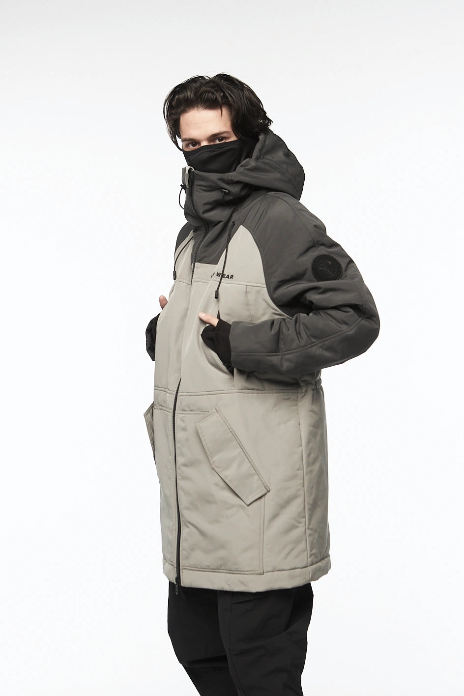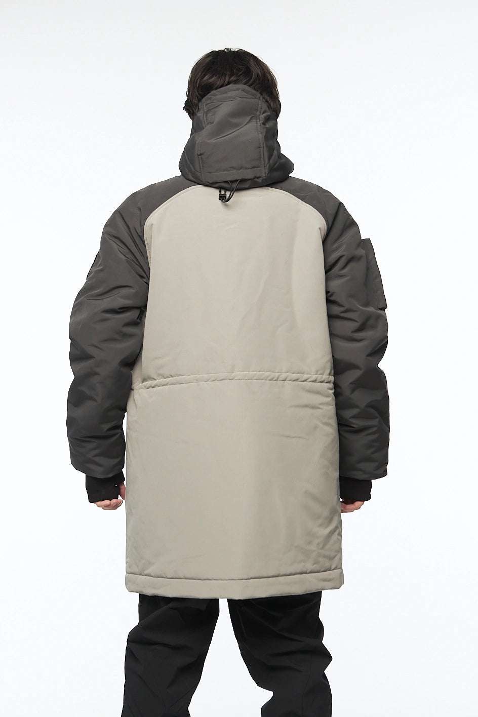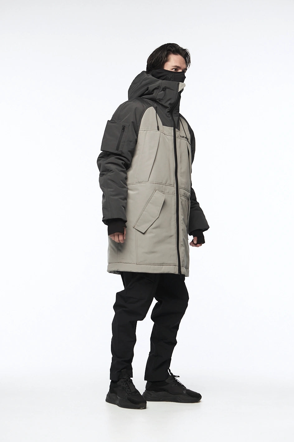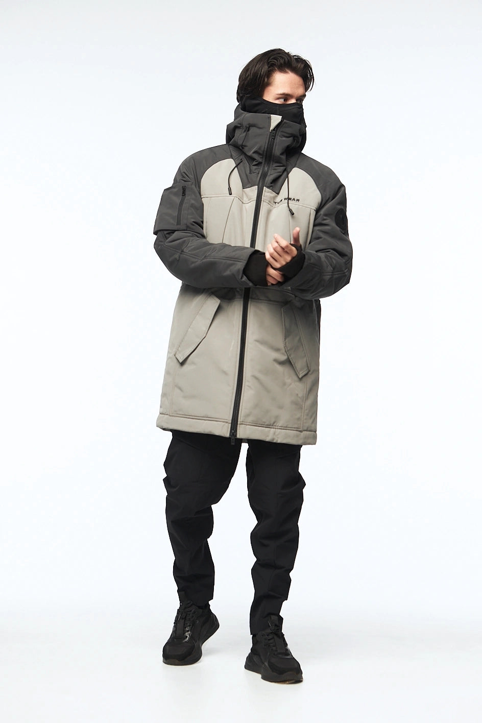 Winterparka aus dichtem, wasserabweisendem Material. Tiefe Kapuze und hoher Kragen. Verlängerter Schnitt und Reißverschluss mit Doppelschieber für hohen Tragekomfort. Zwei Brusttaschen mit Reißverschluss, verdeckt unter einer Leiste, zwei Pattentaschen unten sowie eine Innentasche. In der Taille befindet sich ein Kordelzug. Rippbündchen an den Ärmeln verhindern das Eindringen von Schnee und Wind. Raglanärmel sorgen für universelle Passform. Auf dem rechten Ärmel eine aufgesetzte Tasche mit Reißverschluss, auf dem linken Ärmel ein Firmen-Patch zur Befestigung verschiedener Abzeichen. Schwarze Tur Wear Stickerei im Herzbereich. Die Parka ist für europäische Winter geeignet (bis -25 °C).