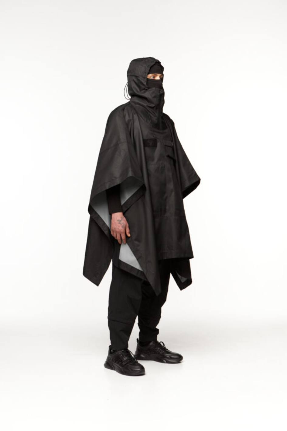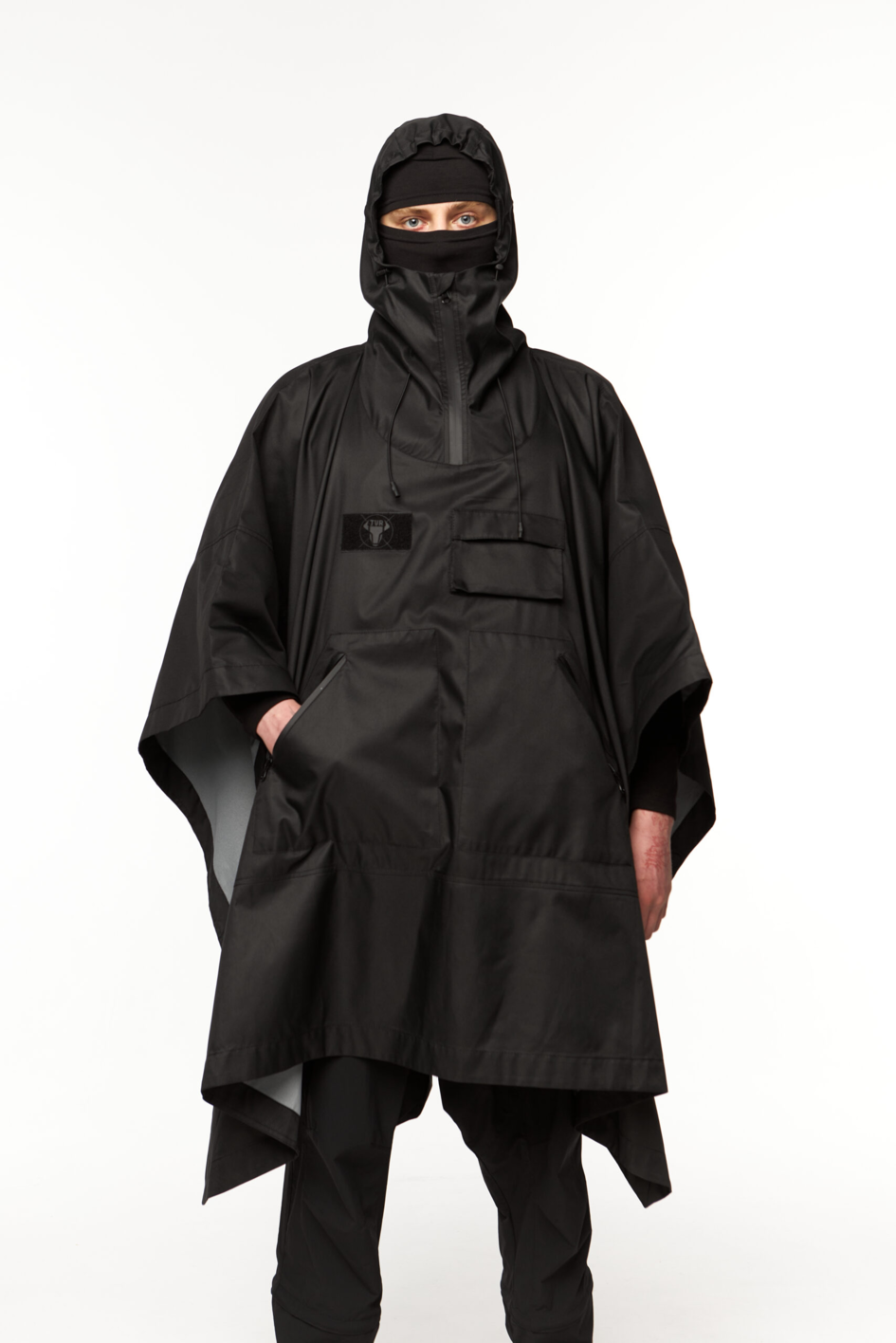 Eine aufgesetzte Tasche mit Patte, zwei große Reißverschlusstaschen (zugänglich sowohl von außen als auch von innen). Auf der rechten Seite des Produkts befindet sich ein Marken-Klettverschluss, an dem ein Patch befestigt werden kann. An den Seiten des Produkts befinden sich magnetische Verschlüsse, die „Ärmel“ bilden können, und auf der Rückseite befinden sich Belüftungsöffnungen. Der Regenponcho lässt sich in einen speziellen Beutel zusammenfalten, der mit einem Karabiner versehen ist, um ihn an anderen Produkten oder Accessoires zu befestigen.
