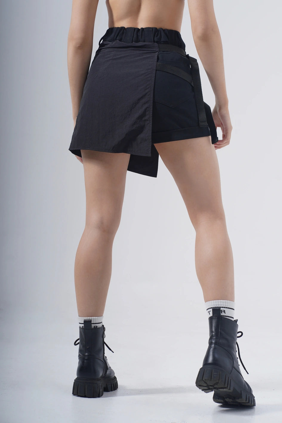 Das Modell kombiniert kurze Shorts mit einem Überwurf, der einem Rock ähnelt. Die Shorts bestehen aus leichtem, angenehm zu tragendem Baumwoll-Twill mit Stretch-Eigenschaften. Der Überwurf aus Nylonstoff verfügt über eine Cargo-Tasche mit Fastex-Klappe. Auf der anderen Seite ist das Futter mit zwei Fastex-Verschlüssen des koreanischen Herstellers Woojin Plastic befestigt. Bund mit Gürtelschlaufen und Halbring vorne links. Spiegelnde Elemente ermöglichen die perfekte Kombination der Shorts mit dem Top-Kimono 2415.